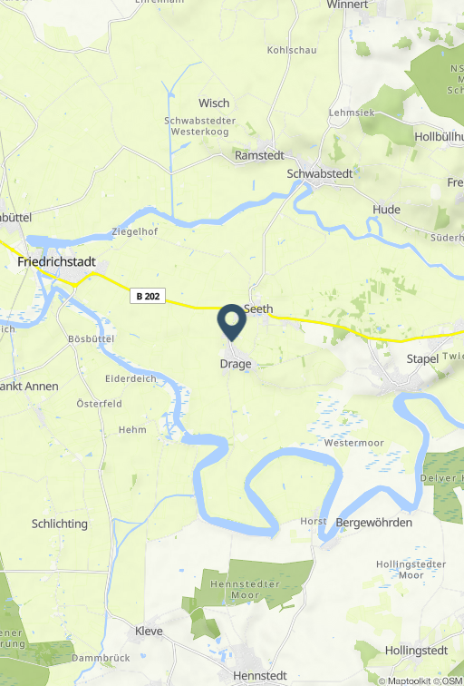 Die Ferienwohnung befindet sich in einem reetgedeckten, ehemaligen Bauernhaus auf einem 4 ha großem Grundstück mit Teichen, Streuobstwiesen, Laubmischwald sowie Gemüse- und Blumengarten. Absolut ruhige Dorfrandlage. In der Nähe befindet sich: - Bushaltestelle (0,3 km) - attraktive Flußbadestelle und Kanu-Einsetzstelle (2 km) - Angelmöglichkeiten Interessante Ausflugsziele sind über ein gut ausgeschildertes Radwegenetz zu erreichen. Drage liegt direkt am Eider-Treene-Sorge Radweg. Friedrichstadt mit seinen bezaubernen Grachten ist 6 km entfernt. Die Ferienwohnung mit seperatem Zugang liegt auf der Südseite des reetgedecktem Bauernhauses, mit Blick auf Blumengarten und Storchennest. Dielenfußboden in Wohn- und Schlafraum, Fliesen in der Küche, im Bad und im Flur. Die Ausstattung ist einfach und gemütlich mit Flachbildfernseher, Leseecke, Bücherauswahl und Sofa, dass sich für 2 zusätzliche Schlafplätze ausziehen lässt. Vollausgestattete Küche mit Essplatz. Bad mit ebenerdiger Dusche . Schlafzimmer mit Doppelbett (160cm x 200 cm). KFZ-Stellplatz im Carport. Fahrradunterstellmöglickeit. Strandkorb und Sitzplätze im Garten. Waschmaschiene und Trockner des Vermieters können nach Absprache mitbenutzt werden.