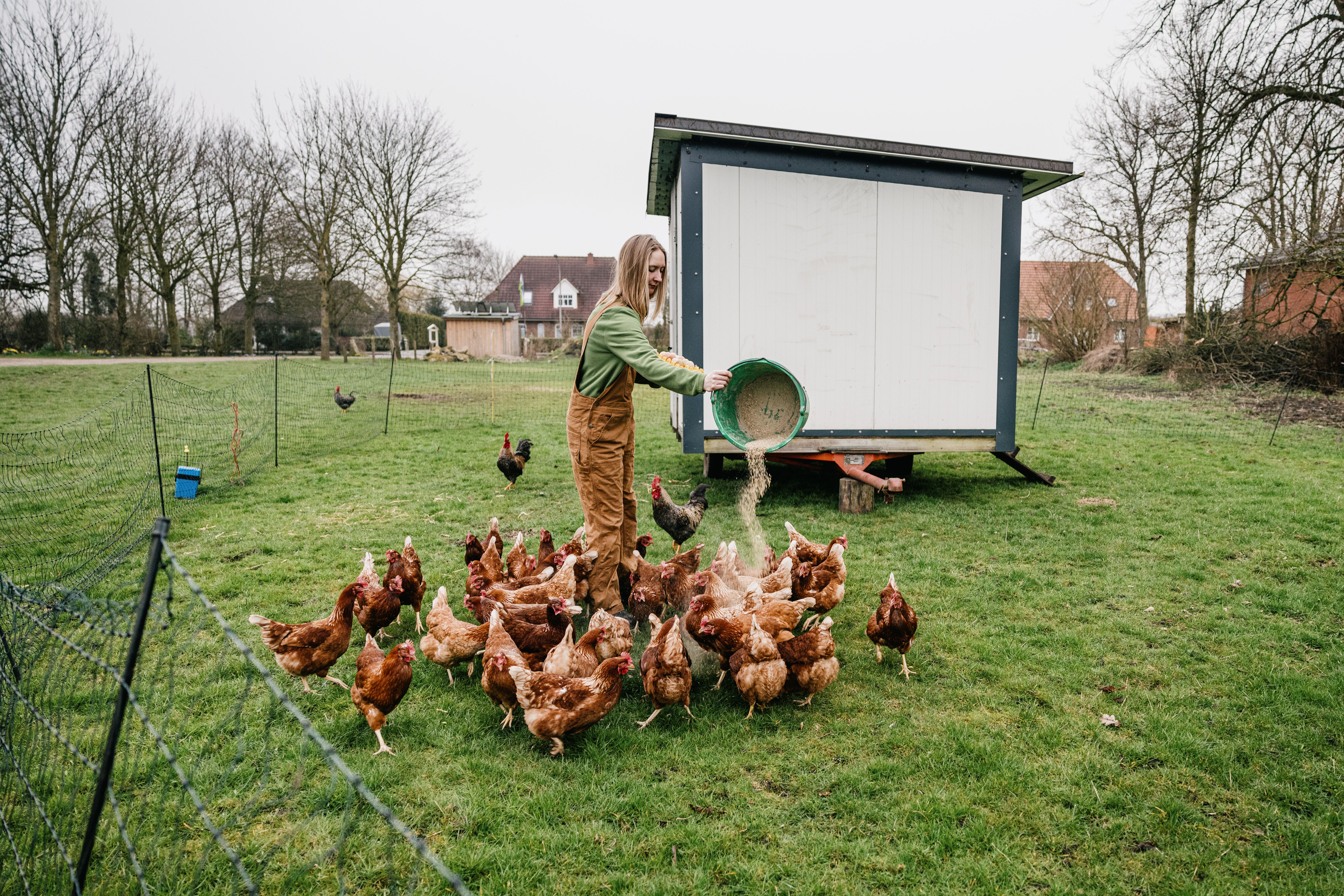 Auch die Legehennen haben jederzeit Zugang zu Auslauf, Futter und frischem Wasser. Sie können ihrem natürlichen Verhalten wie Scharren und Picken nachgehen.