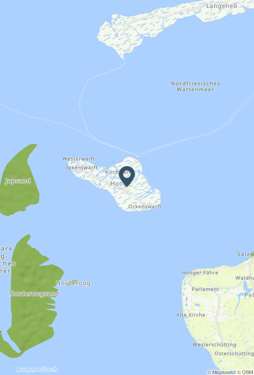 Ruhig gelegener Grünstrand mit Ausblick auf die Nachbarhallig Langeneß sowie die Inseln Föhr & Amrum - ohne Veranstaltungsrummel.