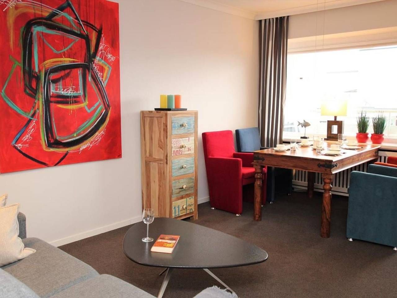 App. Hussmann Lage: Die Wohnung befindet sich in der 5. Etage eines Appartementhauses in zentraler Lage von Westerland. Zum Strand und den Fußgängerzonen ist es nicht weit. Vom Balkon kann man einen kleinen Blick auf das Meer werfen. Größe: 2-Zimmer-Appartement ca. 50 m². Für bis zu vier Personen. Ausstattung: Das Wohnzimmer ist u. a. mit einer Couch, die als Schlafsofa dienen kann, einem Sessel und dem Essplatz vor dem Fenster eingerichtet. Der große Westbalkon kann sowohl vom Wohnzimmer wie auch vom Schlafzimmer betreten werden. Im Schlafzimmer gibt es ein bequemes Doppelbett und einen großen Einbauschrank (mit TV). Die separate Küche ist mit allen notwendigen Geräten und Utensilien eingerichtet, hochwertiges Geschirr von Villeroy und Boch gehört ebenso dazu. Telefon mit Flatrate ins deutsche Festnetz vorhanden, wie ein Tivoli-Radio und CD-Player. Das Bad hat eine Dusche und einen individuellen großen Waschtisch. Ein PKW-Stellplatz auf dem Grundstück kann separat dazu gebucht werden. Nichtraucherappartement. Bitte beachten Sie die Regelung zur gesonderten Kurtaxe der jeweiligen Gemeinde auf Sylt. Diese wird gesondert berechnet und ist spätestens bei Anreise fällig. Aufgrund der positiven Rückmeldungen ist das Wäschepaket jetzt mit im Angebot enthalten. Wenn Sie keine Wäsche wünschen, bitten wir Sie, die Wäsche spätestens 48 Stunden vor Anreise explizit und schriftlich abzubestellen. Vielen Dank.