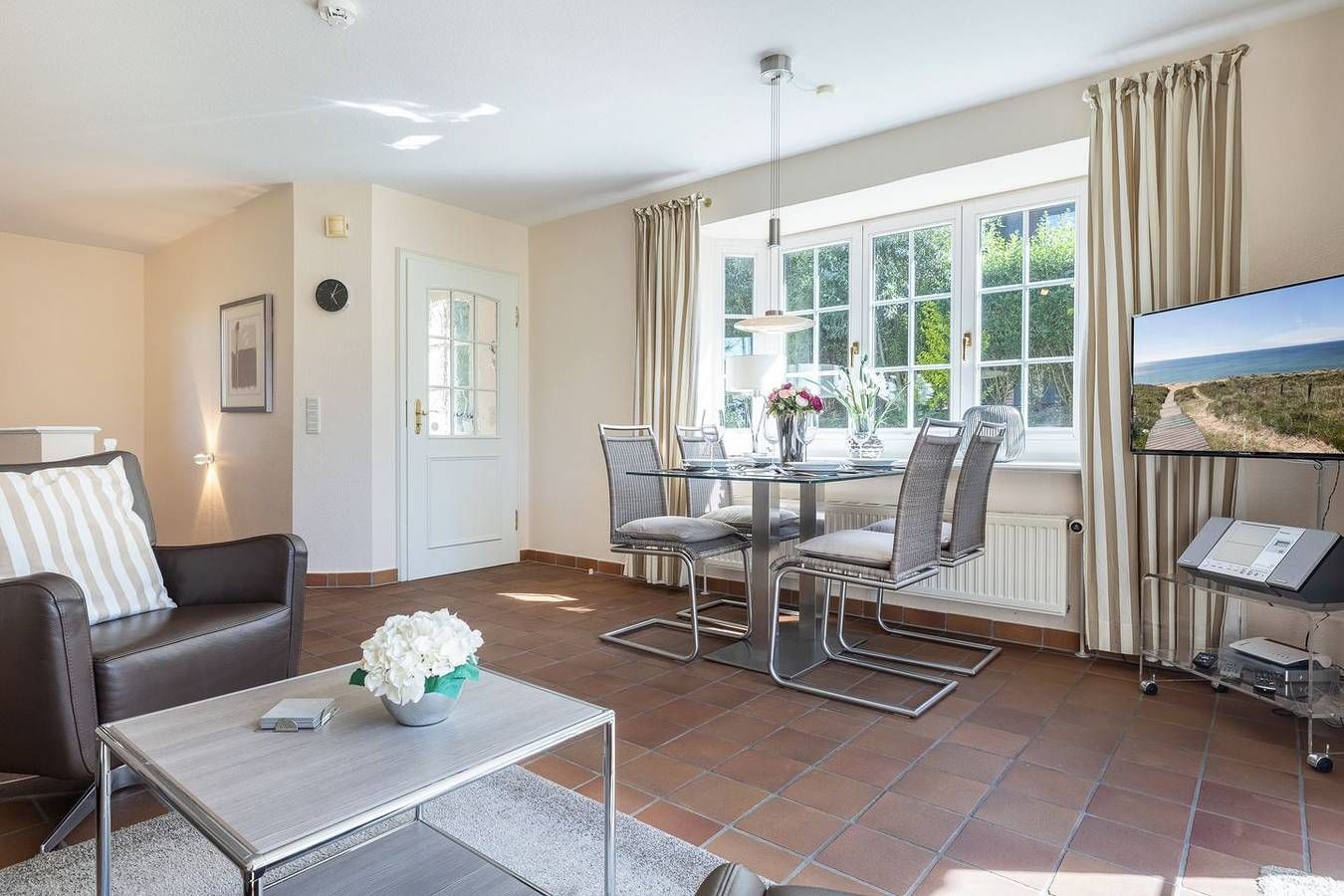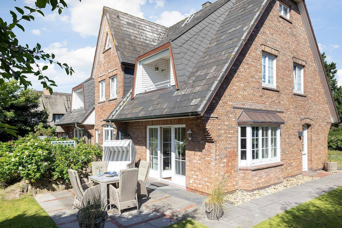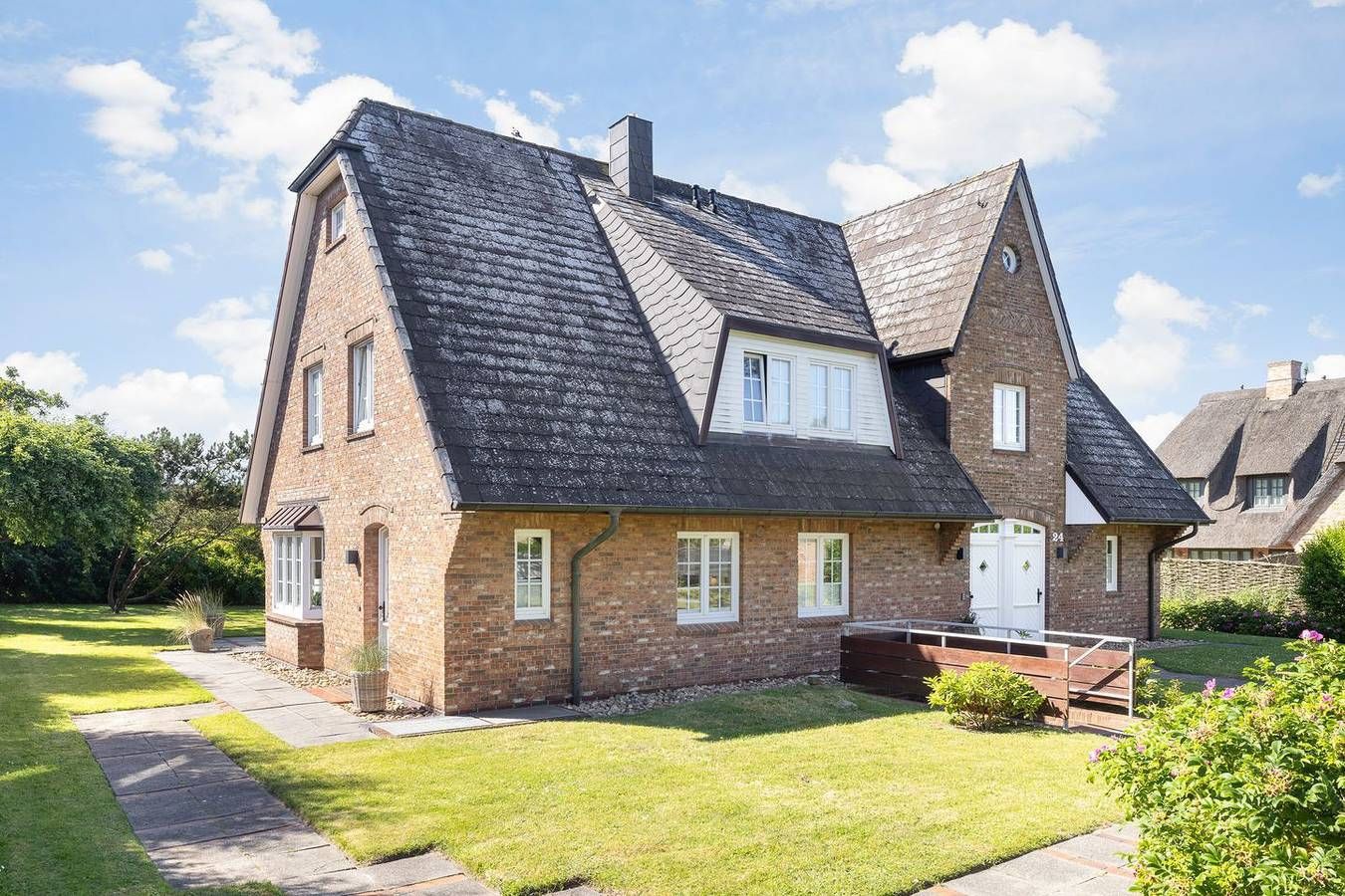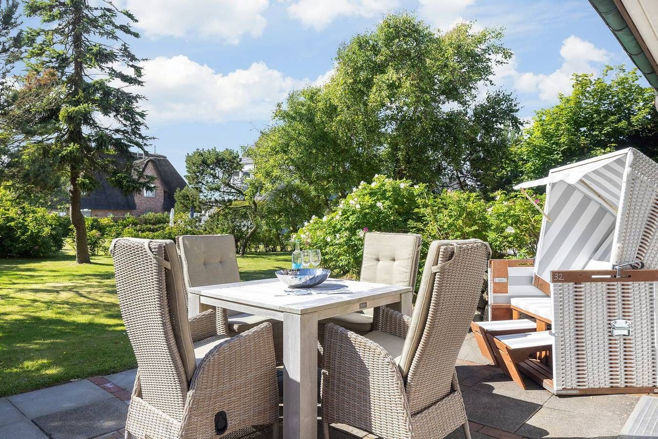 Ihr Komfort-Landhaus. Auf einem hübsch eingewachsenen, naturbelassenen Grundstück empfängt Sie das zentral, aber dennoch strandnah gelegene Landhaus Köövenhüs. Die lichtdurchfluteten und sehr großzügigen Appartements bieten Ihnen einen schönen Wohnkomfort für Ihren relaxten Urlaub. Die zum Westen ausgerichteten Terrassen und Balkone laden zum Open-Air-Verweilen ein. Strandnah gelegenes, sehr komfortables 3-Raum-Appartement im Erd- und Untergeschoss. Ca. 78qm Nutzfläche EG: Geschmackvoll eingerichteter, heller Wohnraum mit Kabel-TV und Telefon. Integrierte Küche mit Geschirrspüler und Backofen. Gäste-WC. UG: 1 Raum mit Doppelbett (Boxspringbett) (180x200cm) sowie 1 Raum mit Doppelbett (180x200cm). Dusche/WC. Sehr schöne West-Terrasse auf einem naturbelassenen Grundstück. Strandkorb (ca. von April-Oktober). Münzwaschmaschine und -Trockner im Haus. Parkplatz