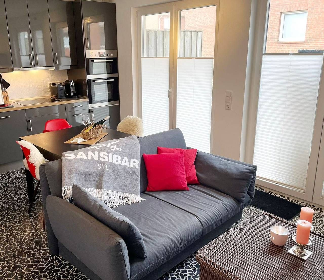 Die Unterkunft DUE/09a „Strandluft“ liegt im Dünengrund 9 in Rantum auf Sylt und vereint moderne Ausstattung mit einer attraktiven Lage in unmittelbarer Nähe zur Nordsee. Mit einer Wohnfläche von 51 m² und zwei Zimmern, darunter ein separates Schlafzimmer mit zwei Schlafmöglichkeiten, eignet sich diese Unterkunft besonders für Paare, die Wert auf Komfort, Funktionalität und eine entspannte Atmosphäre legen. Bereits beim Betreten der Unterkunft spüren Sie die hochwertige Gestaltung. Der lichtdurchflutete Wohnbereich ist modern eingerichtet und wird durch eine offene Küche ergänzt, die zum gemütlichen Kochen und gemeinsamen Verweilen einlädt. Die Küche ist zum Wohnzimmer hin offen gestaltet und mit einer Vielzahl an modernen Geräten ausgestattet: Ihnen stehen eine Spülmaschine, ein 4-Platten-Herd, Backofen, Kühlschrank und ein separater Gefrierschrank zur Verfügung. Ebenso finden Sie hier eine Nespresso-Espressomaschine, klassische Kaffeemaschine, Wasserkocher, Toaster, Mixer, Eierkocher sowie Gewürze und umfassendes Koch- und Essgeschirr vor. So gelingen sowohl ein ausgiebiges Frühstück als auch aufwendige Abendessen mühelos. Der Wohnraum bietet Ihnen neben einer gemütlichen Sitzecke zahlreiche Unterhaltungsmöglichkeiten: Für Ihre Unterhaltung steht ein Flachbild-TV, Blu-ray-, DVD- und CD-Player, ein Radio sowie eine HiFi-Anlage bereit. Im Bücherregal finden Sie eine Auswahl an Büchern. Das Badezimmer ist modern ausgestattet und verfügt über eine Dusche, ein WC sowie einen Haartrockner. Für zusätzlichen Komfort sorgen eine eigene Waschmaschine und ein Trockner, sodass auch längere Aufenthalte problemlos möglich sind. Die Fußbodenheizung trägt zu einem durchgängig behaglichen Raumklima bei. Ein besonderes Highlight der Unterkunft ist die großzügige, möblierte Terrasse, auf der Sie – geschützt und mit Blick ins Grüne – die frische Nordseeluft genießen können. Zur Ausstattung zählen Gartenmöbel sowie ein privater Strandkorb, der zu entspannten Stunden einlädt. Durch die Lage im Parterre sowie die Bereitstellung eines eigenen Privatparkplatzes ist sowohl das Ankommen als auch das tägliche Leben äußerst komfortabel gestaltet. Internet (WLAN) steht Ihnen selbstverständlich zur Verfügung. Auch Haustiere sind willkommen; es darf maximal ein Haustier mitgebracht werden. Die Nichtraucher-Unterkunft befindet sich nur ca. 100 Meter vom Meer und dem Strand entfernt – ideale Voraussetzungen für erholsame Tage am und im Wasser. Einkaufsmöglichkeiten erreichen Sie nach etwa 1.4 km, Restaurants befinden sich in ca. 300 Metern Entfernung. Der Bahnhof liegt rund 6.3 km entfernt, die Stadt Westerland erreichen Sie nach etwa 6.5 km. Sichern Sie sich Ihren Aufenthalt in dieser ansprechenden Unterkunft in Rantum.