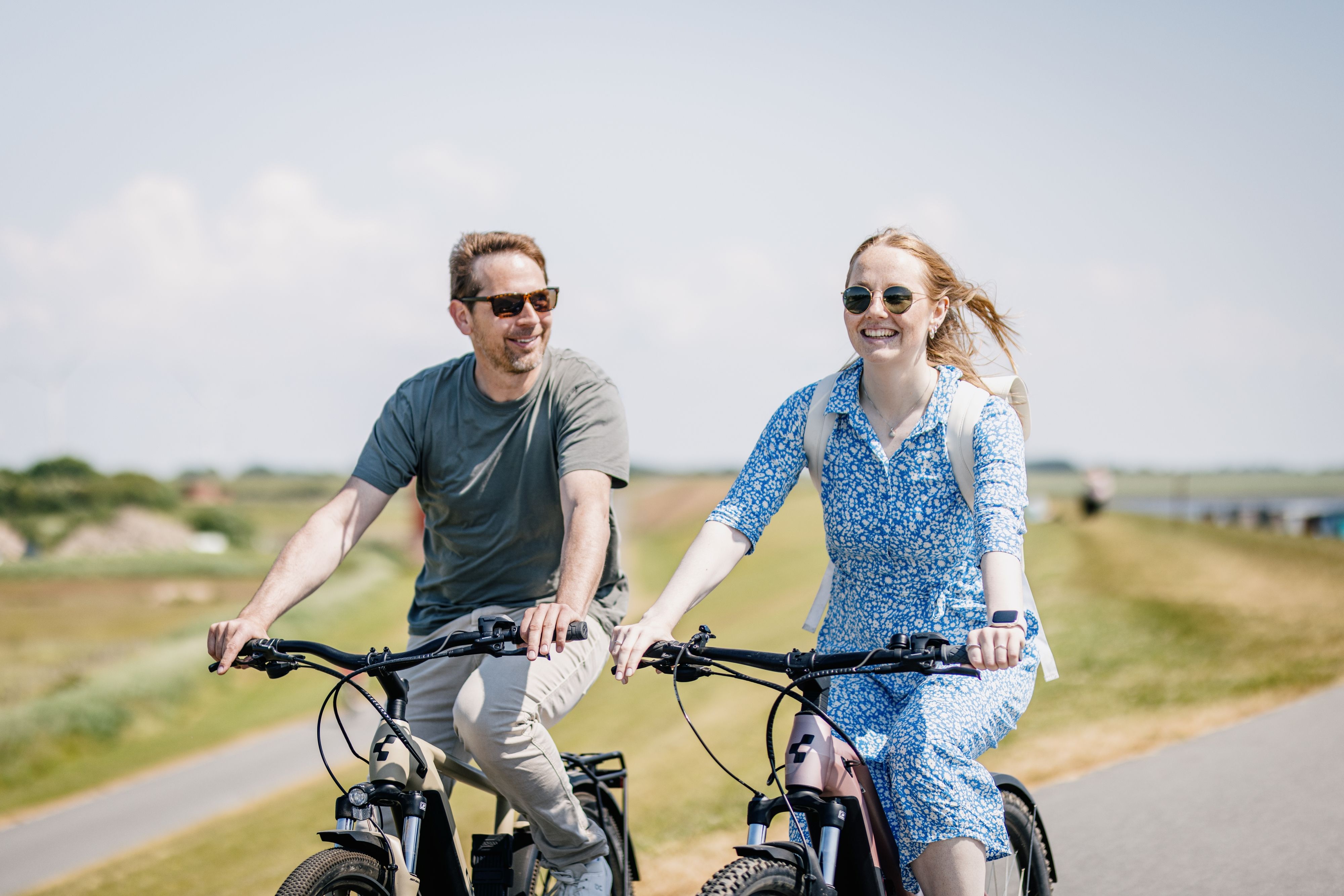 Mit dem Rad die Nordseeinsel Pellworm erkunden. Die Auswahl an Rädern bei Momme von Holdt ist groß. Von E-bikes über Lastenräder, Tandems, Tourenräder und weitere Optionen, können auch Fahrradzubehör wie Anhänger und Kindersitze gemietet werden.