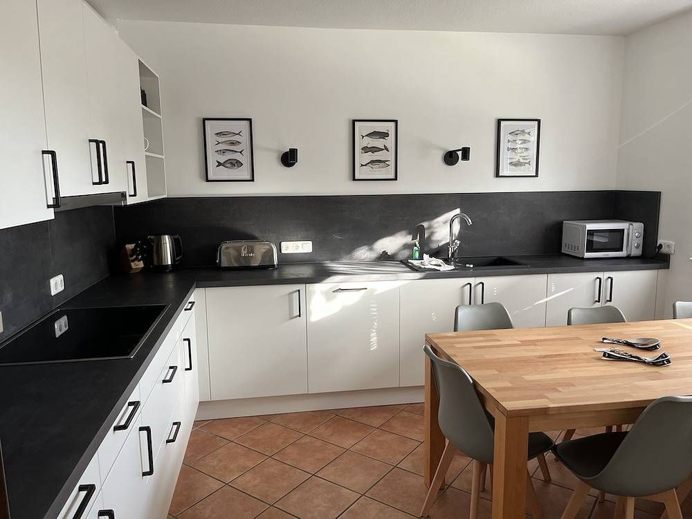 Die Ferienwohnung Klipper im Erdgeschoss des Hauses Fischerman’s Friend in Wittdün auf Amrum ist eine 4 Zimmer Wohnung, ca 110 qm mit Schlafmöglichkeiten für 2 - 6 Personen. Diese schöne Wohnung ist eine Oase der Ruhe. Sie wurde 2023 komplett renoviert. Sie liegt in einer ruhigen Seitenstrasse am Ende einer Sackgasse mit Blick auf die Dünen. Die weitläufigen Sanddünen und die unberührte Natur schaffen eine Atmosphäre der Ruhe und Gelassenheit. Ein großes Wohnzimmer mit TV, Sofa, Couchtisch und zusätzlichem Esstisch für 6 Personen ist vorhanden. - eigene Terrasse: mit Sitzgelegenheiten für 6 Personen (von April bis Oktober) - Waschmaschine in der Wohnung - separate Küche: neue Küche mit Induktionsherd, Mikrowelle, Hochschrankbackofen, Nespressomaschine, Kaffeemaschine, Toaster, Esstisch für 6 Personen, Gefriertruhe, Spülmaschine Schlafzimmer 1: Doppelbett 2m x 2m, ein Schrank Schlafzimmer 2: zwei Einzelbetten 1m x 2m (stehen zusammen) ein Schrank Schlafzimmer 3: zwei Einzelbetten 0,90m x 2m, ein Schrank Bad: mit Badewanne und Dusche mit flachem Duschbecken Gäste WC