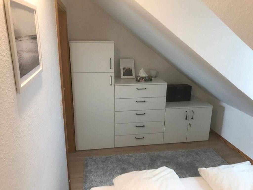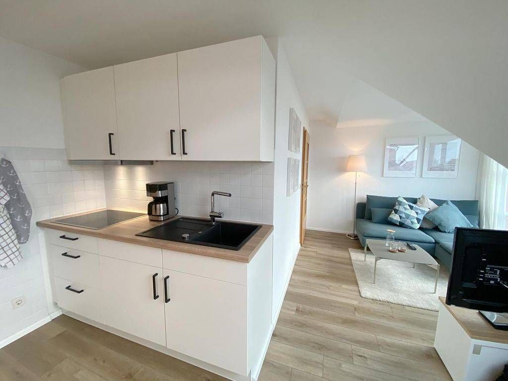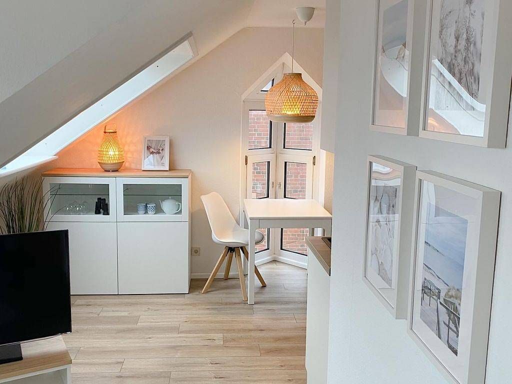 Das "Ferienhaus Karin" mit 6 Ferienwohnungen liegt auf der Südspitze der Insel Amrum in autofreier Zone. Nur wenige Schritte vom Haus entfernt verläuft die Promenade "Obere Wandelbahn", von dort haben Sie direkten Zugang zum Badestrand Kniepsand und den Bohlenwegen durch die Dünenlandschaft. Die Einkaufsmöglichkeiten, Restaurants, Cafés, Bushaltestelle und Fähranleger sind etwa 400m entfernt. Das Ferienhaus Karin ist ein Nichtraucherhaus. Münzwaschmaschine/-trockner stehen im Haus zur gemeinschaftlichen Nutzung. Das Wohngebiet Südspitze ist autofrei, zum Be- und Entladen darf zum Haus gefahren werden. Pkw-Stellplatz steht auf dem vorgelagerten Südspitzenparkplatz zur Verfügung. Schauen Sie vorbei und genießen Sie Ihren Aufenthalt in modernem Inselambiente in unmittelbarer Nähe zu einem der breitesten und feinsten Sandstrände Europas. Der Kniepsandblick befindet sich im 2. Obergeschoss - sehr starke Dachschräge! auf 30qm Wohnfläche Es ist eine 2-Raum-Nichtraucher-Wohnung für 2 Personen mit Balkon und Blick auf den Kniepsand und die Nordsee, Wohnzimmer, Küche und Schlafzimmer wurden 2021 renoviert. Wohnzimmer mit Sofa, Sessel, Smart-TV, Stereoanlage und Zugang zum Balkon Balkon mit Tisch und Stühle Es gibt einen Essbereich mit Tisch und 2 Stühlen, Küchenzeile mit 4-Platten-Cerankochfeld, Kühlschrank u.a. Schlafzimmer mit Ehebett 160x200 (Boxspringbett), Einbaukleiderschrank mit Kommode. Fußbodenbelag in Flur, Wohnzimmer und Schlafzimmer: Vinyl-Parkett. Bad mit Dusche, WC und Waschbecken, Föhn, Fußbodenbelag: Fliesen.