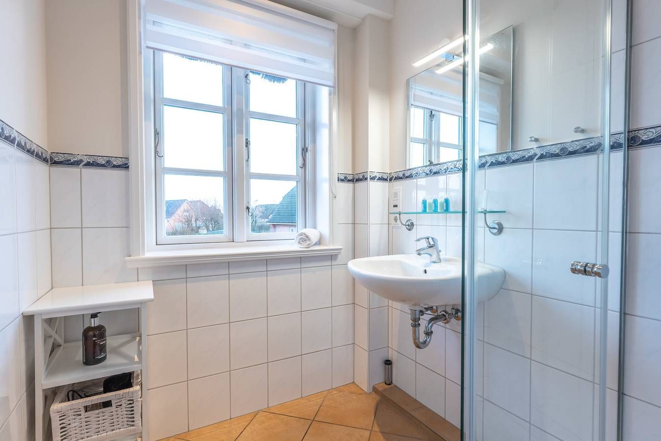 Die Wohnung Osterley (ca. 55 qm) für 4 Personen befindet sich im Obergeschoss unseres Reetdachhauses. In dieser, gemütlich im nordischen Landhausstil eingerichteten Ferienwohnung steht Ihnen ein heller geräumiger Wohn- und Essbereich mit integrierter Küchenzeile zur Verfügung. Hier können Sie nach Herzenslust gemütliche Abende vor dem Kamin genießen und einfach mal die Seele baumeln lassen. Die zwei Schlafzimmer mit jeweils einem Doppelbett (Liegefläche 180×200, oder einzeln gestellt jeweils 90×200) laden zum Schmökern und Träumen ein. Das Bad mit Dusche und WC ist hell und lichtdurchflutet und zusätzlich mit einer Fußbodenheizung ausgestattet. Alle Wohnbereiche sind mit Echtholzparkett, das Bad und der Küchenbereich mit Terrakottafliesen ausgelegt. Im großen Garten mit Liegewiese und verschiedene lauschige Sitzplätze laden zum Entspannen ein. Für unsere kleinen Gäste stehen einige kleinere Spielgeräte bereit. Ausstattung Wohnzimmer: Kaminofen, Fernseher (Sat-TV), Radio-CD-Player, WLAN Küchen: Geschirrspüler, Backofen mit Ceranfeld, Kühlschrank mit 3-Sterne-Gefrierfach, Kaffeemaschine, Wasserkocher, Toaster Bad: Föhn. Auf dem westlichen Teil der Nordseeinsel Föhr im ruhigen, beschaulichen Dörfchen Utersum befindet sich unser Landhaus am Meer direkt am alten Dorfkern. Der familienfreundliche Strand mit seinem wunderbaren Blick auf die Schwesterinseln Sylt und Amrum befindet sich nur ca. 500 m von unserem Haus entfernt. Waschmaschine und Trockner stehen Ihnen im separaten Hauswirtschaftsraum gegen Gebühr zur Verfügung.