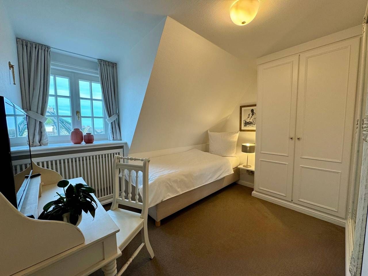 Kurzbeschreibung: Das Haus erstreckt sich auf zwei Etagen unter Reet und befindet sich in unmittelbarer Nähe zum Weststrand mit einzigartigen Sichtachsen auf die Nordsee und das Wattenmeer. Die Hausscheibe ist nur 150m vom Weststrand entfernt und erreichbar binnen 2min. Lagebeschreibung: Hier in Rantum rücken Watt und Westküste ganz eng zusammen. Genießen Sie hier den 12 Kilometer langen Sandstrand. Und was ist zwischen den Meeren? - Eine malerische und weite Landschaft mit urwüchsigen Dünen, die eins werden mit den inseltypischen Reetdachhäusern. Natürlich ist Rantum auch die Heimat der Sansibar. Einen Besuch in dem Restaurant lohnt sich sehr, besonders um viele bekannte Gesichter Sylts kennenzulernen. Doch auch Wassersportler können sich in Rantum auf viele Möglichkeiten freuen... Legen Sie hier gern Ihre ersten Meter auf dem Surfbrett oder am Kite zurück. Ausstattungen: Die helle und einladende Hausscheibe mit Ost- und Südwestterrasse mit Strandkorb sowie eigener Sonnenkuhle freuen sich, Ihnen einen tollen Urlaub zu ermöglichen. Sie betreten das Haus über das Erdgeschoss in die Diele mit separater Gästetoilette. Das Wohnzimmer mit angeschlossener Südwestterrasse enthält modernste Ausstattung, bestehend aus bequemen Sitzmöbeln, Flachbildfernseher und einem ausgewählten Büchersortiment für gemütliche Stunden. Die mit Sylter Rosen umwachsene Südwestterrasse bietet einen großen Strandkorb mit Tisch und Stühlen. Die Küche im Erdgeschoss bietet eine umfassende Ausstattung: Backofen, 4-Zonen Kochfeld, Natursteinarbeitsplatte, Geschirrspüler, Miele Waschmaschine mit integriertem Trockner und diversen Kleingeräten, wie Filterkaffeemaschine, Nespresso, Toaster und Mikrowelle. Im hyggeligen Obergeschoss mit Dachschrägen befinden sich ein Schlafzimmer mit Boxspring-Doppelbett (1,80x2,00m) mit Blick auf das Wattenmeer und ein zweites Schlafzimmer mit Blick auf die Nordsee und einem Boxspring-Einzelbett (0,90x2,00). Beide Schlafzimmer sind mit Flachbildfernsehern ausgestattet. Das Badezimmer im Obergeschoss mit Nordseeblick ist mit Marmorwaschtisch, Dusche, Föhn, Handtuchtrockner und Toilette ausgestattet. Allgemeine Informationen: Anreise ab 16:00 Uhr Abreise bis 11:00 Uhr Nach der Buchung stehen Ihnen zusätzlich die Zahlungsmöglichkeiten Banküberweisung, Kreditkarte, Sofortüberweisung und Google/Apple Pay zur Verfügung. Weitere Informationen entnehmen Sie bitte Ihrer Buchungsbestätigung.
