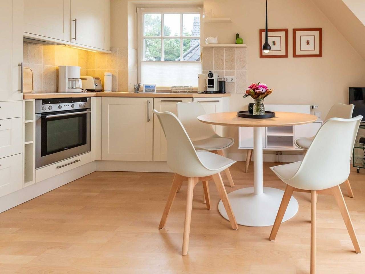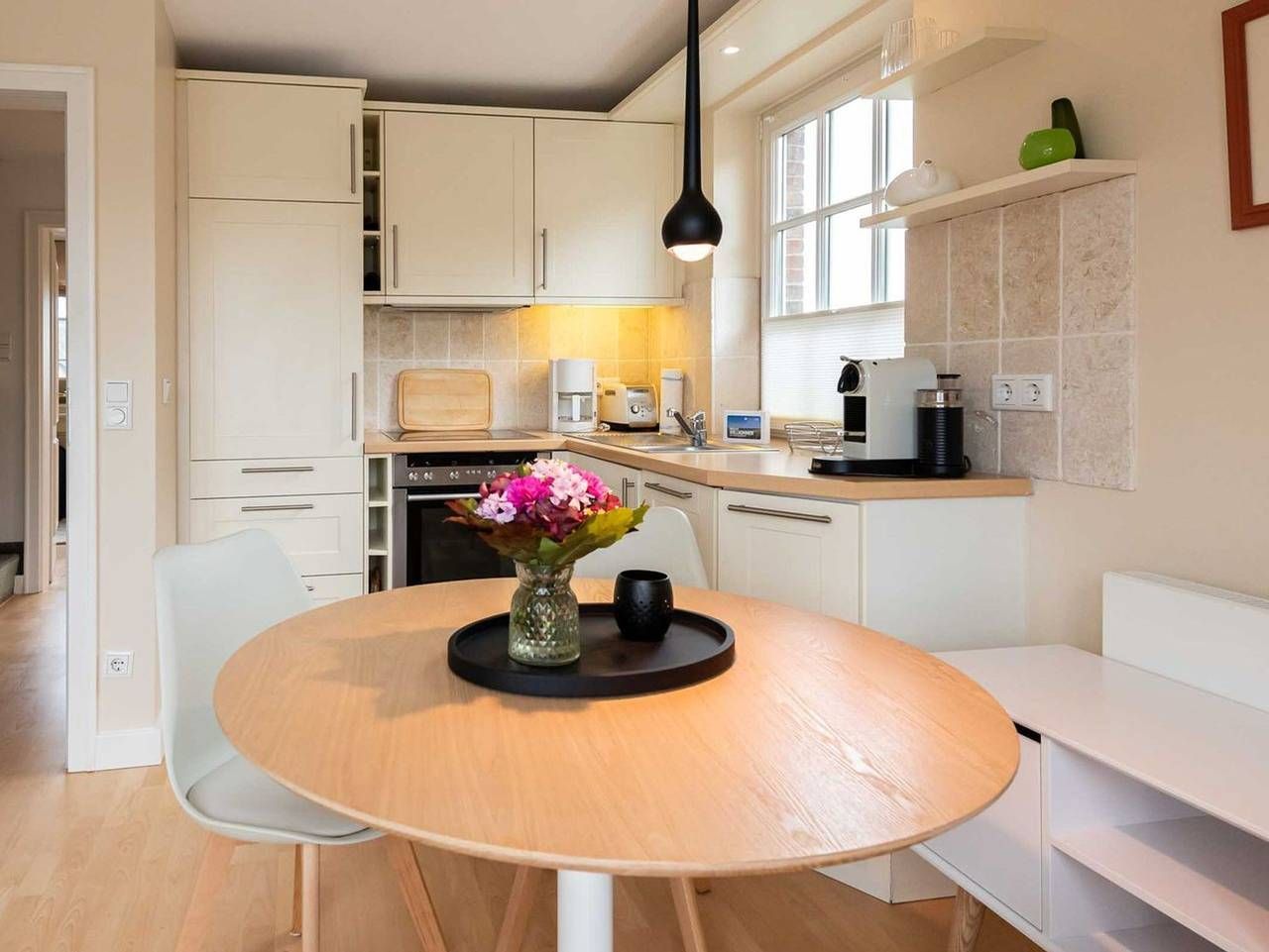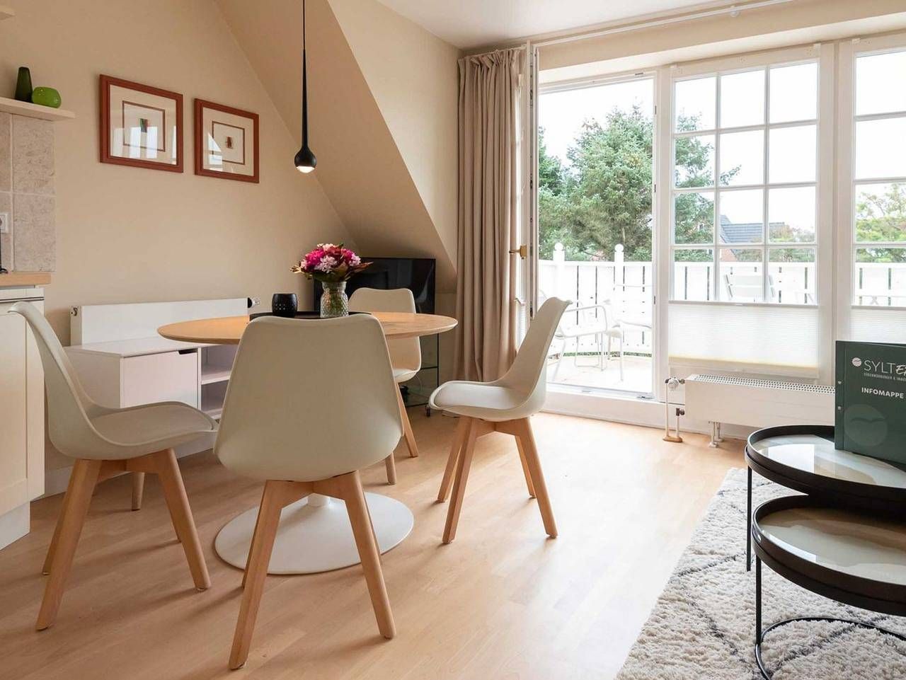 Lichtdurchflutete 3-Zimmer Ferienwohnung in ruhiger Lage am Dorfteich mit ca. 54 m² Wohnfläche, für bis zu 3 Personen. Dieses helle und gemütliche Feriendomizil im Landhausstil erstreckt sich über drei Etagen und eignet sich hervorragend für zwei Erwachsene und ein Kind. Im Erdgeschoss gelangen Sie durch die Haus- und Wohnungstür in einen kleinen Flur mit Schuhschrank und Garderobe. Über eine gut begehbare Treppe mit Treppengeländer gelangen Sie in das erste Obergeschoss. Im lichtdurchfluteten Obergeschoss befindet sich eine offene und gut ausgestattete Küche, die direkt an einen komfortablen Wohn- und Essbereich angrenzt: Gemütliches Sofa mit Sessel, TV und fließendem Übergang zum einladenden Essbereich vor bodentiefen Fenstern. Über eine Balkontür gelangen Sie vom Wohnzimmer aus auf den möblierten und großzügigen Süd-Balkon, der Platz für vier Personen bietet. Schlafzimmer 1: Einzelbett, Einbauschrank und Fenster. Bei diesem Bett handelt es sich um ein Ausziehbett. Auf Anfrage kann hier eine vierte Person, idealerweise ein Kind, auf einer zweiten Ebene vor dem Bett schlafen. Badezimmer: Helles Bad mit Fußbodenheizung, Dusche, Handtuchtrockner und Fenster. Eine weitere gut begehbare mit Treppengeländer führt in das offene Dachgeschoss mit großem Giebel- und Dachfenster: Schlafzimmer 2: Doppelbett, Einbauschränke und TV. Abstellkammer mit Waschmaschine und Raum für Gepäckstücke. Besonderheit: Es steht Ihnen eine E-Ladestation für Ihr Elektroauto an der Ferienwohnung zur Verfügung. Vor dem Haus befinden sich auf dem Grundstück und in den Boden einbetonierte Fahrradbügel, die ein Abstellen von Fahrrädern ermöglichen. Lage: Die Wohnung liegt in ruhiger Lage, in unmittelbarer Nähe des Wenningstedter Dorfteiches. Diverse Restaurants und Einkaufsmöglichkeiten befinden sich in naher Umgebung und sind zu Fuß oder mit dem Fahrrad gut erreichbar. Haustiere: max. 1 kleiner Hund bis 35 cm Rückenhöhe erlaubt (kostenpflichtig) Nichtraucherwohnung Parkplatz: Ja