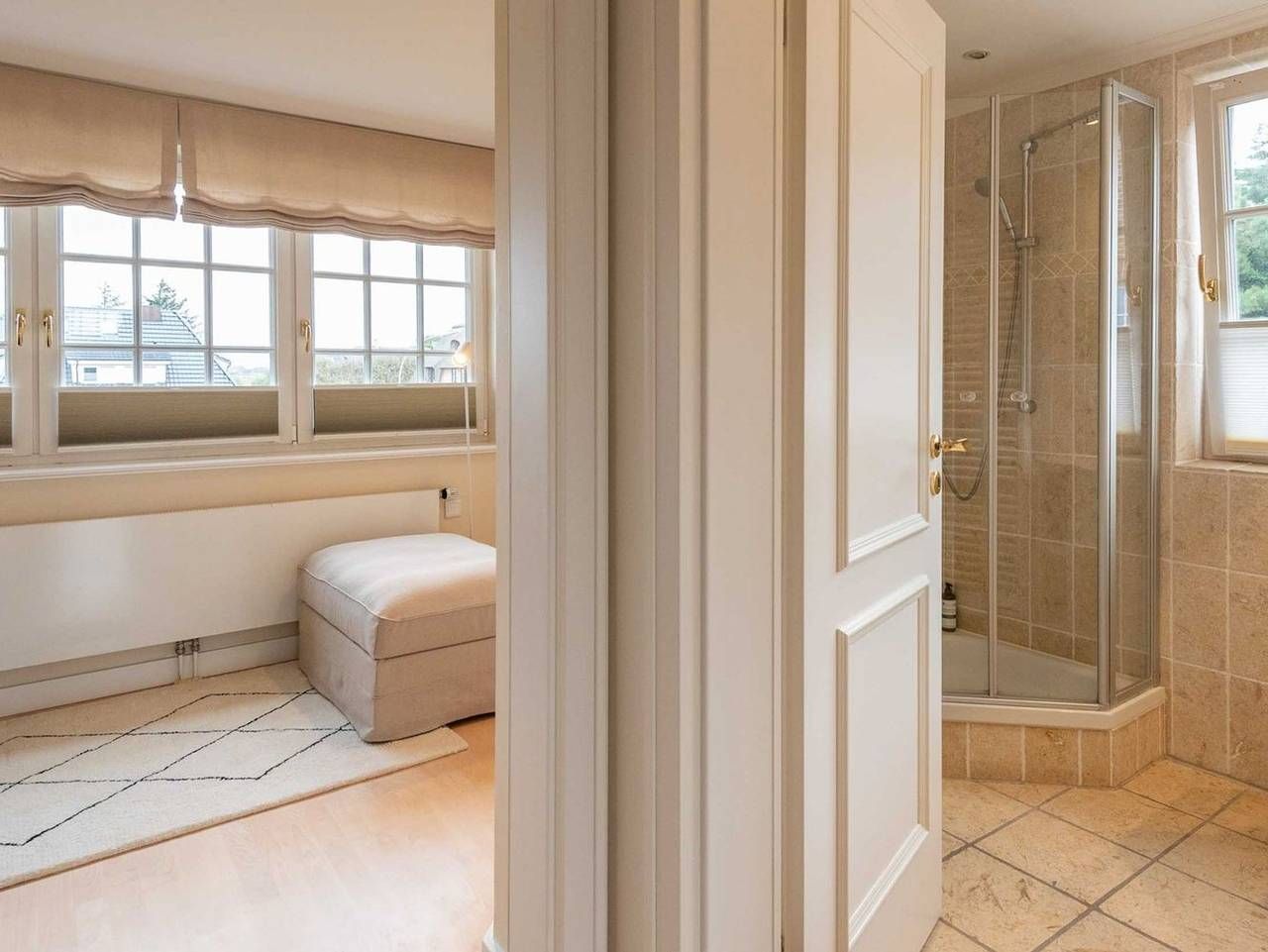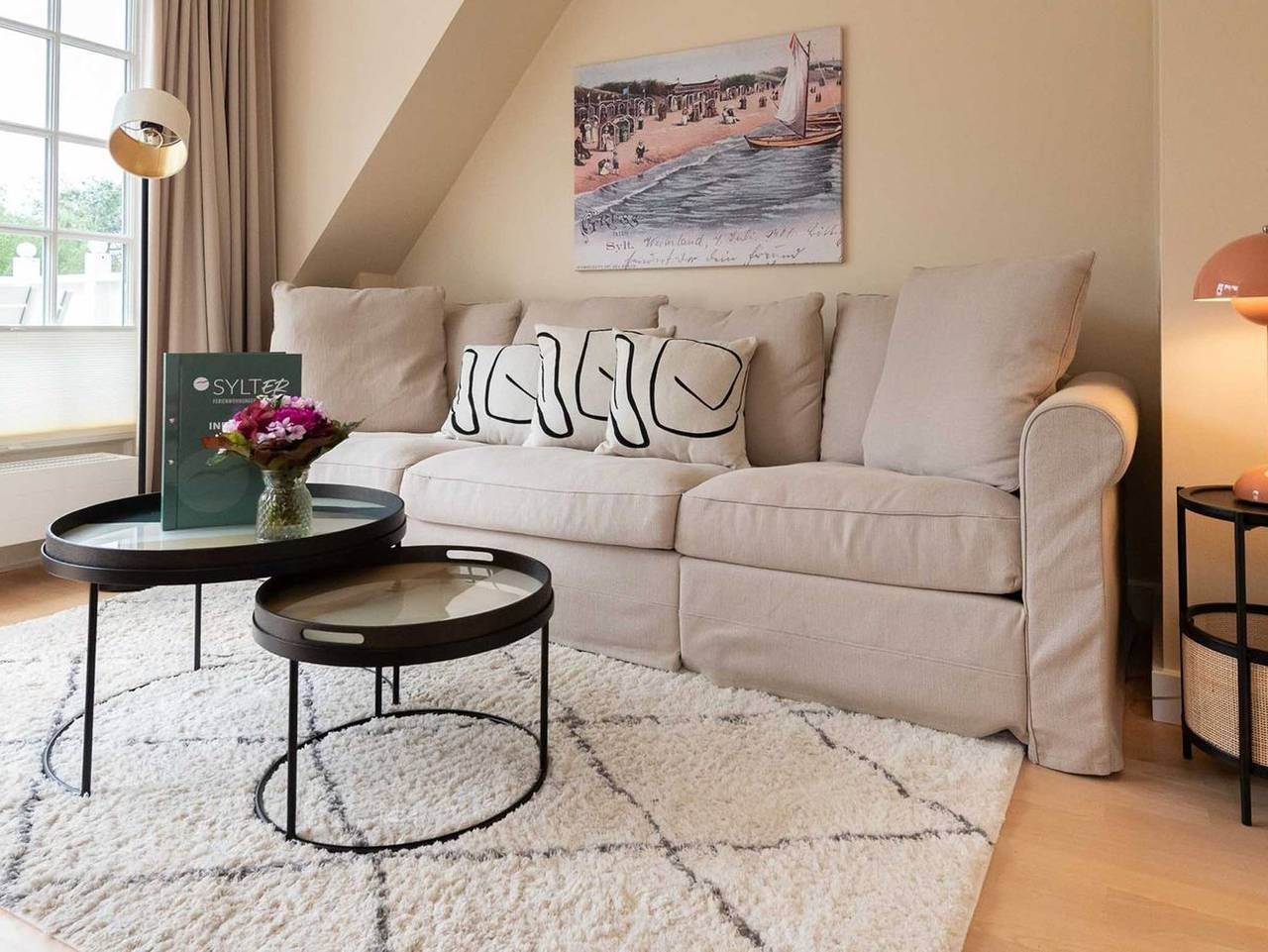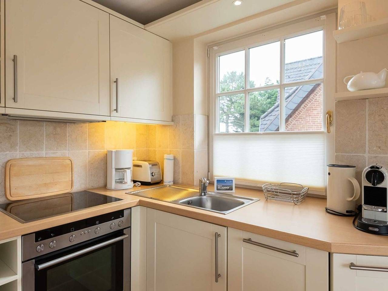 Lichtdurchflutete 3-Zimmer Ferienwohnung in ruhiger Lage am Dorfteich mit ca. 54 m² Wohnfläche, für bis zu 3 Personen. Dieses helle und gemütliche Feriendomizil im Landhausstil erstreckt sich über drei Etagen und eignet sich hervorragend für zwei Erwachsene und ein Kind. Im Erdgeschoss gelangen Sie durch die Haus- und Wohnungstür in einen kleinen Flur mit Schuhschrank und Garderobe. Über eine gut begehbare Treppe mit Treppengeländer gelangen Sie in das erste Obergeschoss. Im lichtdurchfluteten Obergeschoss befindet sich eine offene und gut ausgestattete Küche, die direkt an einen komfortablen Wohn- und Essbereich angrenzt: Gemütliches Sofa mit Sessel, TV und fließendem Übergang zum einladenden Essbereich vor bodentiefen Fenstern. Über eine Balkontür gelangen Sie vom Wohnzimmer aus auf den möblierten und großzügigen Süd-Balkon, der Platz für vier Personen bietet. Schlafzimmer 1: Einzelbett, Einbauschrank und Fenster. Bei diesem Bett handelt es sich um ein Ausziehbett. Auf Anfrage kann hier eine vierte Person, idealerweise ein Kind, auf einer zweiten Ebene vor dem Bett schlafen. Badezimmer: Helles Bad mit Fußbodenheizung, Dusche, Handtuchtrockner und Fenster. Eine weitere gut begehbare mit Treppengeländer führt in das offene Dachgeschoss mit großem Giebel- und Dachfenster: Schlafzimmer 2: Doppelbett, Einbauschränke und TV. Abstellkammer mit Waschmaschine und Raum für Gepäckstücke. Besonderheit: Es steht Ihnen eine E-Ladestation für Ihr Elektroauto an der Ferienwohnung zur Verfügung. Vor dem Haus befinden sich auf dem Grundstück und in den Boden einbetonierte Fahrradbügel, die ein Abstellen von Fahrrädern ermöglichen. Lage: Die Wohnung liegt in ruhiger Lage, in unmittelbarer Nähe des Wenningstedter Dorfteiches. Diverse Restaurants und Einkaufsmöglichkeiten befinden sich in naher Umgebung und sind zu Fuß oder mit dem Fahrrad gut erreichbar. Haustiere: max. 1 kleiner Hund bis 35 cm Rückenhöhe erlaubt (kostenpflichtig) Nichtraucherwohnung Parkplatz: Ja
