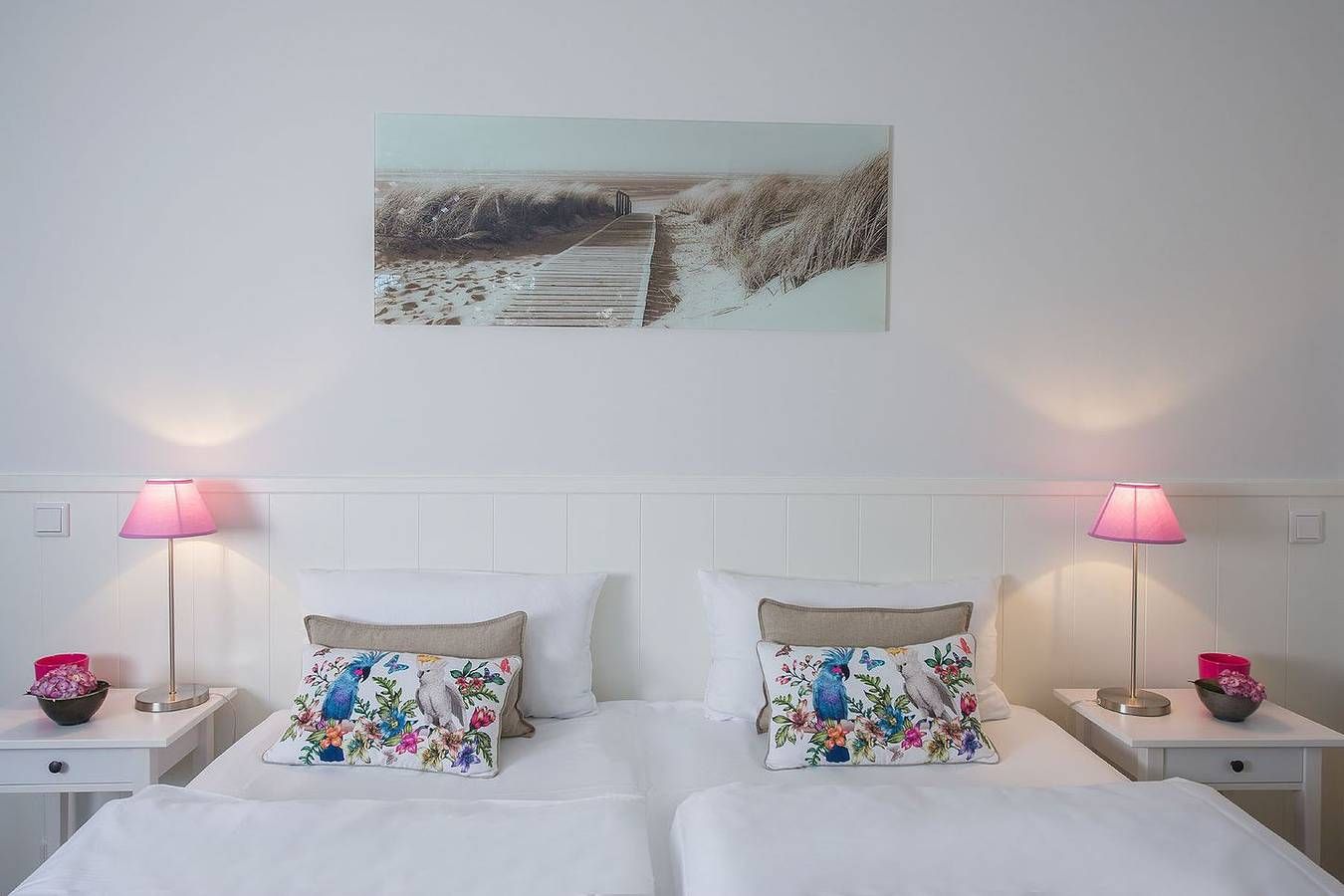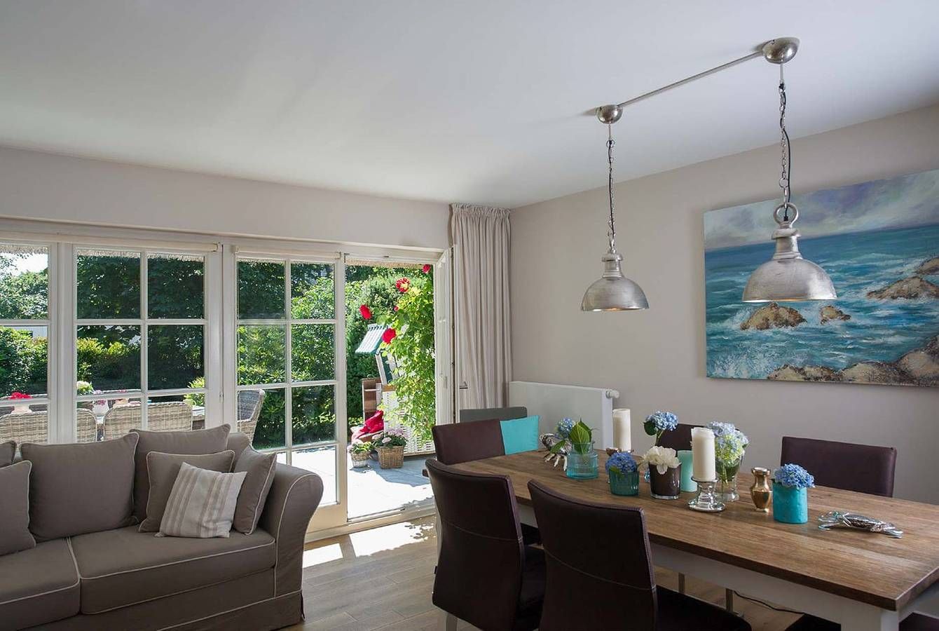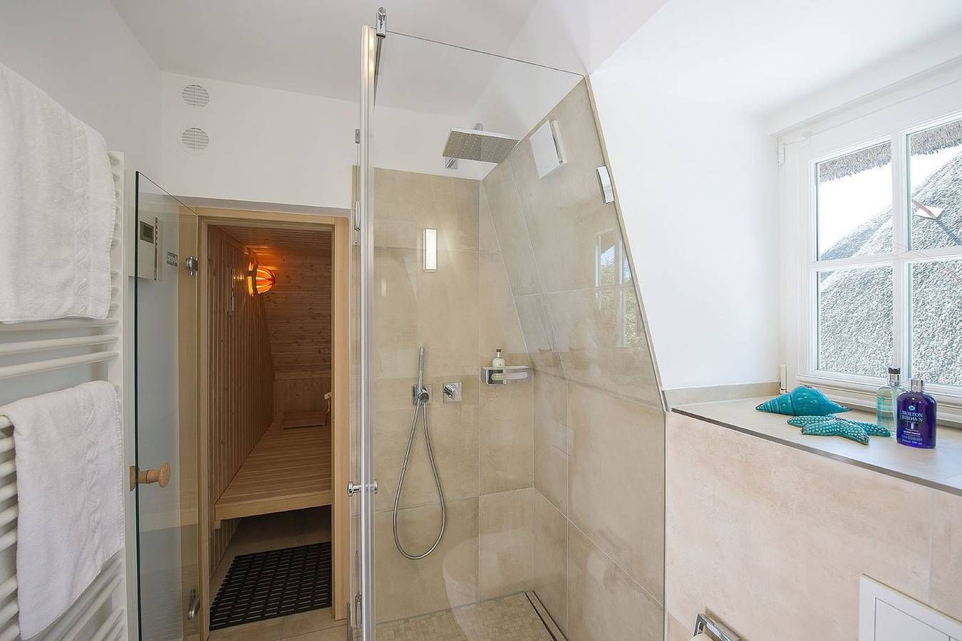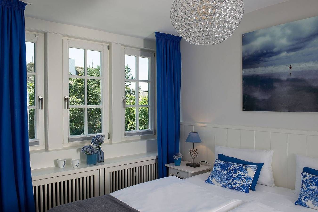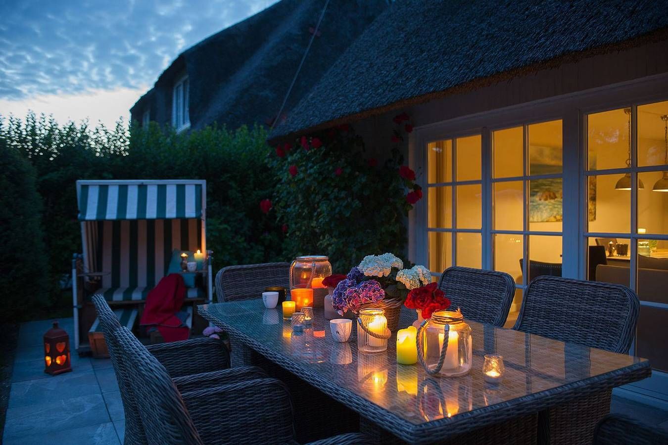 FRIESISCH . STRANDFARBIG . UNTER REET Das exklusive 5-Sterne Ferien Domizil im Lörkiwai 7 in Keitum bietet auf zwei Ebenen und 100 m² ausreichend Platz für maximal vier Personen. Große Fensterfronten im luftigen Wohnbereich mit großem Esstisch und gemütlicher Couch öffnen die Wohnung hin zu den Sonnenplätzen auf der Terrasse und dem 250 m² großen, eingewachsenen Garten. Die schönsten Farben, die der Sommer auf der Insel zu bieten hat, bereiten einen warmen Empfang im Eingangsbereich. Angesichts der maritimen Bildmotive verfällt man unwillkürlich in Strandlaune. Warme Beigetöne wurden im Wohnbereich und in den Schlafräumen im Obergeschoss mit angenehmen Pastelltönen wie Rosa und Mint bis hin zu kraftvollen Farben wie Türkis und Kornblumenblau kombiniert. Dadurch entsteht eine behagliche Wohnatmosphäre. Zwei moderne Bäder, eines davon mit integrierter Sauna, bieten Wellnessvergnügen und Komfort. Am Abend oder an kühleren Tagen findet man vor dem Kamin einen schönen Platz zur Entspannung bei einem guten Essen oder anregenden Gesprächen. Das Ferien Domizil Lörkiwai 7 liegt in unmittelbarer Nähe zum Benen-Diken-Hof und ist aufgrund seiner besonderen Lage ein idealer Ausgangspunkt, um das ursprüngliche und das moderne Keitum samt seiner Flaniermeile zu erkunden. Auf Anfrage ist das Ferien Domizil auch für 6 Personen buchbar.
