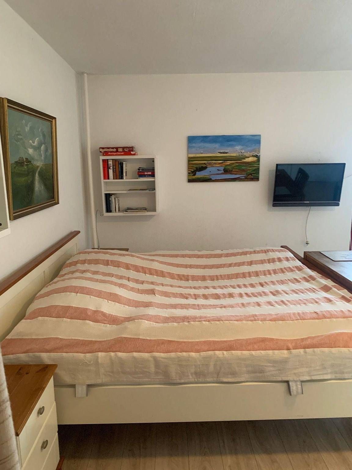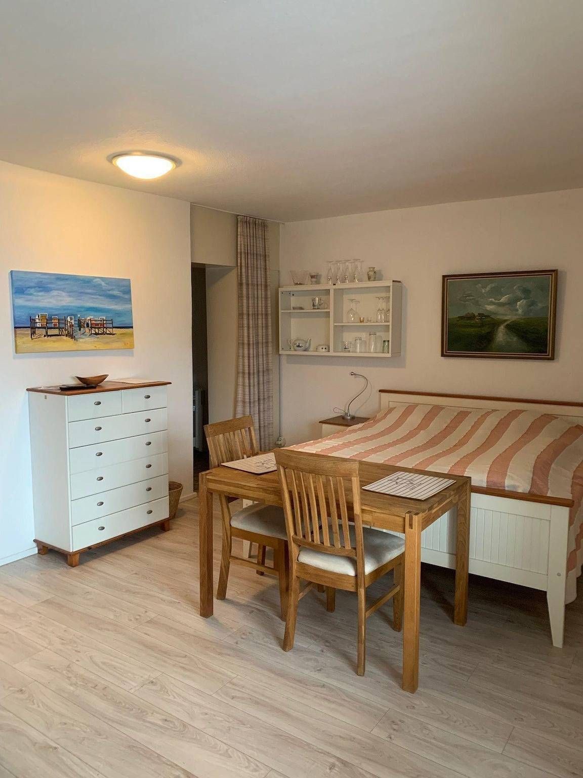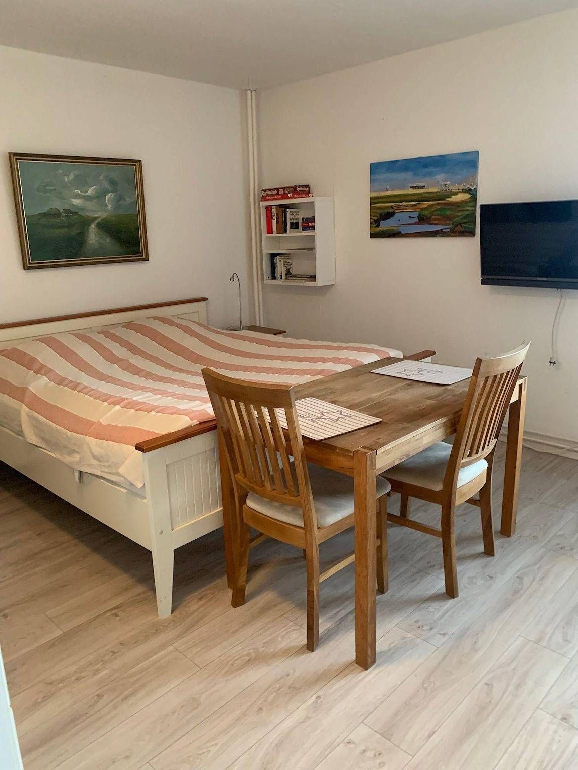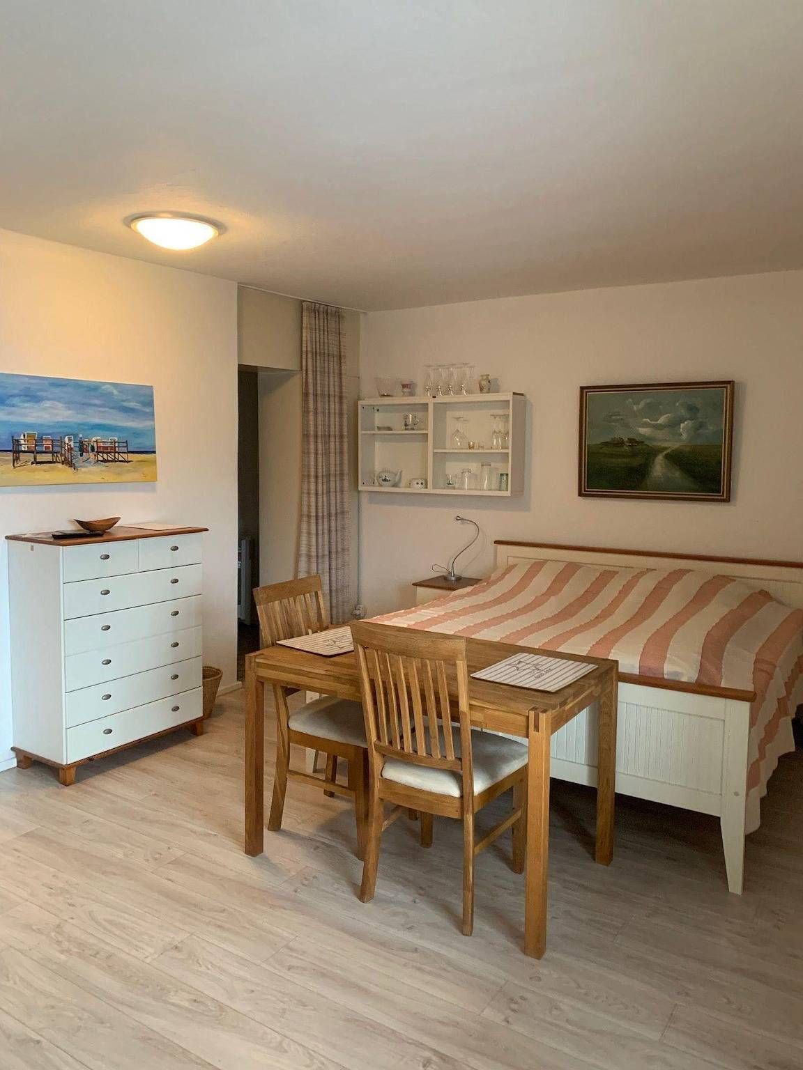 FeWo für Paare auch gern mit Hund Nähe Seebrücke Diese 32qm große Apartment im 2.Stock (Aufzug vorhanden) des Hauses Luv und Lee bietet ausreichend Platz für bis zu zwei Personen auch gern mit Hund. Zentraler Raum ist hier das Wohn-Schlafzimmer mit hellen Möbel von guter Qualität. Hier lässt es sich auf den zwei Relaxsesseln mit Fußhockern entspannt einen Film am Flachbildschirmfernseher schauen. Dieser ist platzsparend an der Wand angebracht, so dass auch aus dem Doppelbett heraus Fernsehen geschaut werden kann. Am Vollholz-Esstisch lässt sich bei einem gemeinsamen Frühstück wunderbar in den Urlaubstag starten. In der Küchenzeile finden Sie eine umfangreiche Ausstattung vor, die Ihnen die Selbstversorgung erleichtert (z.B. einen Kühlschrank mit Gefrierfach). Ein kleiner Balkon ist ebenfalls vorhanden. Als weitere Besonderheit ist hier das Bad mit mit Wanne zu nennen. Waschmaschinen und Trockner (Münzbetrieb) stehen Ihnen im Haus Luv und Lee zur Nutzung bereit. Möchten Sie gerne frische Wäsche erhalten? Dann buchen Sie diese nach Bedarf bei uns hinzu. Wir versorgen Sie gern mit Wäschepaketen, nur Bettwäsche oder Handtuchpaketen. Zur Wohnung gehört ein kleiner Balkon. Für Ihre Fahrräder gibt es Unterstellmöglichkeiten (räumlich begrenzt) und für Ihr Auto einen Stellplatz auf dem Parkdeck. Das Haus Luv und Lee befindet sich in St.Peter-Ording im Kurzentrum von St.Peter-Bad. Durch die zentrale Lage unmittelbar an der Promenade gelangen Sie direkt über die 1km lange Seebrücke zum Strand. Flach abfallend und im Badebereich DLRG überwacht ist dieser sehr gut für Kinder geeignet. Bitte beachten Sie, dass eine eventuell anfallende Kurabgabe nicht im Gesamtpreis enthalten ist. Diese ist vor Ort zu leisten.
