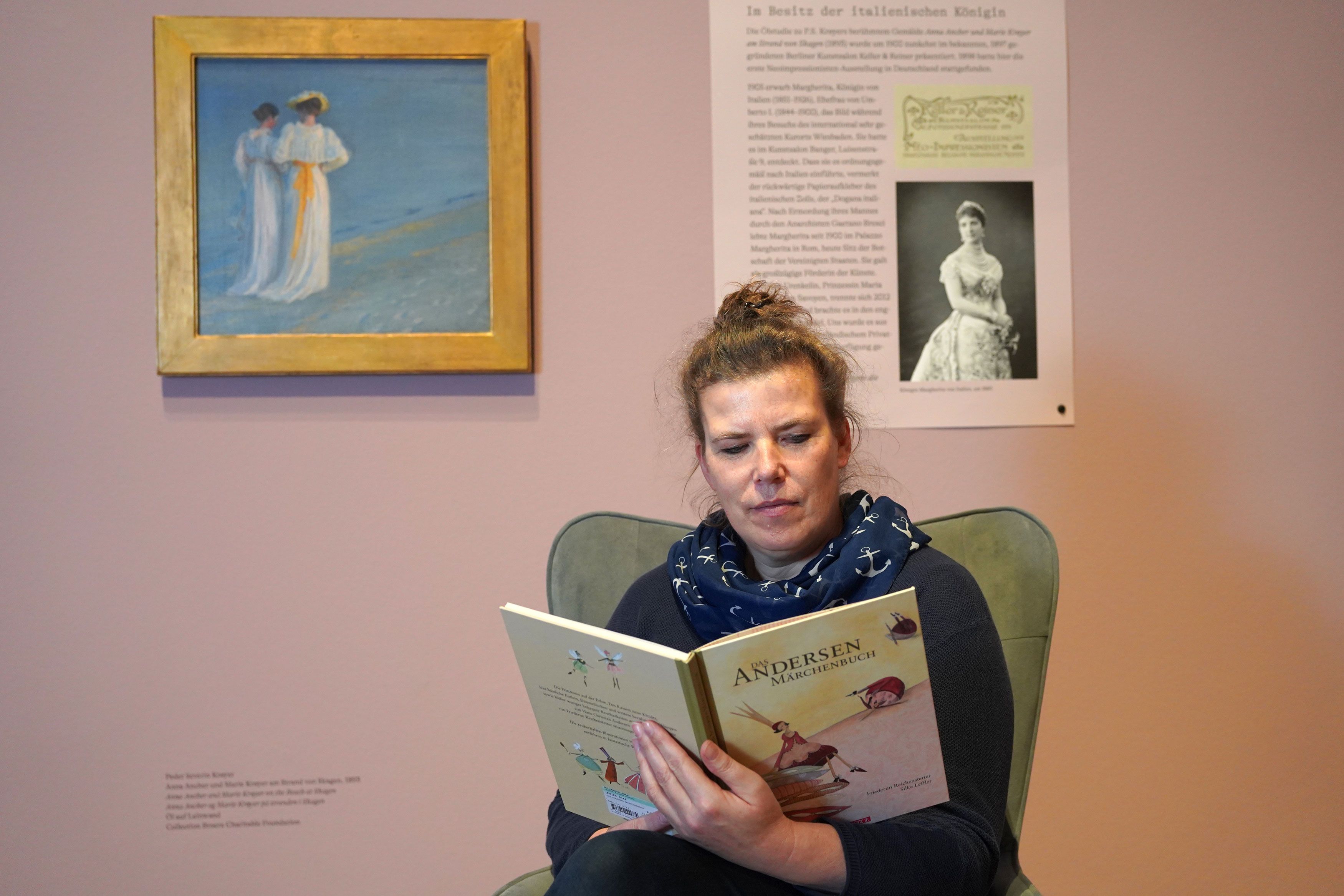 Unsere Kunstvermittlerin Sylvia Haumersen liest eine Geschichte in der Ausstellung vor.