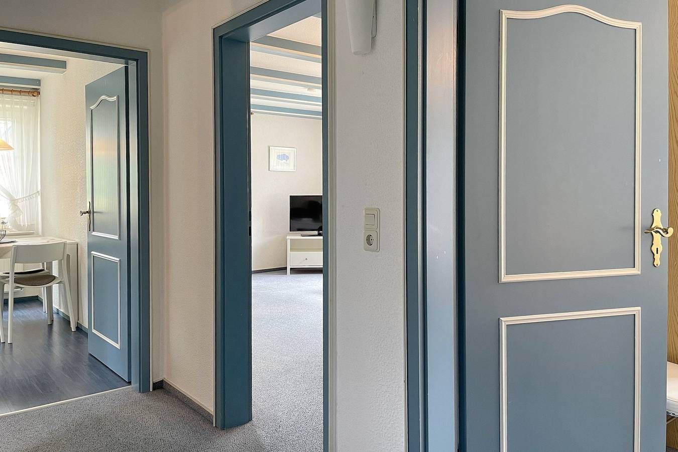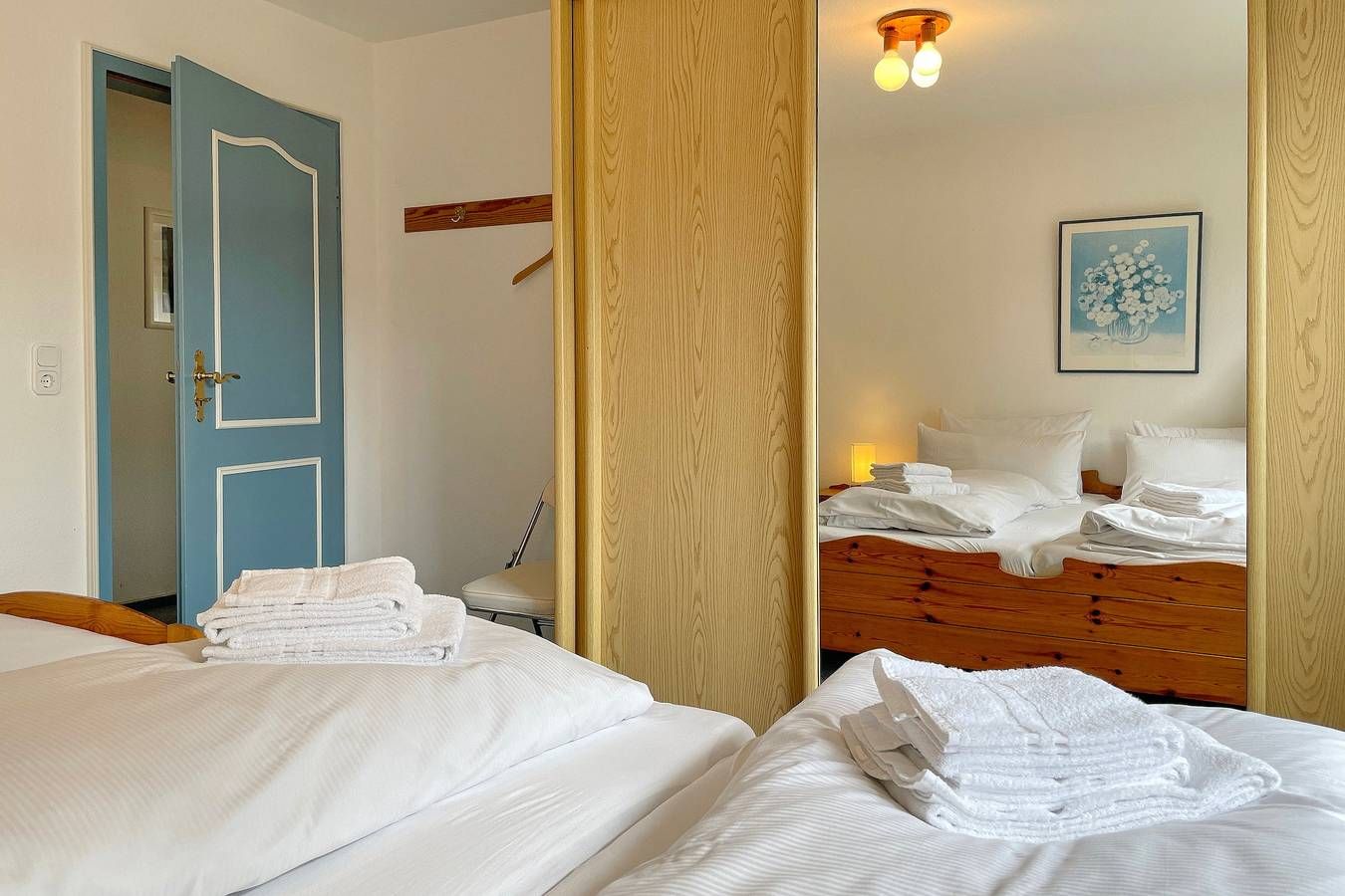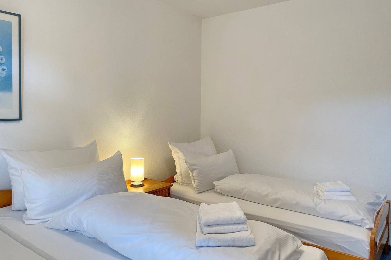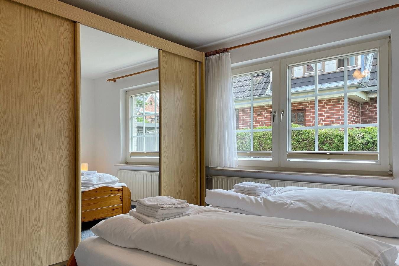 Das Haus Manuela im Halligweg ist ein ruhiges, gepflegtes Einzelhaus mit zwei Ferienwohnungen für 2 bis max. 5 Personen. Hier erleben sie wunderschöne Urlaubstage und können sich entspannt erholen. Im Halligweg 14a befindet sich in ruhiger Lage dieses schöne Ferienhaus mit zwei Wohnungen für je 4 bis 5 Personen (davon ein Kind, dass maximal 12 Jahre ist). Hier können Sie herrliche Urlaubstage verbringen. Das Friesenmuseum und das Aquaföhr, unser Meerwasserwellenbad mit Fitnessstudio und Sauna sowie verschiedenen Angeboten von Kuranwendungen sind in unmittelbarer Nähe ebenso das Wäldchen mit dem Abenteuerspielplatz Löwenhöhle, der bei Kindern besonders beliebt ist. Die Wyker Innenstadt erreichen Sie ebenfalls in wenigen Minuten. Das Ferienhaus Manuela bietet weiterhin eine Waschmaschine und einen Trockner (gegen Gebühr) zur gemeinschaftlichen Nutzung an sowie eine gemeinsame Nutzung eines Fahrradunterstellplatzes. Im Garten gibt es zwei kleine Terrassen, die durch einen Sichtschutz voneinander getrennt werden können (eine Zuordnung zu einer Wohnung gibt es nicht). Die behagliche Erdgeschosswohnung Manuela Sieck EG bietet Platz für 4 Personen. Das geräumige Wohnzimmer mit Flachbild-TV, WLAN, CD-Player mit Kassettenfach und einer kleinen Auswahl an Büchern verfügt über eine moderne Sitzgruppe bestehend aus zwei Sofas und einem Lesesessel ist maritim eingerichtet. Hier befindet sich ein gemütliches Doppelschrankbett (160x 200 cm). Die Wohnküche mit Essplatz für 4 Personen, Ceranfeldherd, Backofen, Kühlschrank mit Gefrierfach, Geschirrspüler und Mikrowelle ist gut ausgestattet. Geruhsame Nächte verspricht das Schlafzimmer mit Doppelbett (180x190 cm) und einem Einzelbett (90x190cm) sowie dem geräumigen Kleiderschrank. Das kleine Duschbad mit Fenster ist funktional. Genießen Sie den maritimen Charme dieser Wohnung und verbringen Sie herrliche Urlaubstage. Wunderbar eignet sich dieses Domizil auch für zwei befreundete Familien, die gerne zusammen in Urlaub fahren möchten, dabei aber auch Ihre eigene Ruhezone besitzen möchten. Wir freuen uns auf Ihren Anruf! Bei Auswahl eines Kinderreisebetts wird dieses anstelle eines normalen Bettes bezogen. Sollten Sie das Kinderreisebett zusätzlich benötigen, buchen Sie bitte ein weiteres Wäschepaket hinzu, da wir nur bezogene Kinderreisebetten verleihen. ---------------------------------------- 2025: Infos zum Wäschepaket (obligatorisch): Unser Wäschepaket besteht aus der bezogenen Bettwäsche, 1 Duschtuch, 2 Handtüchern, 1 Geschirrtuch und einem Badvorleger und gehört obligatorisch zur Buchung dazu. Ab 21 Übernachtungen bieten wir auf Wunsch einen kostenfreien Wäschewechsel an. Zusätzlich können Handtücher und Duschtücher optional nach Bedarf einzeln hinzugebucht werden. Ab 2026 mehr Flexibilität und Individualität: Das bekannte Wäschepaket ist nicht mehr buchbar. Die Bettwäsche bleibt aus hygienischen Ansprüchen eine obligatorische Serviceleistung. Sie finden die Betten weiterhin bezogen vor. Doch Hand- und Duschtücher können Sie künftig entweder selbst mitbringen oder auf eigenen Wunsch einzeln optional hinzubuchen. Diese Variante ist aus betrieblichen Gründen erst für Buchungen in 2026 buchbar und entspricht dem Gästewunsch laut Umfrage nach mehr Flexibilität, Individualität und Nachhaltigkeit! Infos zum Präsentkorb Föhrer Inselkäse für 2 oder 4 Personen (Inhalte nicht austauschbar) Der Föhrer Präsentkorb für 4 Personen enthält: 200g Föhrer Naturkäse, 200g roten Föhrer Fruchtaufstrich, 430g Alkersumer Gemüsetopf, 6 Stangen (ca. 160g) Wattwürmer, 150g Landleberwurst , 125ml Föhrer Chutney und 0,33l Föhrer Biar. Der Föhrer Präsentkorb für 2 Personen enthält: 200g Föhrer Bärlauch-Käse, 200g Föhrer Fruchtaufstrich Apfel-Zimt, 430g vegane Linsenbolognese und ca. 130g mildem Landschinken vom Schwein.