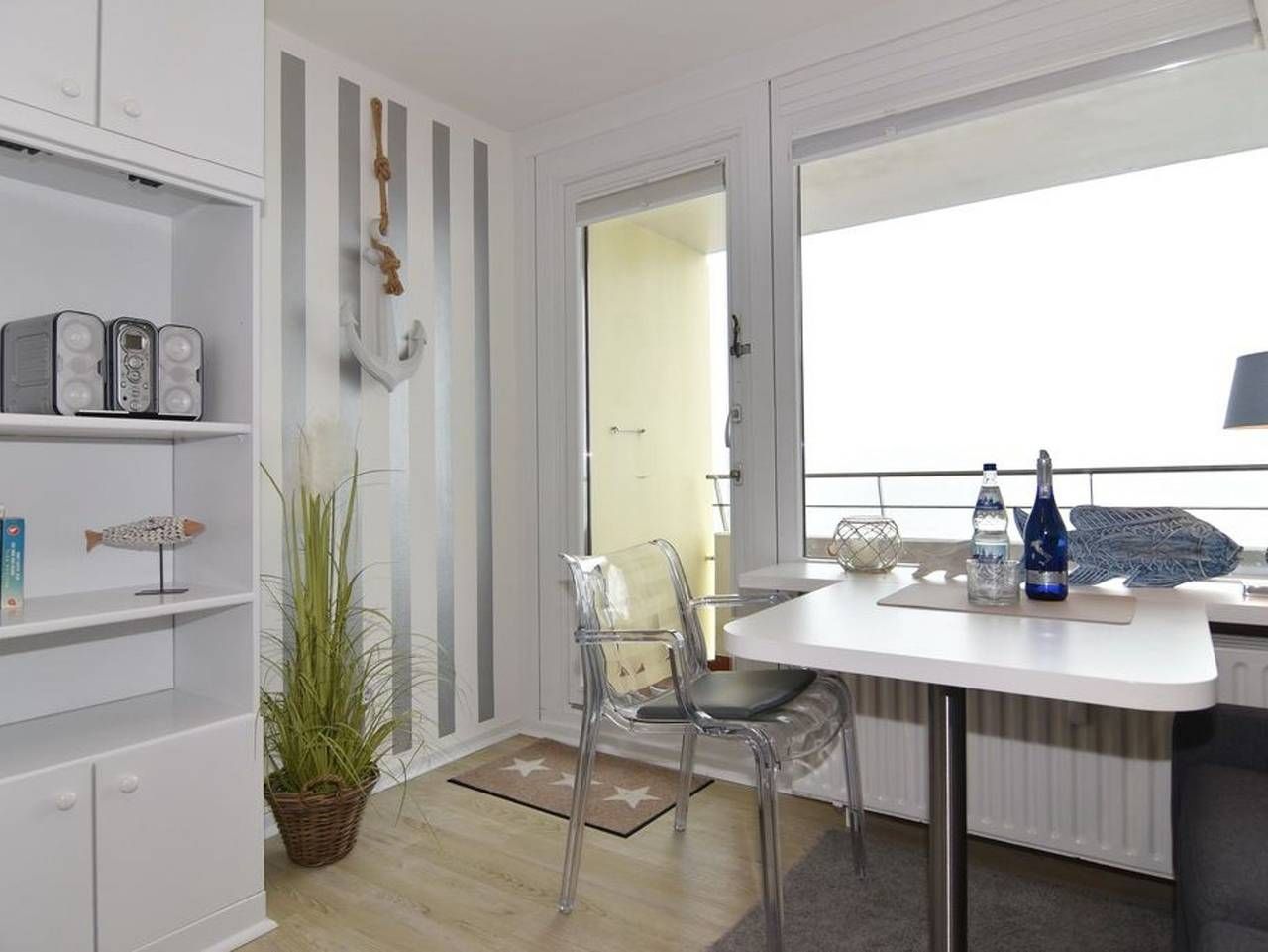 Nichtraucher-Whg.! 1 Zimmer-Ferienwohnung, 12. OG, ca. 25 m², Neues Kurzentrum, Haus Metropol Wohn-/ Schlafraum mit 2 Einzelschrankbetten (2x90x190), Zwei-Sitzer-Sofa, Sessel, abklappbarer Esstisch an der Seite, Kabel-TV, Radio, WLAN (ohne Gewähr),[nbsp][nbsp]Westbalkon mit herrlichem Meeresblick, Küchenzeile im Flurbereich mit Mikrowelle (Hauptschalter Ceranfeld oben rechts), Duschbad/WC. Tierhaltung ist nicht gestattet. Bettwäsche und Handtücher sind zur Anreise aufgezogen. Ein PKW-Stellplatz kann kostenpflichtig zugebucht werden.