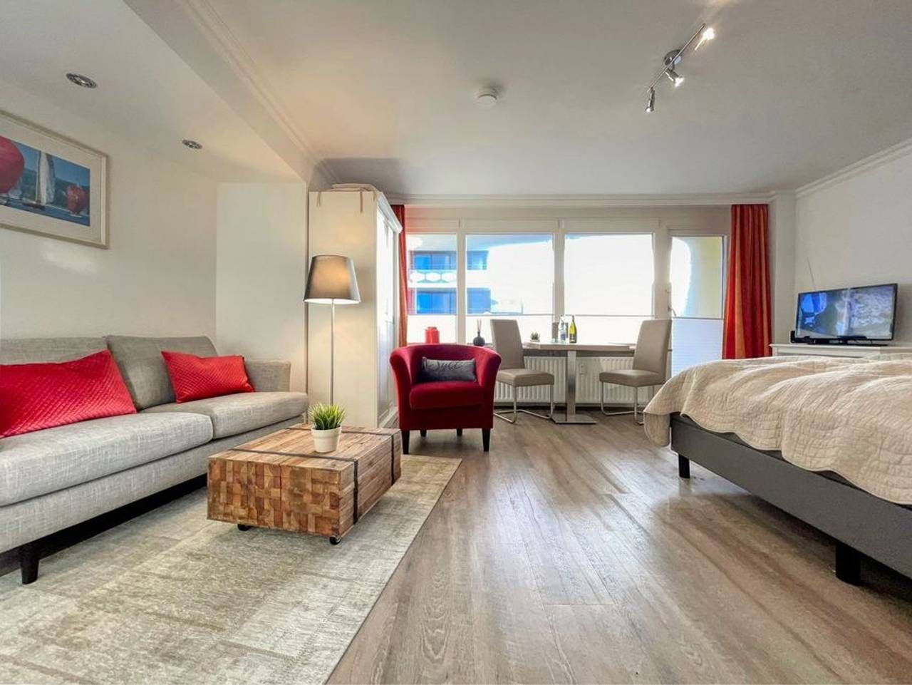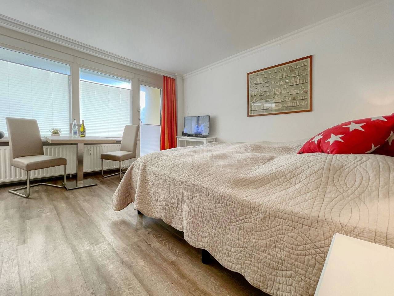 Das großes, moderne 1-Zimmer-Eck-Apartment im 1.OG vom Haus Metropol mit ca. 40 m² überzeugt durch sein großes gefliestes Wohn-/Schlafzimmer mit Doppel-Boxspringbett (160x200), Couchecke und Essplatz direkt am Fenster. Zudem...