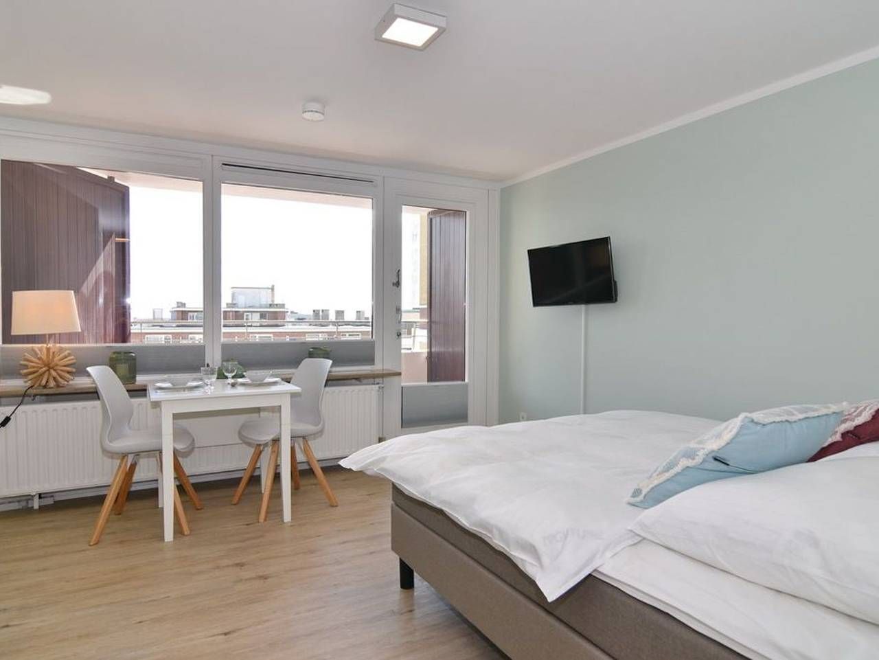 Modernes 1-Zimmer-Appartement im Haus Metropol, 3. OG mit Ostbalkon und Balkonmöbeln, ca. 30 m², Nichtraucher-Apartment. Wohn-/Schlafraum mit Doppelbett ( 160 x 200 ) und Essplatz am Fenster, Flat-TV, Radio und W-LAN ( ohne...