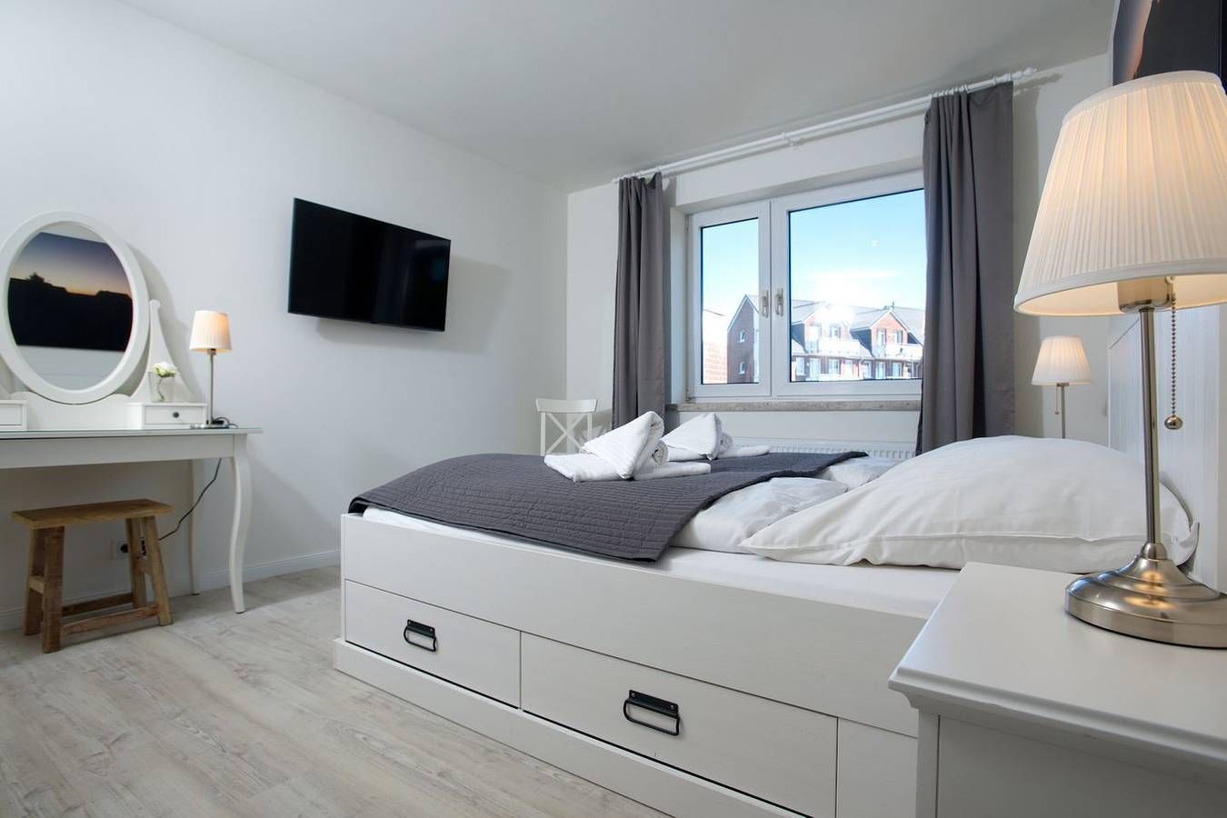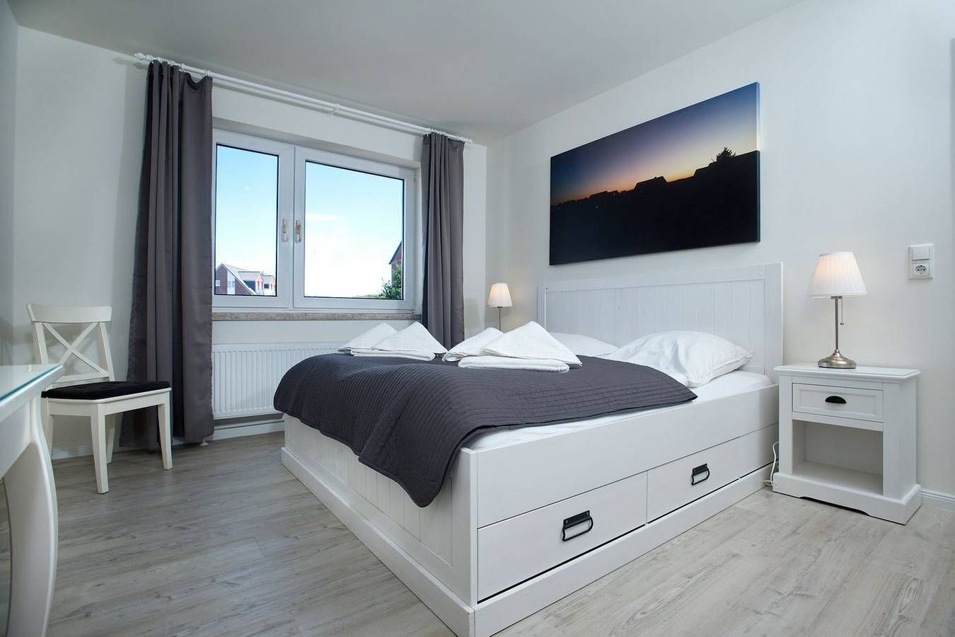 Die moderne 3-Zimmer-Wohnung im skandinavisch-leichten Stil liegt in ruhiger Lage von Hörnum und ist nur wenige Gehminuten von allen Hörnumer Stränden, dem Hafen, dem Naturerlebniszentrum "Arche", einem Spielplatz und dem bekannten Golfplatz "Budersand" entfernt. Die Wohnung befindet sich im Hochparterre und wurde im Jahr 2022 komplett saniert. Die Wohnung verfügt über eine separate Küche, die vollständig eingerichtet ist und einen kleinen Frühstücksplatz mit Morgensonne bietet. Das moderne Design der Wohnung setzt sich auch hier in der Küche fort. Das Badezimmer der Wohnung beeindruckt mit einer Kombination aus dunklen Fliesen, Weiß, Glas und einer bodenebenen Dusche. Die beiden getrennten Schlafzimmer sind jeweils mit einem Doppelbett und einem Schrank ausgestattet, ergänzt durch einen Frisiertisch und eine Kommode. Das geräumige kombinierte Wohn- und Esszimmer der Wohnung ist mit einer gemütlichen Eckcouch ausgestattet, die zum Entspannen einlädt. Der ausziehbare Esstisch bietet großzügig Platz für Familien und Gruppen. Vom Wohnzimmer aus gelangt man auf den nach Westen ausgerichteten Balkon, der ein weiteres Highlight der Wohnung ist. Wohn- und Schlafzimmer der Wohnung verfügen über einen Flachbildfernseher und ein WLAN-Zugang ist selbstverständlich vorhanden. Ein Auto-Stellplatz liegt direkt neben dem Eingang zur Wohnung. Die moderne und stilvolle Ausstattung der Wohnung macht sie zu einem idealen Ausgangspunkt für einen erholsamen Urlaub in Hörnum.