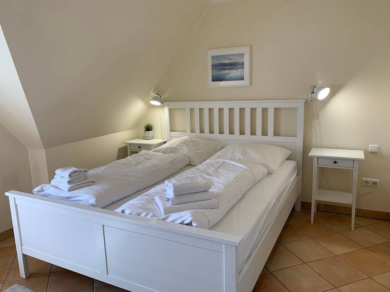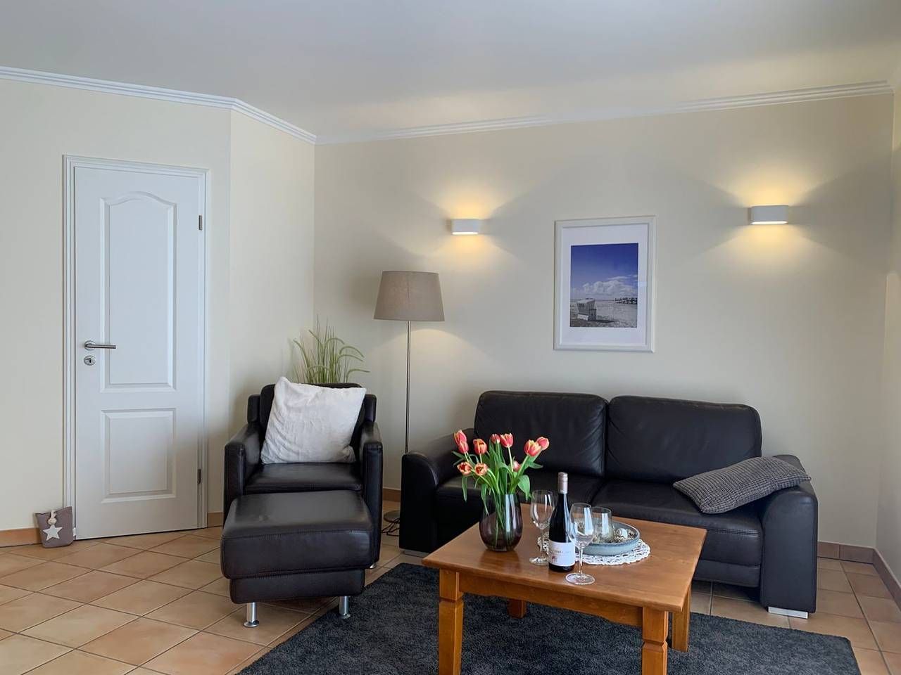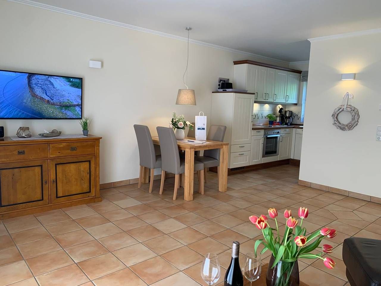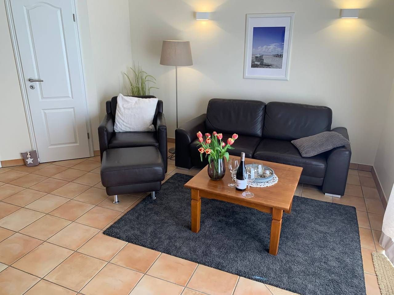 Ferienwohnung "Muschelhaus 2" in St. Peter Ording Die 68m² große 3-Zimmer Ferienwohnung erstreckt sich vom Erdgeschoss aus über zwei Ebenen und bietet bis zu 4 Personen Platz für einen wunderbaren Urlaub in St. Peter Ording. Zur Ferienwohnung gehört eine große, sonnige Terrasse mit südlicher Ausrichtung. In der Saison steht hier ein typisch norddeutscher Strandkorb zur Verfügung. Der Urlaub mit Hund in St. Peter Ording ist in dieser Ferienwohnung möglich, ein kleiner Hund begleitet die Familie in den Urlaub. Durch den Übergang zur Terrasse wirkt das modern und einladend eingerichtete Wohnzimmer wunderbar hell. Hier gehört eine edle Sitzgruppe, bestehend aus edler Ledercouch und einem gemütlichen Ledersessel, zur Ausstattung. Am Esstisch nimmt die gesamte Familie Platz, für die multimediale Unterhaltung sorgen ein großer Flachbild-TV und kostenfreies W-LAN. Die integrierte Küche ist modern und umfangreich ausgestattet, unter anderem sind Cerankochfeld und Backofen, Kühlschrank mit Gefrierfach sowie Geschirrspüler und Kaffeemaschine vorhanden. Ein Gäste-WC ist ebenfalls im Erdgeschoss. Im Obergeschoss stehen zwei helle, einladende Schlafzimmer zur Verfügung, eines ist ausgestattet mit komfortablem 180x200cm Doppelbett, ein weiteres mit 160x200 Doppelbett. Zum Obergeschoss gehört weiterhin ein Badezimmer mit ebenerdiger Dusche und WC, ein Handtuchtrockner ist vorhanden. Willkommen im Urlaub, willkommen in St. Peter Ording! Wichtige Informationen: Nichtraucher, 1 kleiner Hund auf Anfrage. PKW-Stellplatz vorhanden, Abstellmöglichkeit für Fahrräder vorhanden. Familienfreundlich, kinderfreundlich, hundefreundlich. Gemeinschaftliche Münzwaschtrockner vorhanden. Kinderhochstuhl und Babyreisebett vorhanden, Insektenschutzgitter im Schlafzimmer und Küche vorhanden, Fußbodenheizung.