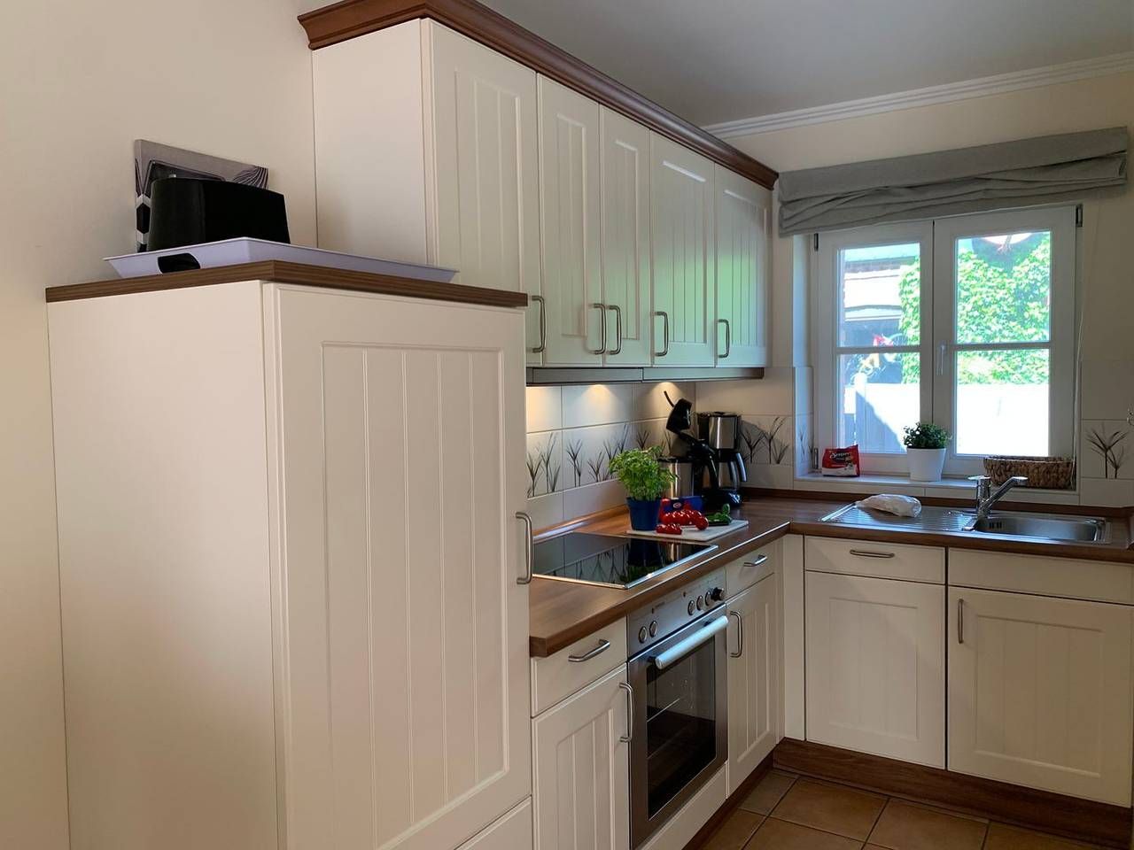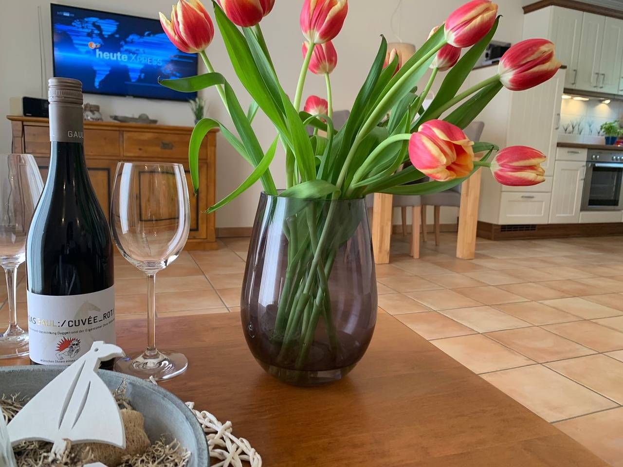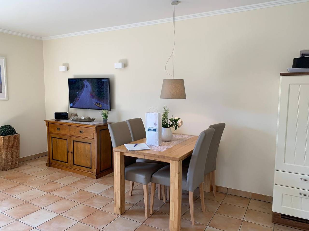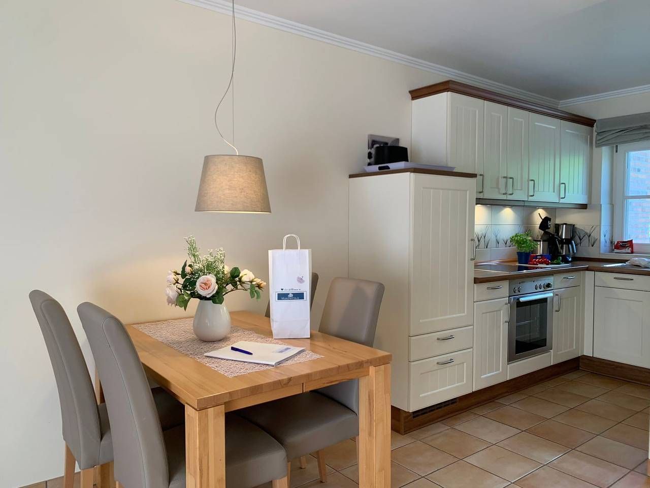 Ferienwohnung "Muschelhaus 2" in St. Peter Ording Die 68m² große 3-Zimmer Ferienwohnung erstreckt sich vom Erdgeschoss aus über zwei Ebenen und bietet bis zu 4 Personen Platz für einen wunderbaren Urlaub in St. Peter Ording. Zur Ferienwohnung gehört eine große, sonnige Terrasse mit südlicher Ausrichtung. In der Saison steht hier ein typisch norddeutscher Strandkorb zur Verfügung. Der Urlaub mit Hund in St. Peter Ording ist in dieser Ferienwohnung möglich, ein kleiner Hund begleitet die Familie in den Urlaub. Durch den Übergang zur Terrasse wirkt das modern und einladend eingerichtete Wohnzimmer wunderbar hell. Hier gehört eine edle Sitzgruppe, bestehend aus edler Ledercouch und einem gemütlichen Ledersessel, zur Ausstattung. Am Esstisch nimmt die gesamte Familie Platz, für die multimediale Unterhaltung sorgen ein großer Flachbild-TV und kostenfreies W-LAN. Die integrierte Küche ist modern und umfangreich ausgestattet, unter anderem sind Cerankochfeld und Backofen, Kühlschrank mit Gefrierfach sowie Geschirrspüler und Kaffeemaschine vorhanden. Ein Gäste-WC ist ebenfalls im Erdgeschoss. Im Obergeschoss stehen zwei helle, einladende Schlafzimmer zur Verfügung, eines ist ausgestattet mit komfortablem 180x200cm Doppelbett, ein weiteres mit 160x200 Doppelbett. Zum Obergeschoss gehört weiterhin ein Badezimmer mit ebenerdiger Dusche und WC, ein Handtuchtrockner ist vorhanden. Willkommen im Urlaub, willkommen in St. Peter Ording! Wichtige Informationen: Nichtraucher, 1 kleiner Hund auf Anfrage. PKW-Stellplatz vorhanden, Abstellmöglichkeit für Fahrräder vorhanden. Familienfreundlich, kinderfreundlich, hundefreundlich. Gemeinschaftliche Münzwaschtrockner vorhanden. Kinderhochstuhl und Babyreisebett vorhanden, Insektenschutzgitter im Schlafzimmer und Küche vorhanden, Fußbodenheizung.