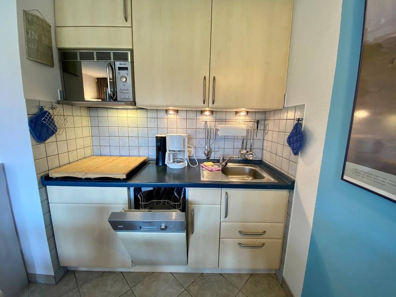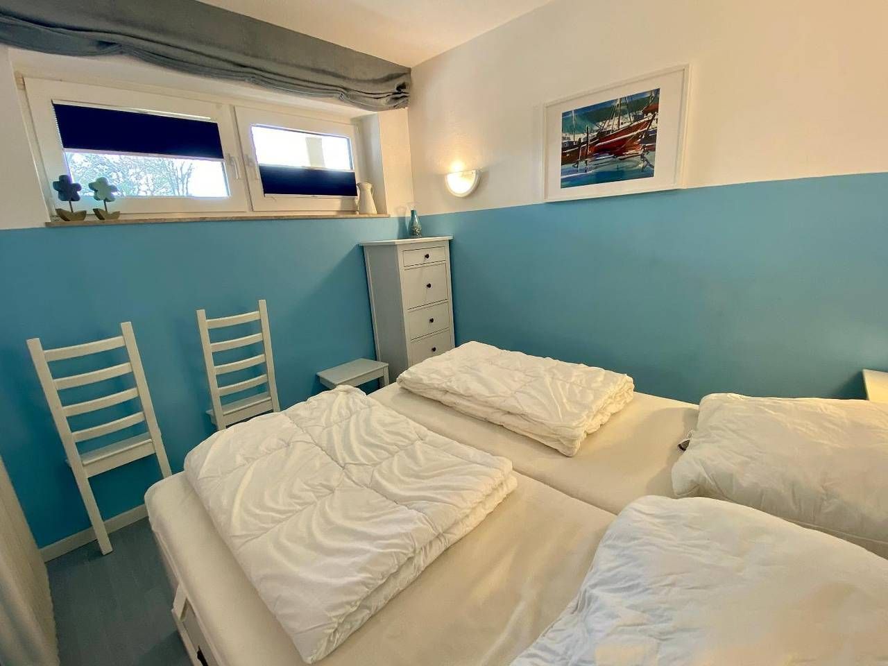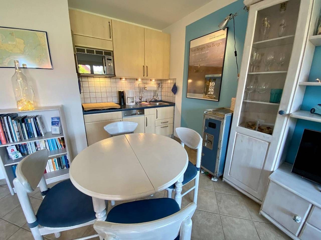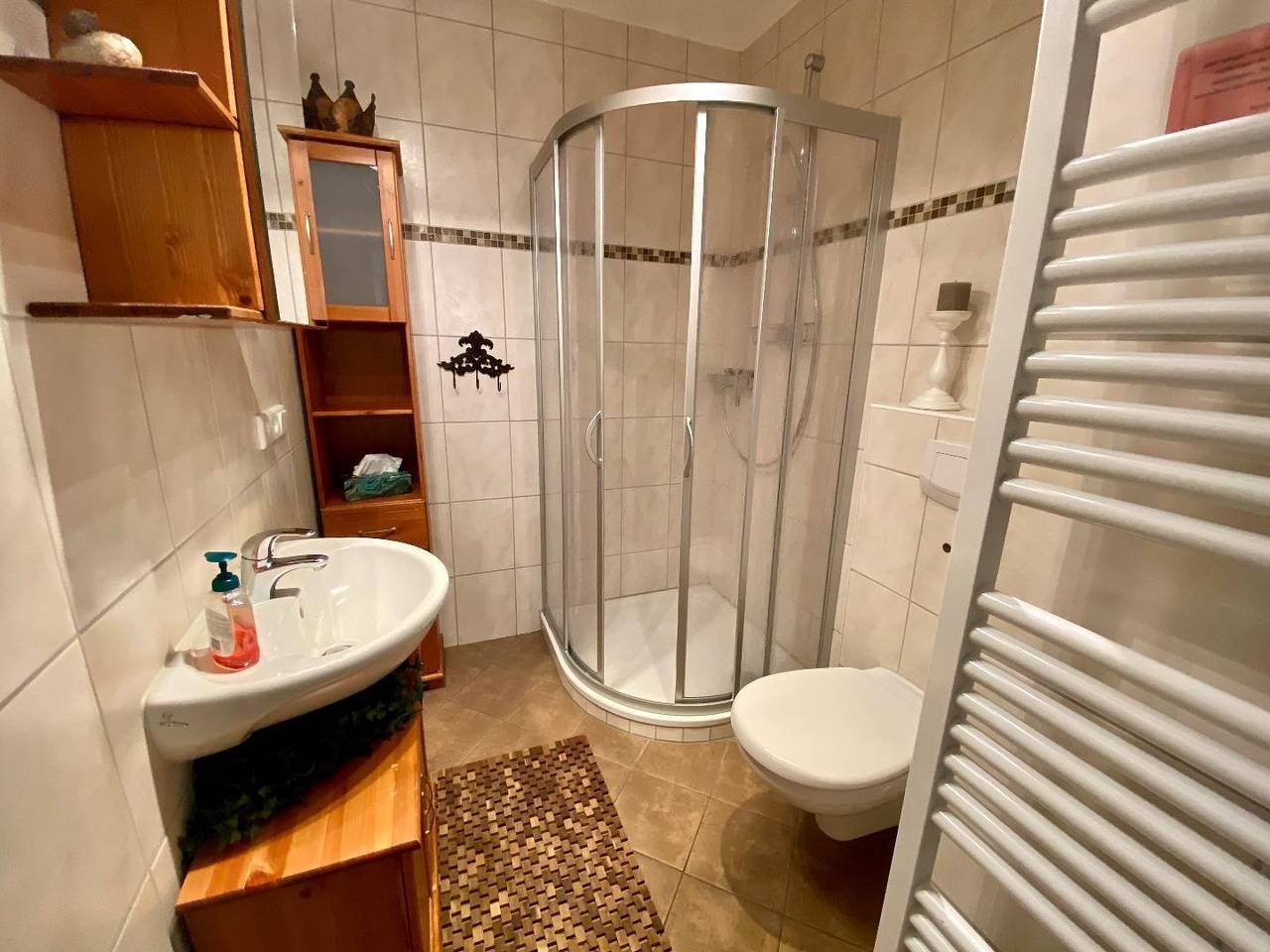Die ebenerdige Nichtraucher-Wohnung befindet sich im Erdgeschoss eines ruhigen und doch zentral gelegenen Appartementhauses mit 12 Wohnungen. Die gemütliche und Allergiker-freundliche Wohnung (alle Fußböden sind mit Fliesen bzw. Laminat ausgestattet) ist für 2 Personen bestens geeignet. Sie ist hochwertig ausgestattet, hat eine große zum Teil überdachte Südterrasse (14 m2) mit eigenem Strandkorb, Gartenmöbeln und Markise, an die eine kleine ruhige Grünfläche anschließt, die ausschließlich von den Hausbewohnern genutzt wird. Vor dem Haus befindet sich ein Parkplatz mit eigenem PKW-Stellplatz. WLAN kann kostenlos genutzt werden. Haustiere sind nicht erlaubt. Die Wohnung ist in ein lichtdurchflutetes Wohnzimmer mit Küchenzeile, Schlafzimmer, Flur und Duschbad aufgeteilt. Im Wohnzimmer finden Sie eine Schlafcouch, einen Sessel, eine Sitzgruppe sowie Smart-TV, Bose-Box, einige Gesellschaftsspiele und eine interessante kleine Bibliothek. In der Küchenzeile befinden sich ein Ceranfeld, ein Kühlschrank mit Gefrierfach, eine Mikrowelle sowie Kleingeräte wie Wasserkocher, Kaffeemaschine, Toaster und Mixer. Einen kleinen Beistellbackofen können Sie bei Bedarf aufstellen. Der geräumige Flur beinhaltet einen Kleiderschrank mit eingebautem Tresor, eine großzügige Garderobe, ein Schuhregal und einen Spiegel. Das Duschbad besteht aus einer Dusche mit einem niedrigen Einstieg, Waschbecken, WC und Handtuchwärmer sowie großzügiger Abstellfläche im Spiegelschrank ebenso wie in einem weiteren Schrank und in einem Eckregal. Ein Fön liegt für Sie bereit. Im an den Flur angrenzenden Schlafzimmer befindet sich ein Doppelbett und 2 stumme Diener sowie eine hohe Kommode. Im gemeinschaftlichen Keller können Sie eine Waschmaschine und einen Trockner im Münzbetrieb nutzen. Im Privatkeller haben Sie Platz um Ihre Koffer abzustellen.