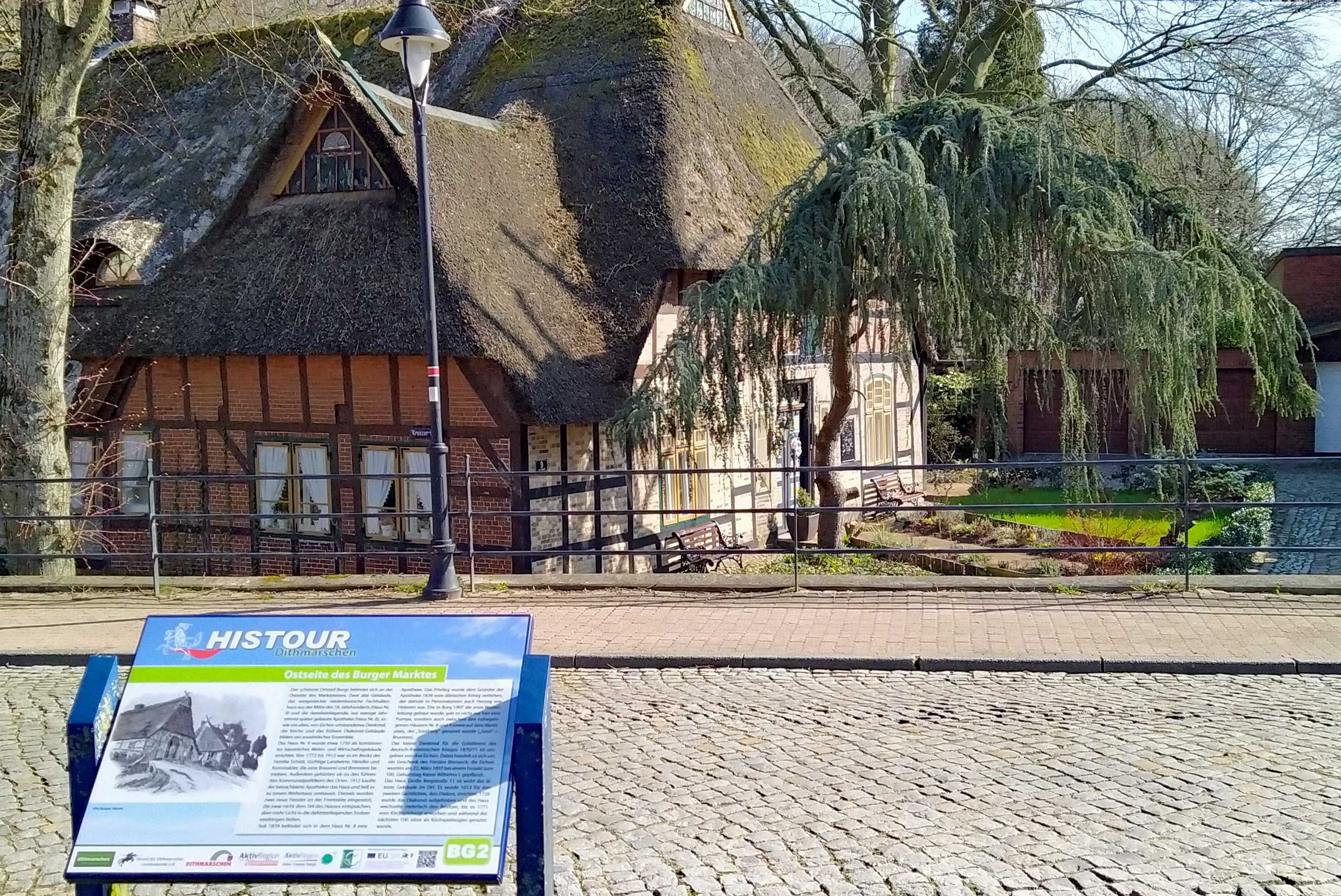 Der schönste Ortsteil Burgs befindet sich an der Ostseite des Marktplatzes. Zwei alte Gebäude, das reetgedeckte niederdeutsche Fachhallenhaus aus der Mitte des 18. Jahrhunderts (Haus Nr. 9) und die danebenliegende, nur wenige Jahrzehnte später gebaute Apotheke (Haus Nr. 8), sowie ein altes, von Eichen umstandenes Denkmal, die Kirche und das frühere Diakonat-Gebäude bilden ein ansehnliches Ensemble.