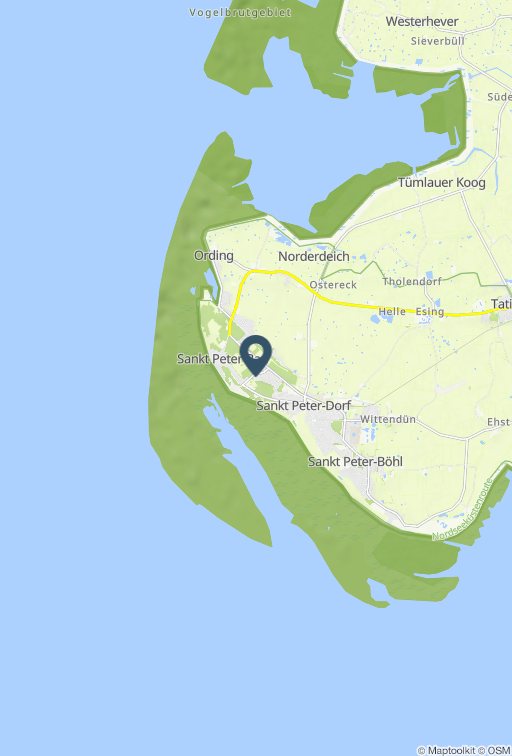 Ferienwohnung "Achtern Diek" in St. Peter Ording Die 47m² große 2-Zimmer Ferienwohnung liegt im Erdgeschoss Hochparterre und bietet zu 3 Personen Platz für einen wunderbaren Urlaub in St. Peter Ording. Zur Ferienwohnung gehört ein möblierter Balkon. Durch den Übergang zum Balkon wirkt das im Beach House Style eingerichtete Wohnzimmer wunderbar hell und einladend. Hier begeistert eine urgemütliche Sitzgruppe, bestehend aus Couchgarnitur und einem Schwingsessel mit Fußhocker. Am Esstisch, angrenzend an den Tresen der offenen Küche, ist Platz für die ganze Familie. Für die multimediale Unterhaltung sorgen großer Flachbild-TV und kostenfreies W-LAN. Die in den Raum integrierte, offene Küche ist mit einem Tresen vom Wohnraum separiert. Zur Ausstattung gehört hier unter anderem Cerankochfeld und Backofen sowie Kühlschrank mit Gefrierfach, Geschirrspüler und Kaffeemaschine. Abgetrennt hinter einem edlen Paravent befinden sich zwei Einzelbetten. Ein separates Schlafzimmer ist mit einem Einzelbett ausgestattet. Zur Ferienwohnung gehört ein Duschbad mit WC. Wichtige Informationen: W-LAN vorhanden, PKW-Stellplatz und gemeinschaftlicher Fahrrad-Abstellraum vorhanden, Münzwaschtrockner auf jeder 2. Etage, 2 Tischtennisräume und Tennisplatz, kleiner Spielplatz. Nichtraucher. Familienfreundlich, kinderfreundlich.