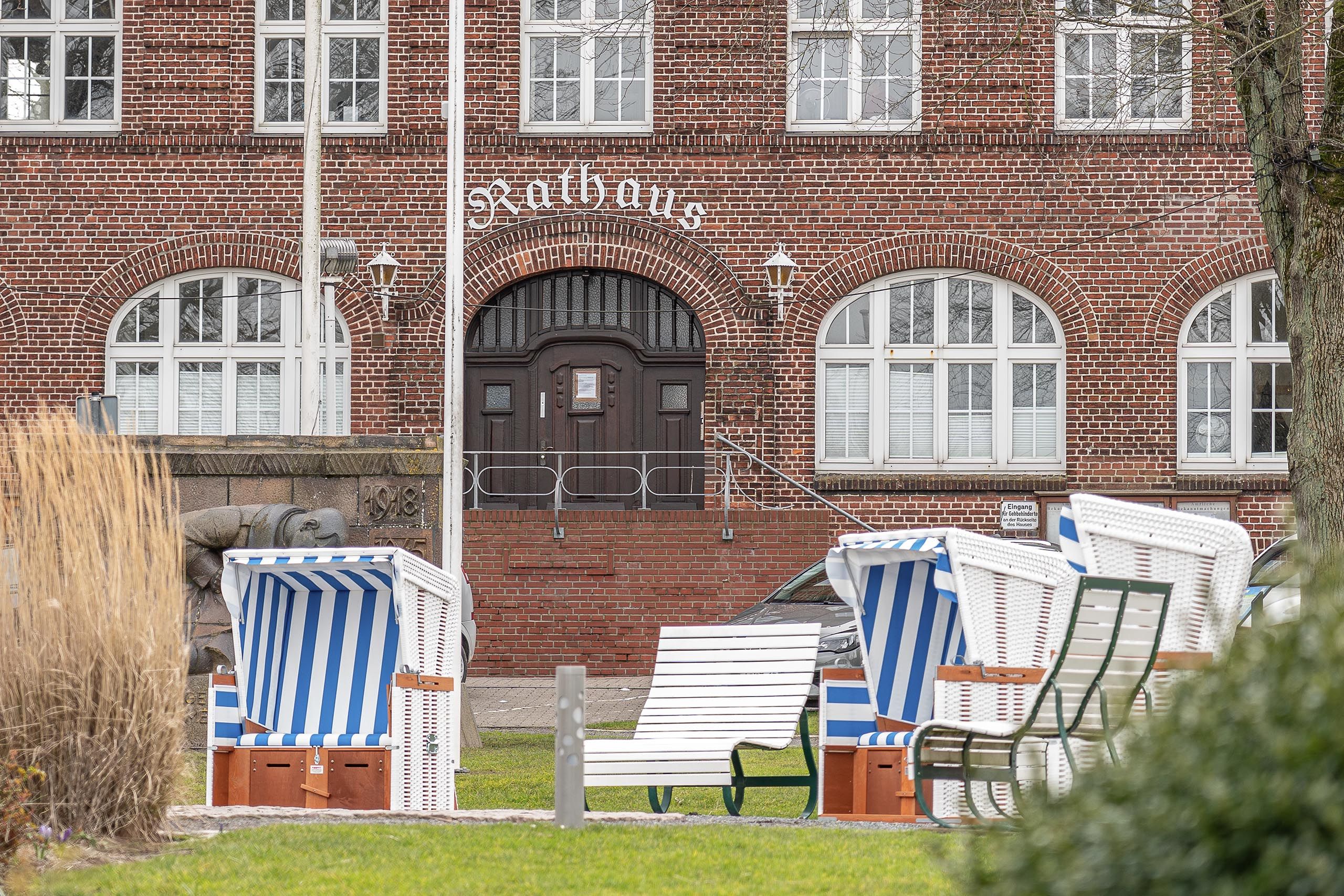 Die eigentliche Vorderfront wird von einem überproportional breiten halbrunden Mittelgiebel beherrscht, in dessen Zentrum der Heilige Clemens mit dem Anker dargestellt ist, der Patron des Kirchspiels Büsum. Zu beiden Seiten befinden sich die Jahreszahlen 1914 und 1915.
