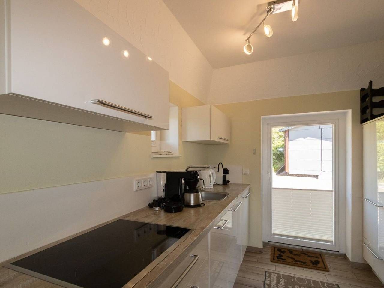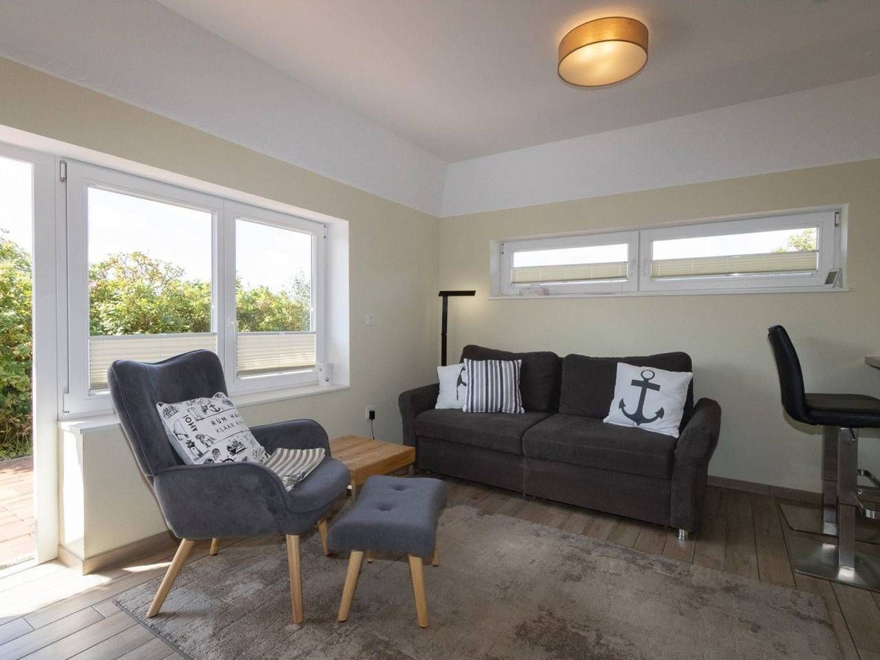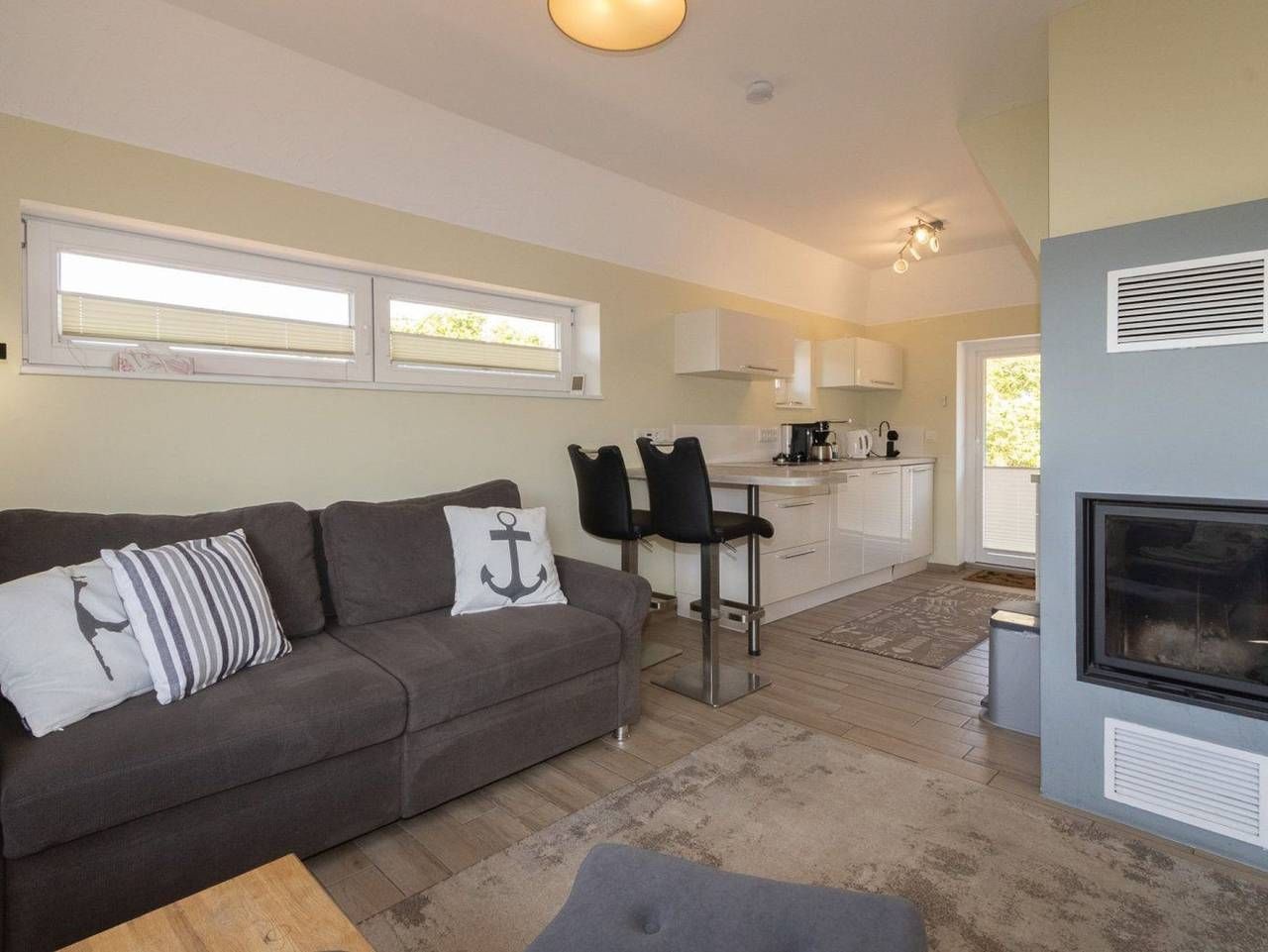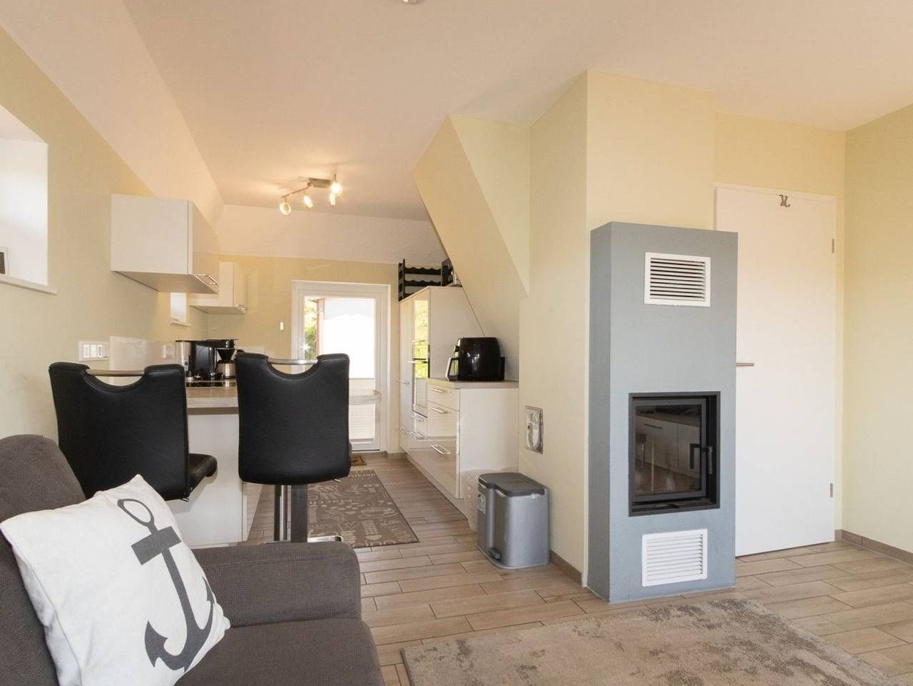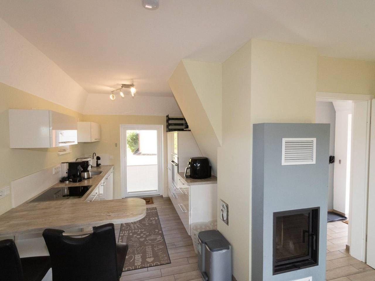 Der schöne Wohnraum im Erdgeschoss verfügt über eine Schlafcouch für die 3. und 4. Person und liegt offen zur Küche. Die stilvolle Ausstattung ist modern. Im Wohnraum findest du auch den Kamin, der zusätzlich zur Fußbodenheizung für eine wohlige Wärme sorgt. Das Schlafzimmer erreichst du über eine Treppe. Es ist mit zwei Einzelbetten ausgestattet. Eine hochwertige Einbauküche mit Spülmaschine und guter Ausstattung steht zur Benutzung zur Verfügung.