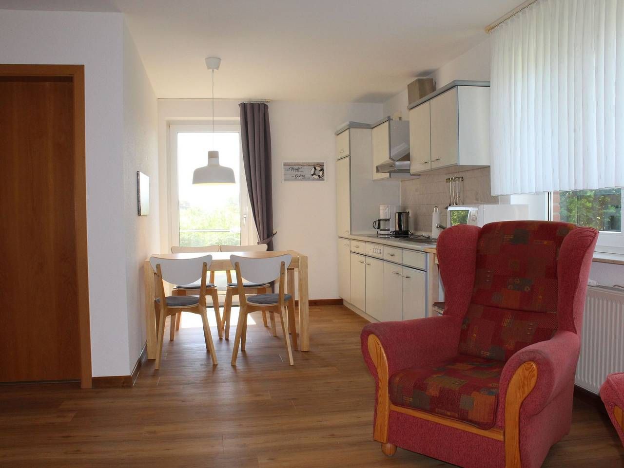 Diese Wohnung ist ca. 45 qm groß und liegt im Erdgeschoss mit anschließender Terrasse. Sie ist ausgestattet für 2 mit einem Schlafzimmer mit Doppelbett (1,8 x 2 m) einem Wohn- und Esszimmer mit Pantryküche, sowie einem...