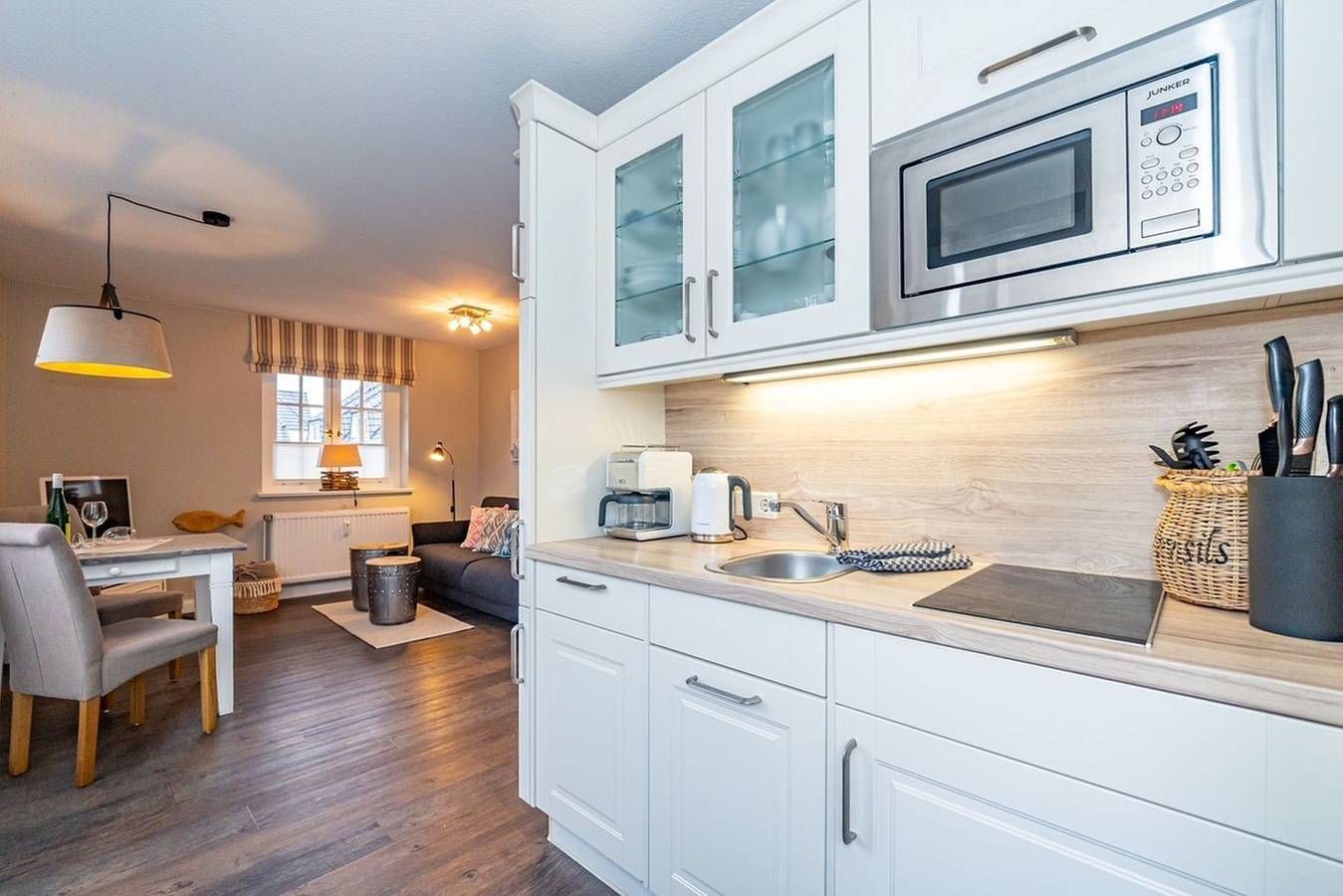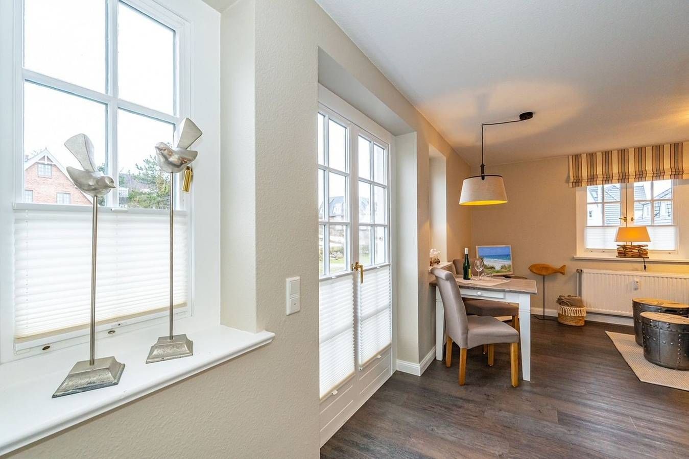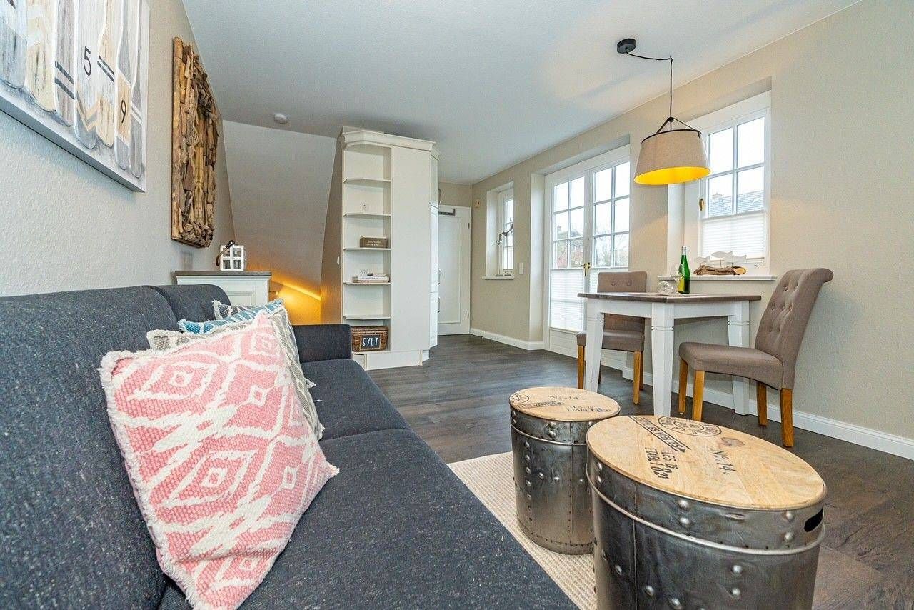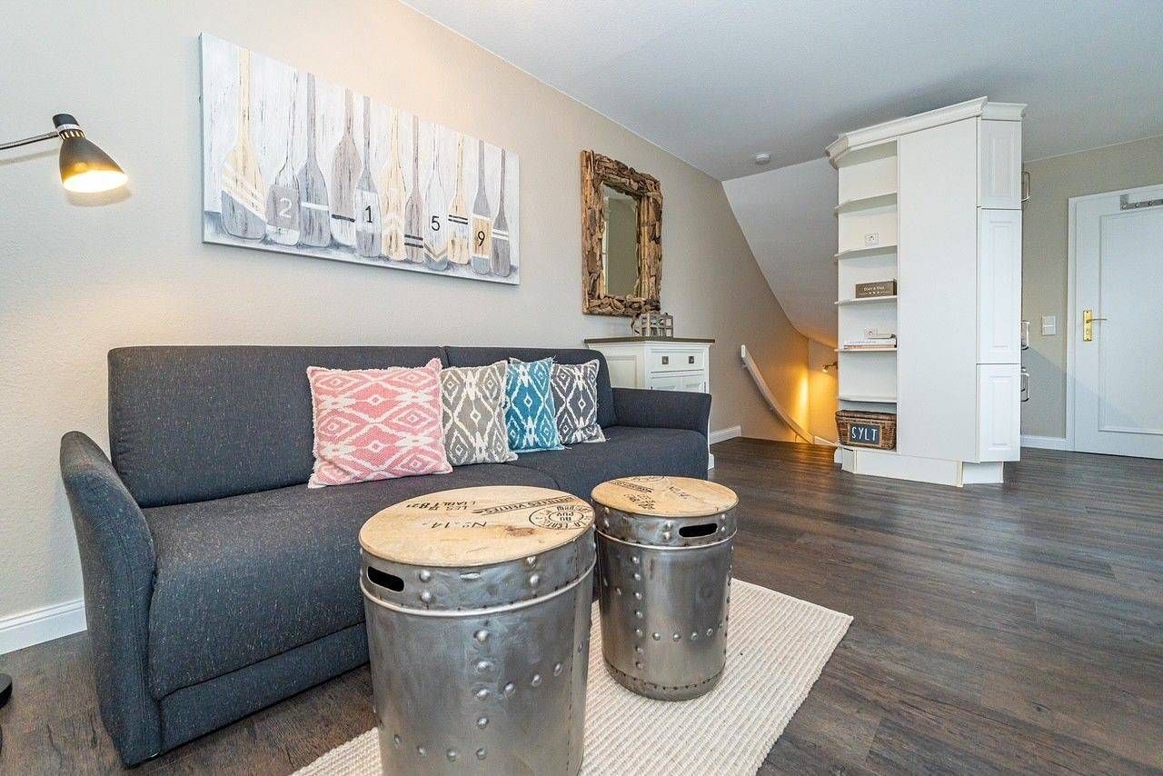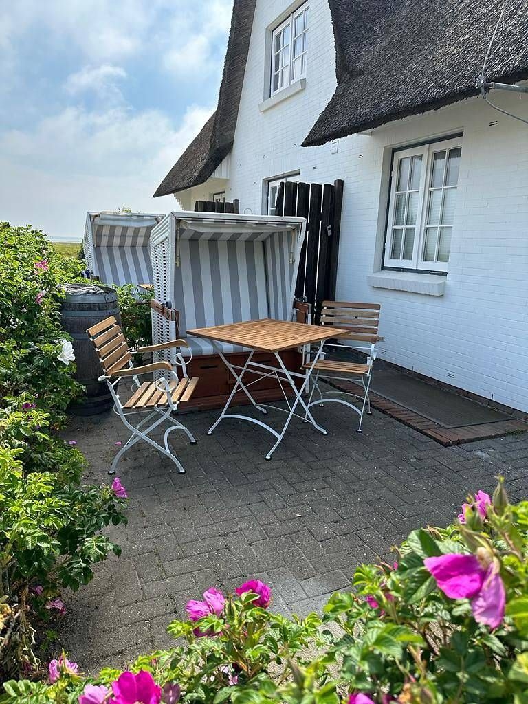 Freundliche im Sylt-Style eingerichtete Wohnung mit Terrasse. Offener Wohn- und Essbereich im EG, sowie Schlafzimmer und helles Duschbad mit Natursteinfliesen im UG. Die Küchenzeile ist gut ausgestattet mit Mikrowelle, Geschirrspüler und Gefrierfach. Eine Nespresso-Maschine für den Morgenkaffee steht bereit. Wohnzimmer und Schlafzimmer verfügen jeweils über ein TV- Gerät. In der Saison befindet sich auf der Terrasse ein eigener Strandkorb nebst Gartenmöbeln. Von hier aus schweift der Blick aufs Wattenmeer. Ein Vierbeiner ist herzlich willkommen. Waschmaschine und Trockner stehen gegen Gebühr zur Verfügung. PKW Stellplätze sind auf dem Grundstück vorhanden.