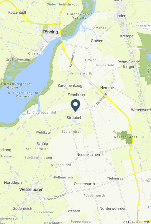 Die Wohnung liegt ruhig, auf einem großen Grundstück, im sympathischen, lang gestreckten Bauerndorf, Neuenkirchen/Strübbelam Rande der Region. Die Nordsee erreichen sie nach ca.8 km, die nächste Badestelle an der Eidermündung in 3 km. Im Außenbereich steht eine möblierte Terrasse zur Verfügung. Fahrräder können im Schuppen untergestellt werden. Die 65 m² große, helle Ferienwohnung ist mit zwei Schlafzimmern, einem Tageslichtbad mit Dusche, einem gemütlichen Wohnzimmer mit Radio und Sat.-TV und einer modernen Einbauküche ausgestattet. Das Elternschlafzimmer verfügt über ein Doppelbett, das Kinderzimmer über zwei Einzelbetten. Die Küche bietet Herd mit Backofen, Kühlschrank mit Gefrierfach, Kaffeemaschine, Toaster, Mikrowelle und Wasserkocher. Internetzugang haben Sie per WLAN. Einen Gasthof erreichen sie in 500 m und den Bäcker in 2 km. Den nächst größeren Ort mit vielen Einkaufsmöglichkeiten in 7 km (Wesselburen und Tönning). Sie erreichen St.Peter-Ording in 30 km, Hamburg mit Hafen in 100 km, Kiel mit Hafen und die Ostsee in 80 km. Zu den Fährverbindungen nach Amrum, Föhr und zu den Halligen sind es 70 km. Tagesausflüge nach Sylt oder zur Hochseeinsel Helgoland sind gut machbar. Es handelt sich um ein Nichtraucherobjekt. Basisinformationen - Erlaubte Haustiere: keins - Art d. Wohnung: Dachgeschoss - Art d. Gebäudes: Einfamilienhaus - Etage, auf der sich das Objekt befindet: OG1 - Gesamtanzahl d. Stockwerke im Gebäude über EG: 1 - Grundstücksfläche: 5000 m² - Baujahr: 2011 - letzte umfassende Renovierung: 2015 - freistehend - Anbieter wohnt auf dem Grundstück - Nichtraucherunterkunft - Schlafzimmeranzahl: 2 - Badezimmeranzahl: 1 Top Merkmale - WLAN - Klimaanlage: keine - Heizung: überall - Fußbodenheizung: keine - Private PKW-Stellplätze insgesamt für diese Unterkunft: 4 - ㄴ davon Garagenstellplätze: keinen - ㄴ davon Carport-Stellplätze: keinen - ㄴ davon private Außenstellplätze: keinen Schlafen Schlafzimmer 1 - Doppelbett (größer als 1,80 m Breite) Schlafzimmer 3 - Doppelbett (größer als 1,80 m Breite) Badezimmer Badezimmer 1 - Dusche Sanitäre Einrichtungsgegenstände in der Ferienunterkunft - Dusche - Toilette - Föhn Kochen/Wohnen - Kaffeemaschine: Kaffeemaschine - Kühl-/Gefrierschrank: Gefrierfach, Tiefkühlschrank, Kühlschrank - Herd: Herd - Backofen - Toaster - Mikrowelle - Wasserkocher - Spülmaschine - Geschirrtücher - Anzahl Esstische: 1 - Gesamtzahl Sitzplätze: 4 Entertainment - Fernseher: Sat.-TV - Radio - Gesellschaftsspiele für Erwachsene Für Kinder - Kinderstuhl - Kinderspielzeug - Gesellschaftsspiele für Kinder Hauswirtschaft - Wäschetrockner: zur gemeinschaftlichen Nutzung im Gebäude - Bügeleisen - Staubsauger - Ventilator: 1 Außenbereich - Grill: Grill Umgebung - Lebensmittelhandel: 7,0 km - Bars/Clubs/Ausgehen: 500 m - Cafés/Restaurants: 7,0 km - Bahnhof: 5,0 km - Flughafen: 100,0 km - nächste Haltestelle ÖPNV: 300 m - Strand: 10,0 km - Grasstrand: 100,0 km - Meer: 10,0 km - Angelplatz: 5,0 km - Öffentliches Schwimmbad: 10,0 km - Golfplatz: 10,0 km - Reitmöglichkeit: 2,0 km