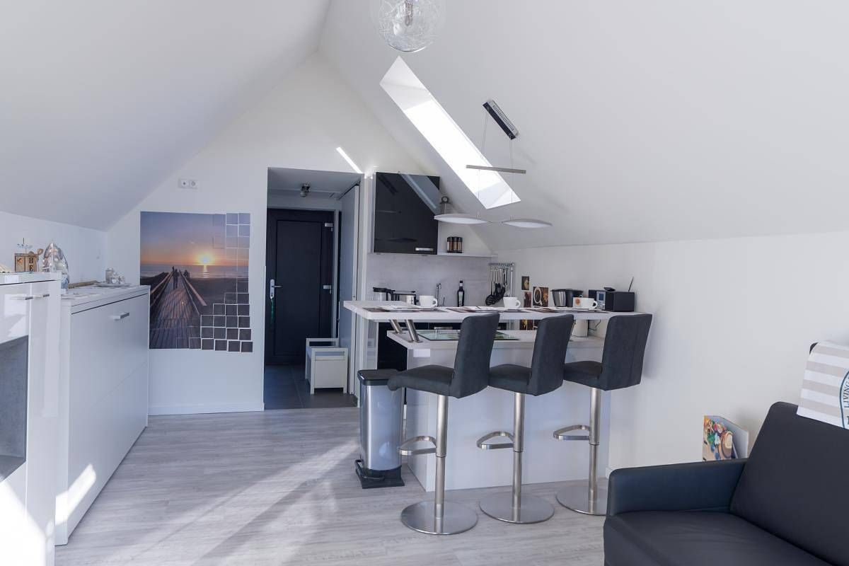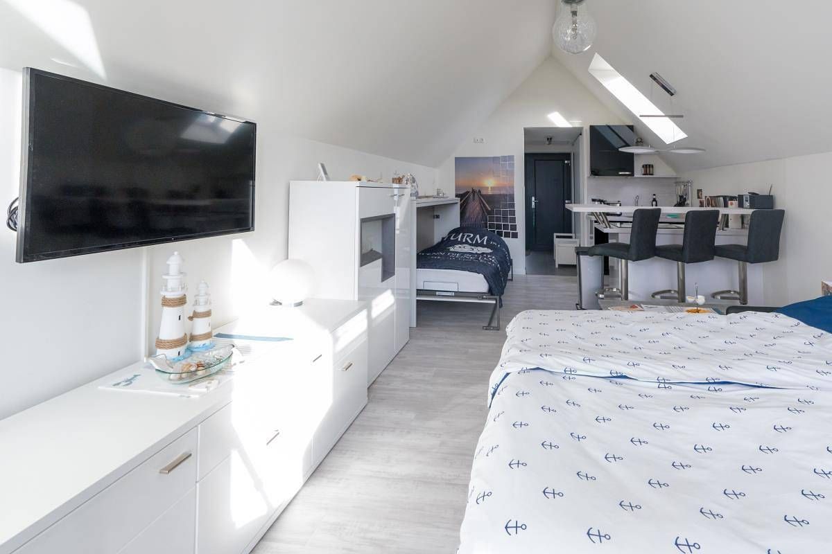 Kleine, aber feine Ferienwohnung ca. 150 m vom Deich entfernt (Erstbezug Dezember 2019). Gleich hinter dem Deich befindet sich die Familienlagune. In der hochwertig mit Markengeräten eingerichteten Küche werden Sie nichts vermissen und können hier Ihr gemütliches Frühstück zubereiten, um es dann bei schönen Wetter auf dem Balkon zu genießen. Die Wohnung bietet Platz für drei Personen (durchgängige Matratze 160x200). Bei schlechtem Wetter machen Sie es sich einfach gemütlich auf dem Schlafsofa mit Gelmatratze und genießen auf dem 40-Zoll TV zum Beispiel eine schöne Serie in UHD-Qualität. Sie haben ein Abspielgerät mit HDMI-Anschluss dabei und wollen Ihre mitgebrachten Filme schauen, das ist auch kein Problem, denn das benötigte Kabel ist schon am TV angeschlossen. Bei der Anreise mit dem eigenen PKW oder Motorrad ist ein persönlicher Stellplatz direkt am Haus. Mitgebrachte Fahrräder können in einem geschlossenen Gemeinschaftsschuppen untergestellt werden.