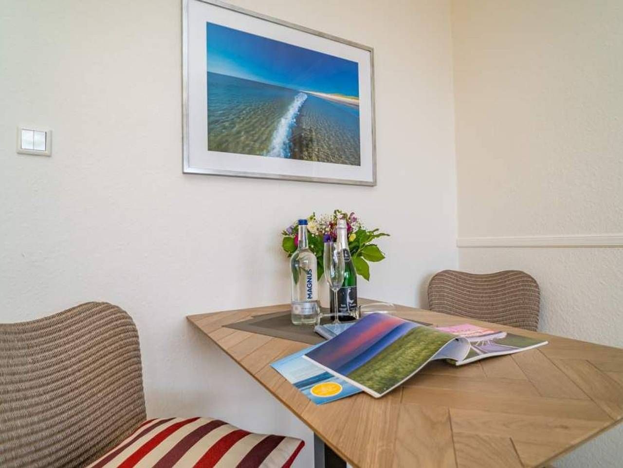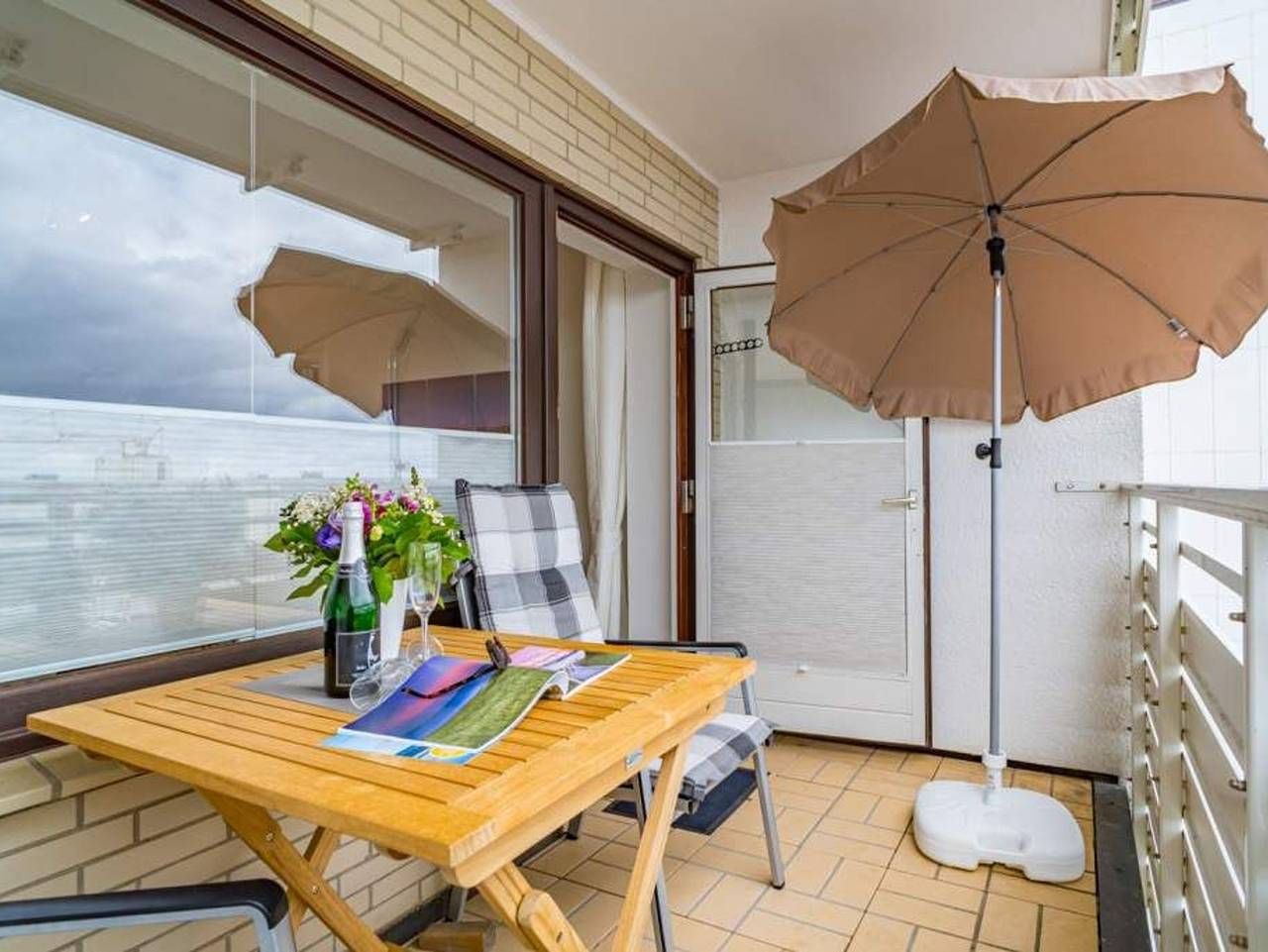 Komfortable Eck-Ferienwohnung inkl. PKW-Stellplatz mit kleinem Meer- [&] Panoramablick über den Südosten von Sylt! Gut ausgestattete, komplett mit Fliesen ausgelegte 2-Zimmer-Nichtraucher-Ferienwohnung, ca. 38 qm, in der 5. Etage mit Ostloggia (Morgensonne, mit Balkonmöbel und Auflagen) für max. 2 Personen. Vom Vorflur mit neuer Einbau-Küchenzeile gelangt man in das Wohnzimmer (mit Austritt zur Loggia) und in das neue Duschbad/WC. Das Wohnzimmer ist mit einer gemütlichen Couchgarnitur, Essplatz und Flachbild-Fernseher ausgestattet. Die neue Küchenzeile inklusive Geschirrspüler, Cerankochfeld (4 Felder), Mikrowelle mit Grillfunktion und Kühlschrank mit 3*-Gefrierfach lässt keine Wünsche offen. Kaffeemaschine, Wasserkocher und Toaster gehören zur Grundausstattung. Das separate Schlafzimmer mit kleinem Meerblick nach Nordwesten bietet ein bequemes Doppelbett (Liegefläche 1,80 x 2,00 mit 2 Einzelmatratzen, Einstieg nur von einer Seite aus möglich) für guten Schlafkomfort. Das moderne Bad ist mit Dusche, Waschtisch, Handtuchtrockner, Fön und[nbsp][nbsp]Kosmetikspiegel komplett ausgestattet. Im Haus befindet sich ein Fahrstuhl, der über 1/2 Etage zu Fuß erreichbar ist. Ein PKW-Stellplatz ist inklusive. Das Mitbringen eines Haustieres ist in dieser Ferienwohnung nicht gestattet.