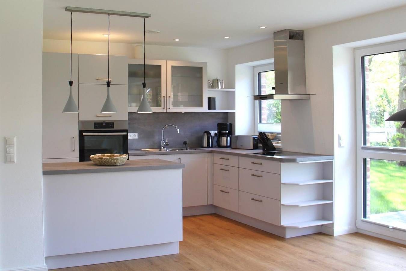 - komplette Küche mit Geschirrspüler, Backofen, Induktionsfeld, Mikrowelle, Kühlschrank, Gefrierschrank, Kaffeemaschine, Wasserkocher, Toaster