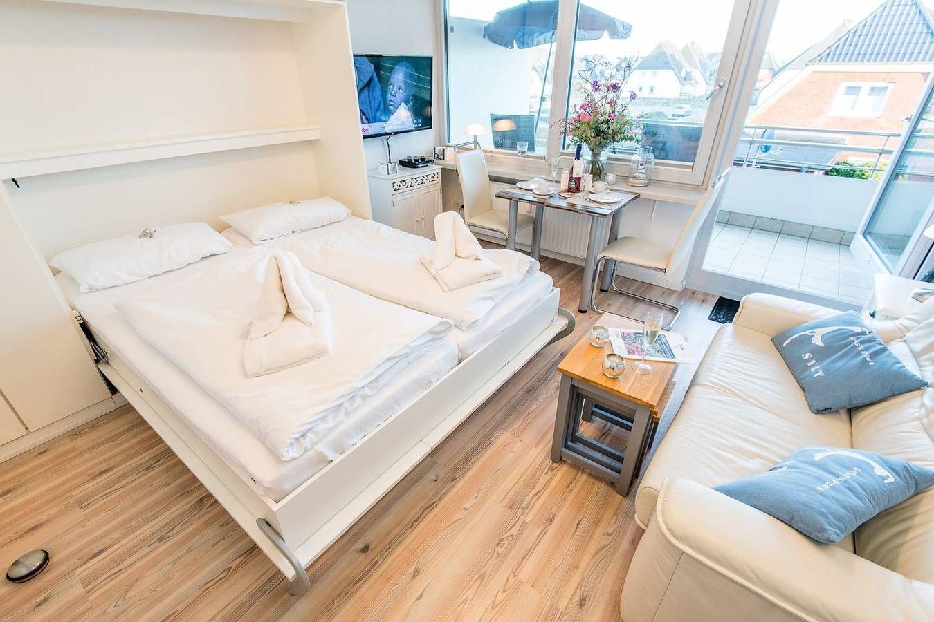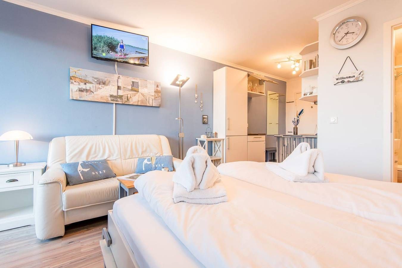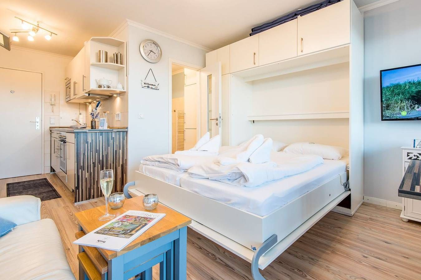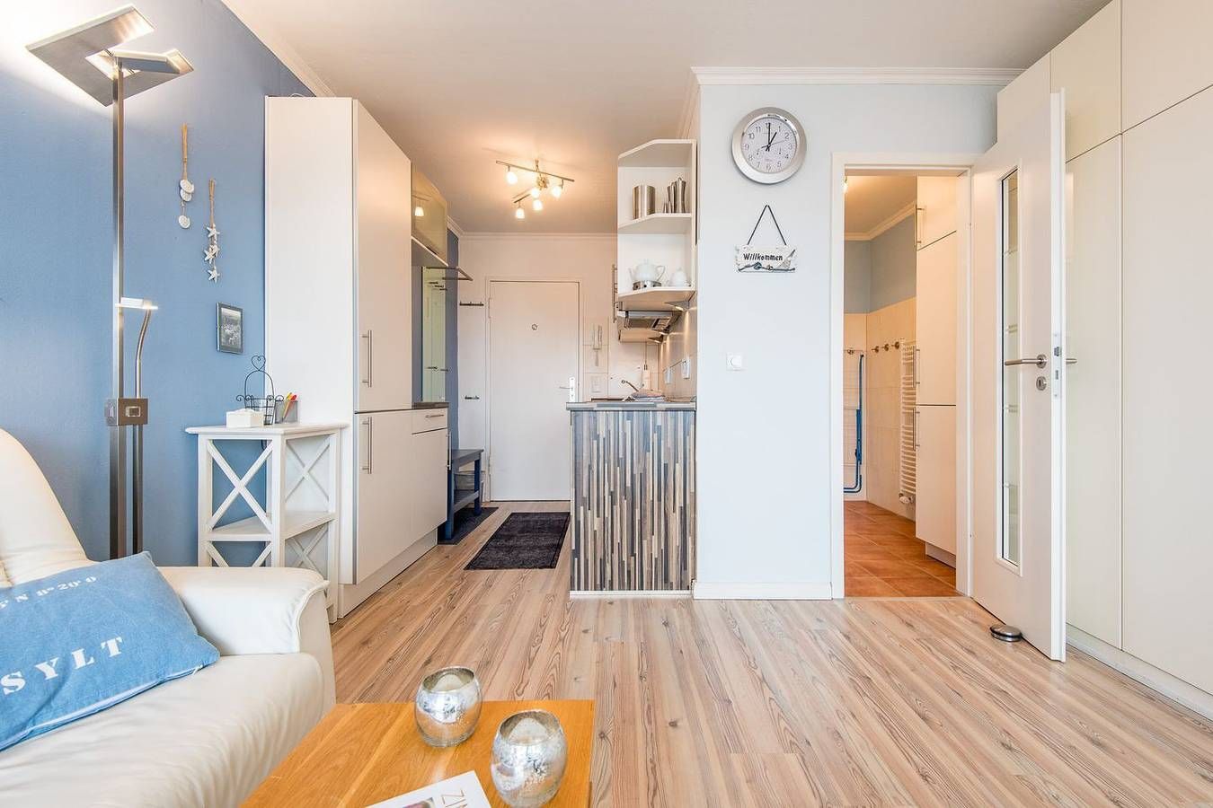 MODERNE 1-ZIMMER-FERIENWOHNUNG IN WENNINGSTEDT – BESTE LAGE AM STRANDÜBERGANG FÜR BIS ZU 2 PERSONEN Diese modernisierte 1-Zimmer-Ferienwohnung auf ca. 28 qm bietet alles, was Sie für einen erholsamen Urlaub auf Sylt benötigen. Die Wohnung liegt direkt am beliebten Strandübergang in der Seestraße, näher am Meer geht es kaum. Ideal für Paare oder Alleinreisende, die einen entspannten Aufenthalt in unmittelbarer Nähe zum Strand suchen. **WOHN- UND SCHLAFBEREICH** Der Wohn-/Schlafbereich ist mit einem komfortablen Schrankbett (160x200 cm) ausgestattet, das tagsüber dezent verstaut werden kann, um den Raum optimal zu nutzen. Ein TV sorgt für Unterhaltung, und die gemütliche Essecke mit zwei Stühlen bietet Platz für gemeinsame Mahlzeiten. Der direkte Zugang zum möblierten Ostbalkon lädt dazu ein, die Morgensonne zu genießen und frische Meeresluft zu tanken. **MODERNE KÜCHE** Die offene Einbauküche ist mit allem nötigen Komfort ausgestattet, inklusive Geschirrspüler, Mikrowelle, Backofen und Kochfeld. Hier können Sie unkompliziert Mahlzeiten zubereiten und sich wie zu Hause fühlen. **KOMFORTABLES BADEZIMMER** Das moderne Badezimmer ist mit einer Dusche und einem WC ausgestattet. Die funktionale Gestaltung bietet Ihnen den nötigen Komfort für Ihren Aufenthalt. **PRAKTISCHE EXTRAS** Das Haus verfügt über einen Fahrstuhl, der den Zugang zur Wohnung besonders bequem macht. WLAN (ohne Gewähr) ist vorhanden, sodass Sie auch im Urlaub stets vernetzt bleiben können. Haustiere sind in dieser Nichtraucherwohnung nicht erlaubt.
