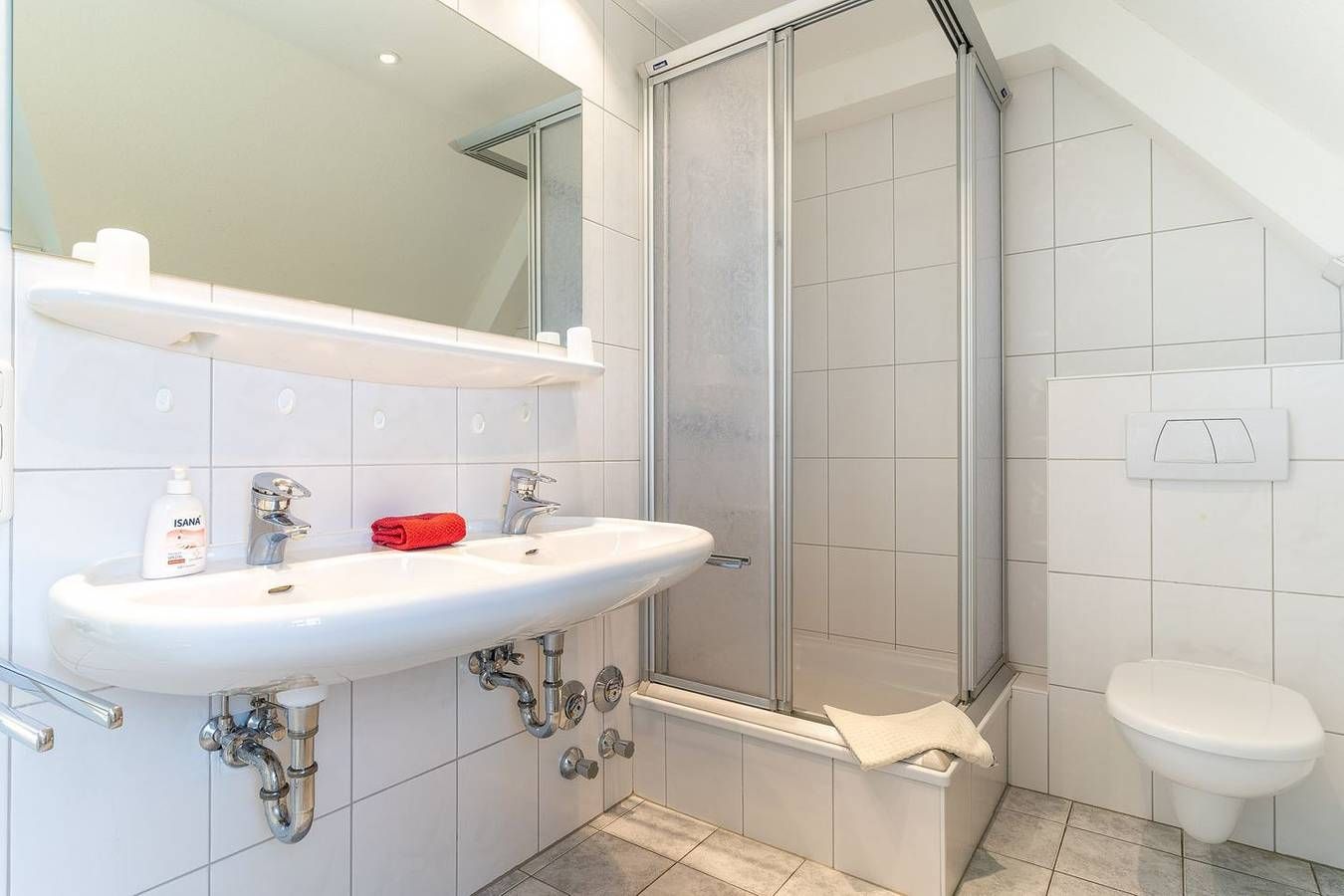 Die 4-Sterne-Maisonette-Wohnung "Hooge 2" ist eine großzügige und geschmackvoll eingerichtete Ferienwohnung, die sich über zwei Etagen erstreckt und über einen separaten Zugang im Obergeschoss des Hauses erreicht wird. Die Wohnung hat eine Grundfläche von ca. 85 m² und bietet somit ausreichend Platz für bis zu 4 Personen. Die zwei Balkone, einer nach Süden und der andere nach Westen ausgerichtet, sind das Highlight der Wohnung. Auf dem Süd-Balkon können Sie die Sonne genießen und auf dem überdachten West-Balkon in der Giebelwand erwartet Sie ein atemberaubender Blick auf die Pfahlbauten am Strand und spektakuläre Sonnenuntergänge. Der Platz auf der Galerie im Obergeschoss ist ein Geheimtipp für Ruhesuchende. Im Wohnzimmer finden Sie eine gemütliche Sofa-Eckkombination, einen Ohrensessel mit Fußbank und einen großen TV-Bildschirm mit DVD- und CD-Player. Der Esstisch bietet Platz für gesellige Abende und in der modernen Küche finden Sie alles, was Sie zum Kochen und Backen benötigen. Backofen mit Grill, Mikrowelle, Toaster, Eierkocher, Kaffeemaschine und zusätzliche Kaffee-Pad-Maschine, Küchenmaschine, Stabmixer, extra leise Spülmaschine, Kühlschrank mit Gefrierfach und natürlich gepflegtes Geschirr - hier bleibt kein Wunsch offen. Auch in der kühleren Jahreszeit fühlen Sie sich in dieser Wohnung rundum wohl. Der hochwertig geflieste Fußboden hat eine Temperierung, ebenso wie das moderne Badezimmer mit Doppelwaschtisch, Regal für Ihre Utensilien, WC und Duschkabine. Ein Fön ist vorhanden. Beide Schlafzimmer sind mit komfortablen Doppelbetten (2 x 90 x 200 cm) ausgestattet, selbstverständlich auch mit Bandscheibenmatratzen und waschbaren Einziehdecken. Ein Schlafzimmer befindet sich auf der Wohnebene, das zweite erreichen Sie über die Galerie in der oberen Etage. Auf dieser Etage befindet komfortabel ein weiteres separates WC mit Waschbecken. Ein bodentiefes großes Fenster im Schlafbereich nach Osten lässt den ersten Sonnenstrahl herein. Besonders eindrucksvoll ist der Ausblick weit über die Marschwiesen. In den Wintermonaten können Sie von hier aus tausende Gänse bestaunen, die auf den Wiesen zur Futtersuche niedergehen. Ein zusätzlicher großer Flachbildschirm im oberen Schlafzimmer, WLAN-fähig und über Ihr Handy bedienbar, lässt keine Langeweile aufkommen. Die Wohnung verfügt auch über einen kleinen Abstellraum, der von der Garderobe aus zu erreichen ist. Hier sind Putzutensilien gut verstaut und auch Ihre Schuhe finden hier ihren Platz. Sämtliche Fenster und auch die Terrassentüren haben hochwertige Insektenschutzgitter. Aus hygienischen Gründen sind Haustiere jeglicher Art nicht gestattet, ebenso das Rauchen in der Wohnung. Die Mindestmietdauer in der Hauptsaison beträgt 7 Übernachtungen.
