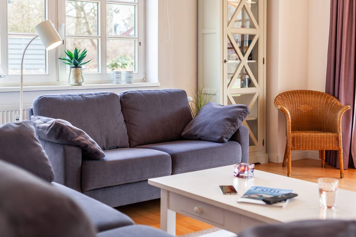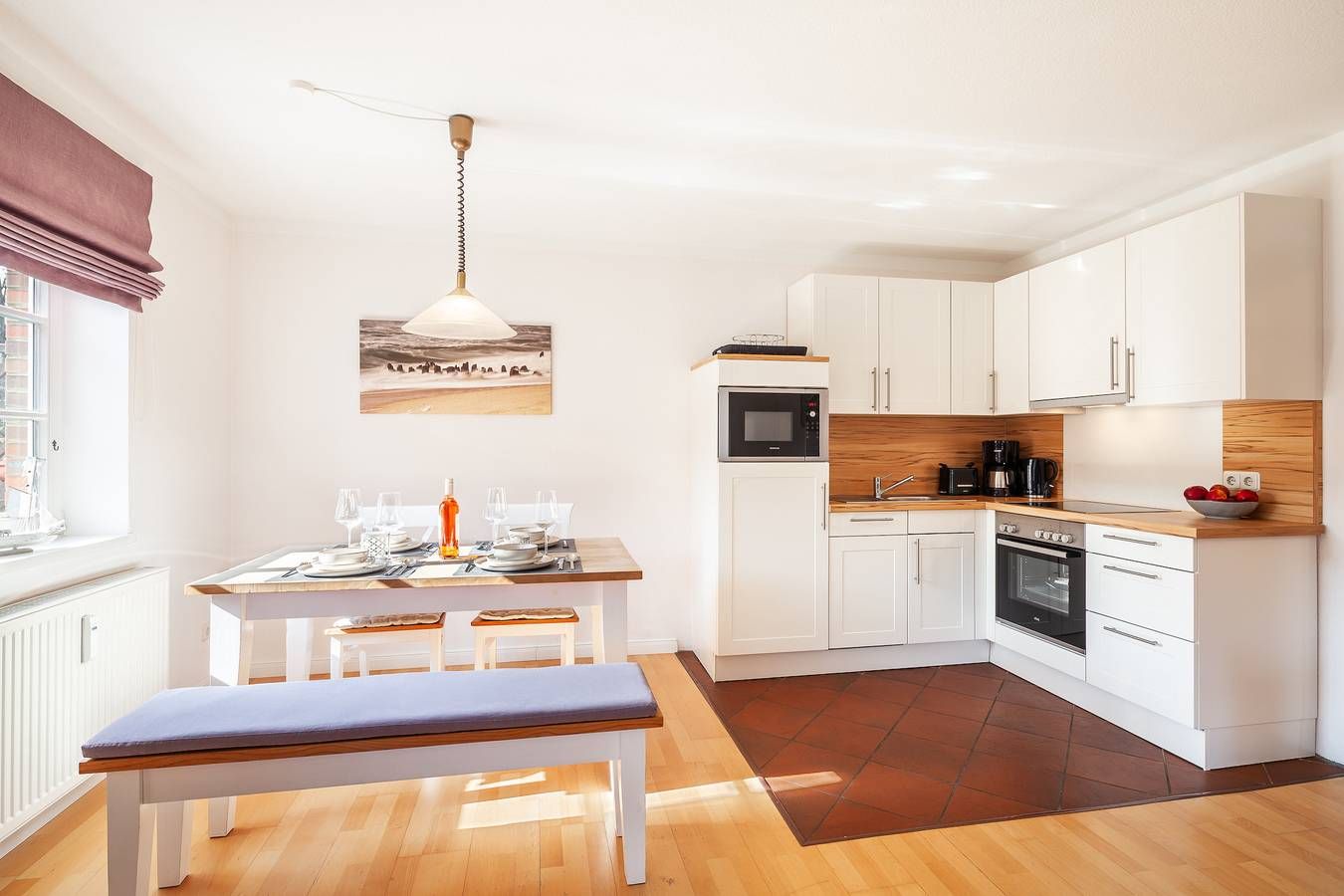 Die Erdgeschosswohnung Nr. 2 bietet Platz für zwei bis drei Personen. Ein großzügiges und helles Wohnzimmer mit bequemen Sofas, ein Essplatz sowie eine moderne Küchenecke lassen keine Wünsche offen. Vom Wohnzimmer aus geht es direkt auf die windgeschützte Südterrasse mit [nbsp]Mobiliar. Ein Schlafzimmer mit hochwertigem Boxspringbett, ein Ruheraum im Souterrain sowie ein Duschbad mit Fenster gehören ebenfalls zur Wohnung. Im Gemeinschaftskeller befinden sich Sauna und Waschmaschine/ Trockner (Münzer). Zum Strand sind es wenige Minuten zu Fuß, ebenfalls zur Surfschule, Bäcker und Bushaltestelle sind ebenfalls mühelos zu Fuß erreichbar.