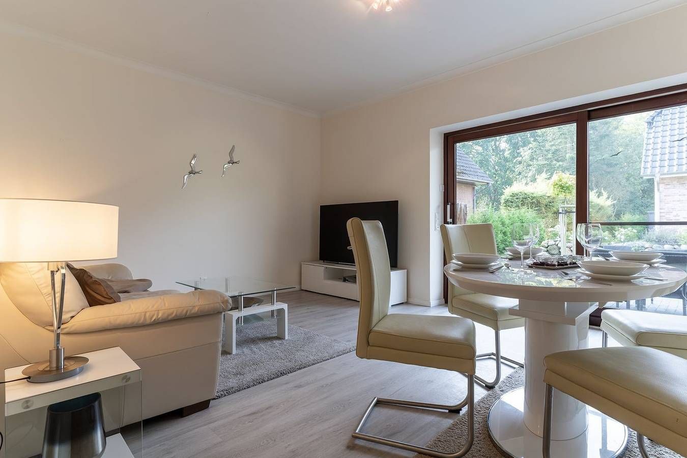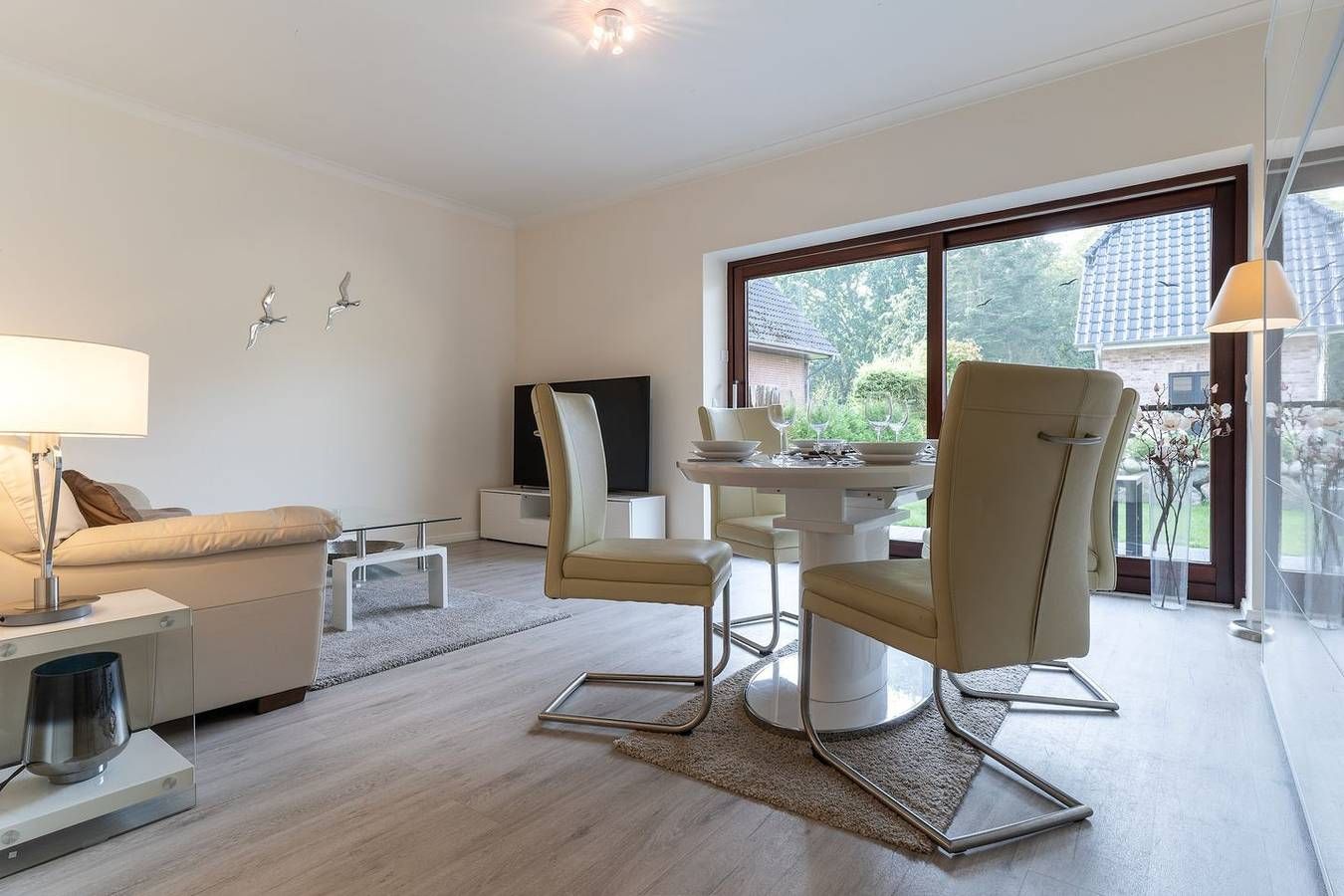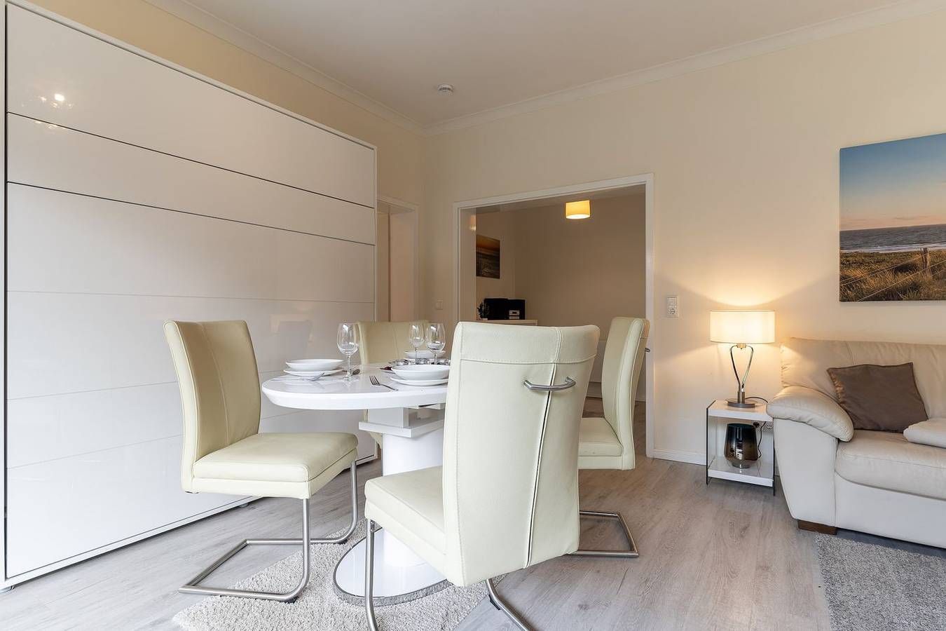 Die 62m² große Ferienwohnung, welche im Jahr 2020 vollständig saniert wurde, liegt im Erdgeschoss und bietet bis zu 4 Personen Platz für einen unvergesslichen Urlaub in St. Peter-Ording. Durch die Lage und Ausstattung ist die Ferienwohnung besonders familienfreundlich, Kinder sind hier herzlich willkommen. Durch die tolle Erdgeschosslage eignet sich die Ferienunterkunft wunderbar für mobilitätseingeschränkte Gäste. Die Ferienwohnung verfügt über eine nach Südwesten hin ausgerichtete, vollständig möblierte, überdachte Terrasse. Neben der Terrasse steht den Gästen ein kleines Stück Garten zur Verfügung. Hier genießen Sie bei Abendsonne ein herrliches Beisammensein im Freien. Auch der Urlaub mit Hund ist in der modernen Ferienwohnung hier möglich, bis zu 2 Hunde begleiten die Familie in den Urlaub nach St. Peter Ording. Das moderne Wohnzimmer wirkt durch die große Fensterfront wunderbar hell und freundlich. Zur Ausstattung dort gehören ein edles Ledersofa und der große Esstisch, an dem die ganze Familie Platz findet. Zwei vollwertige Schlafplätze bietet das komfortable und platzsparende Schrankbett. Für die multimediale Unterhaltung sorgen ein großer Flachbild-TV, Radio mit Bluetooth und kostenfreies W-LAN. Für die Versorgung im Urlaub sorgt die vollumfassend ausgestattete Küche der Ferienwohnung. Hier stehen unter anderem Cerankochfeld und Backofen sowie Kühlschrank, Mikrowelle und Nespresso-Maschine bereit. Orangenpresse und Milchaufschäumer gehören ebenfalls zum Inventar. Im hellen, einladenden Schlafzimmer steht ein komfortables 180x200cm Doppelbett zur Verfügung. Zur edlen Ferienwohnung gehören weiterhin Duschbad mit WC, Haartrockner und Schminkspiegel. Alle Fenster der Ferienwohnung sind mit Fliegenschutzgitter und Verdunklungsplissees ausgestattet. Die große Fensterfront ist mit elektrischem Außenrollo ausgestattet, um Licht und Sichtschutz nach Belieben regulieren zu können. Feriengästen steht zudem ein kostenfrei nutzbarer Waschtrockner zur Verfügung.