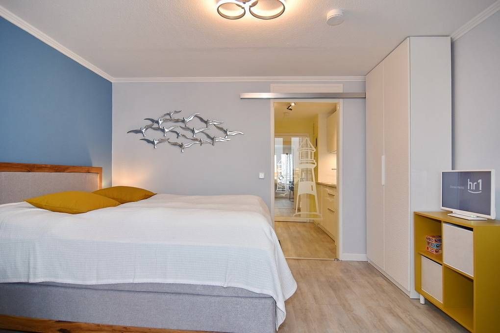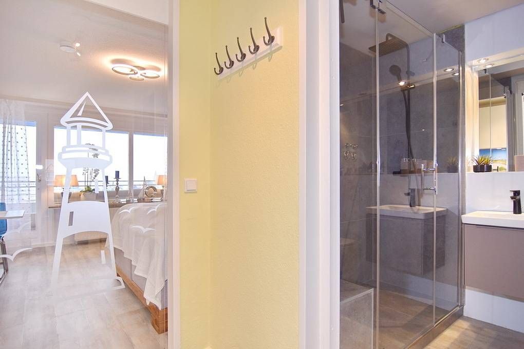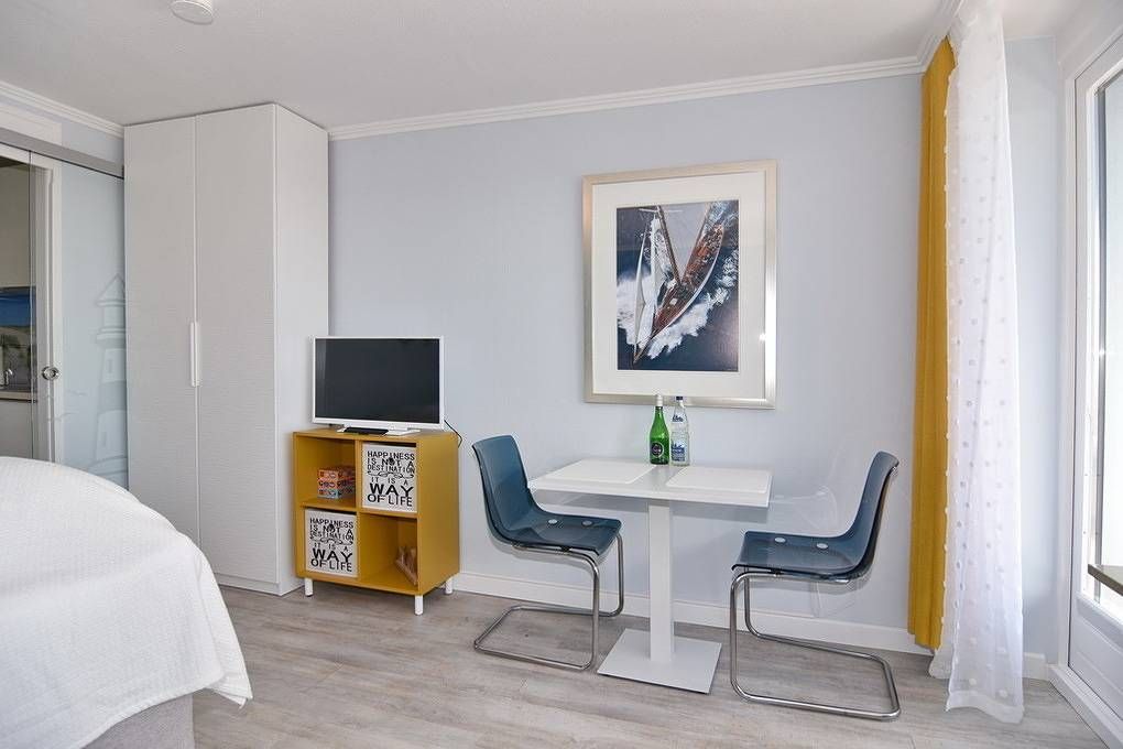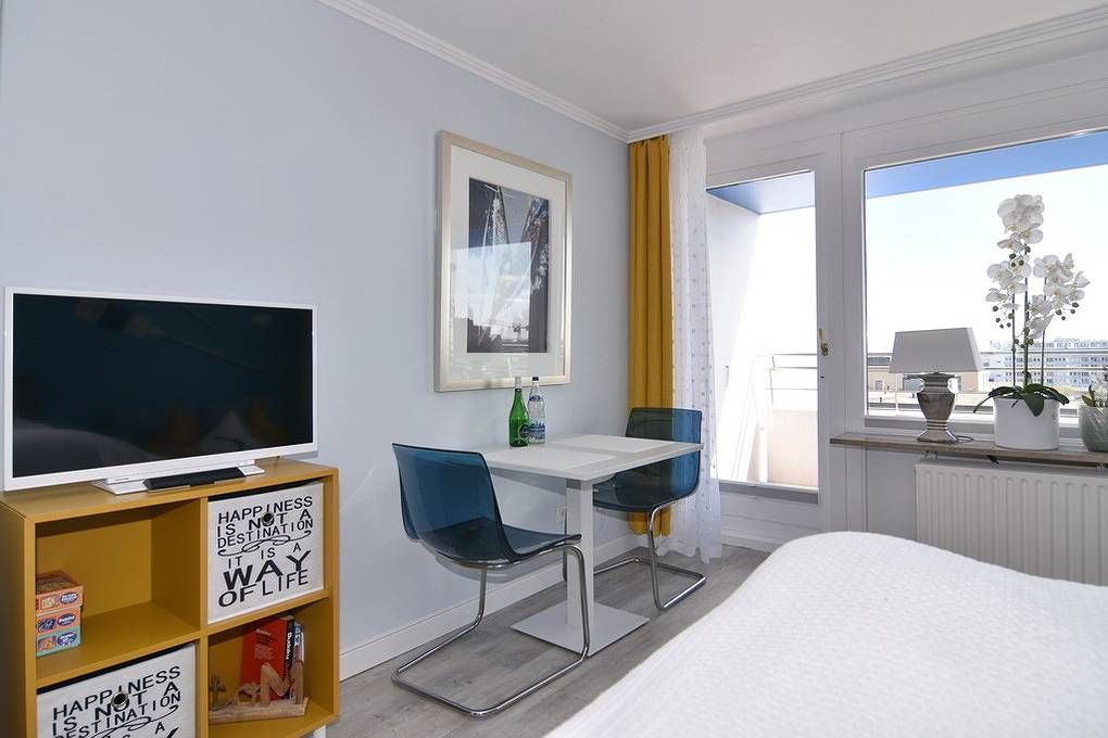 Moderne 1-Zimmer-Ferienwohnung mit ca. 30m² im 6.OG zur Landseite im Haus "Sylter Welle". Nichtraucher-Whg.! Kombinierter Wohn-/Schlafraum mit Boxspringbett (2x80x200 ), 2-Sitzer-Couch, Essplatz für zwei Personen, Flat-TV mit...