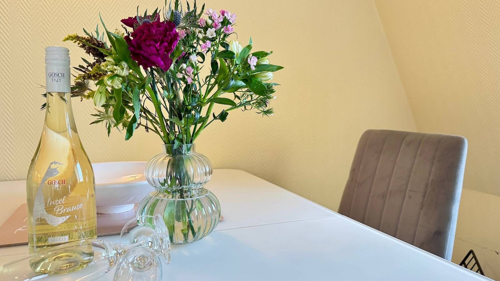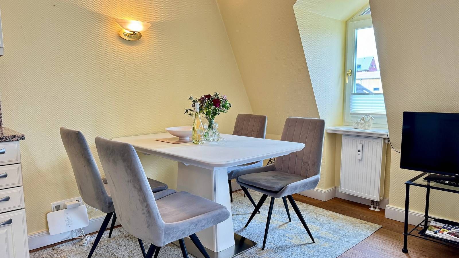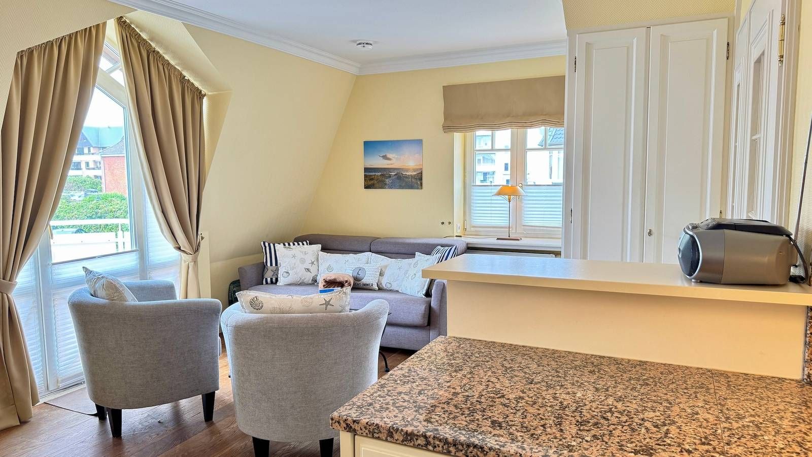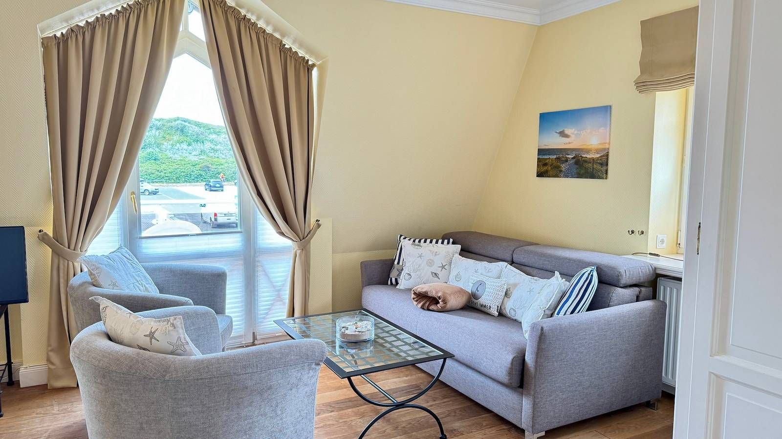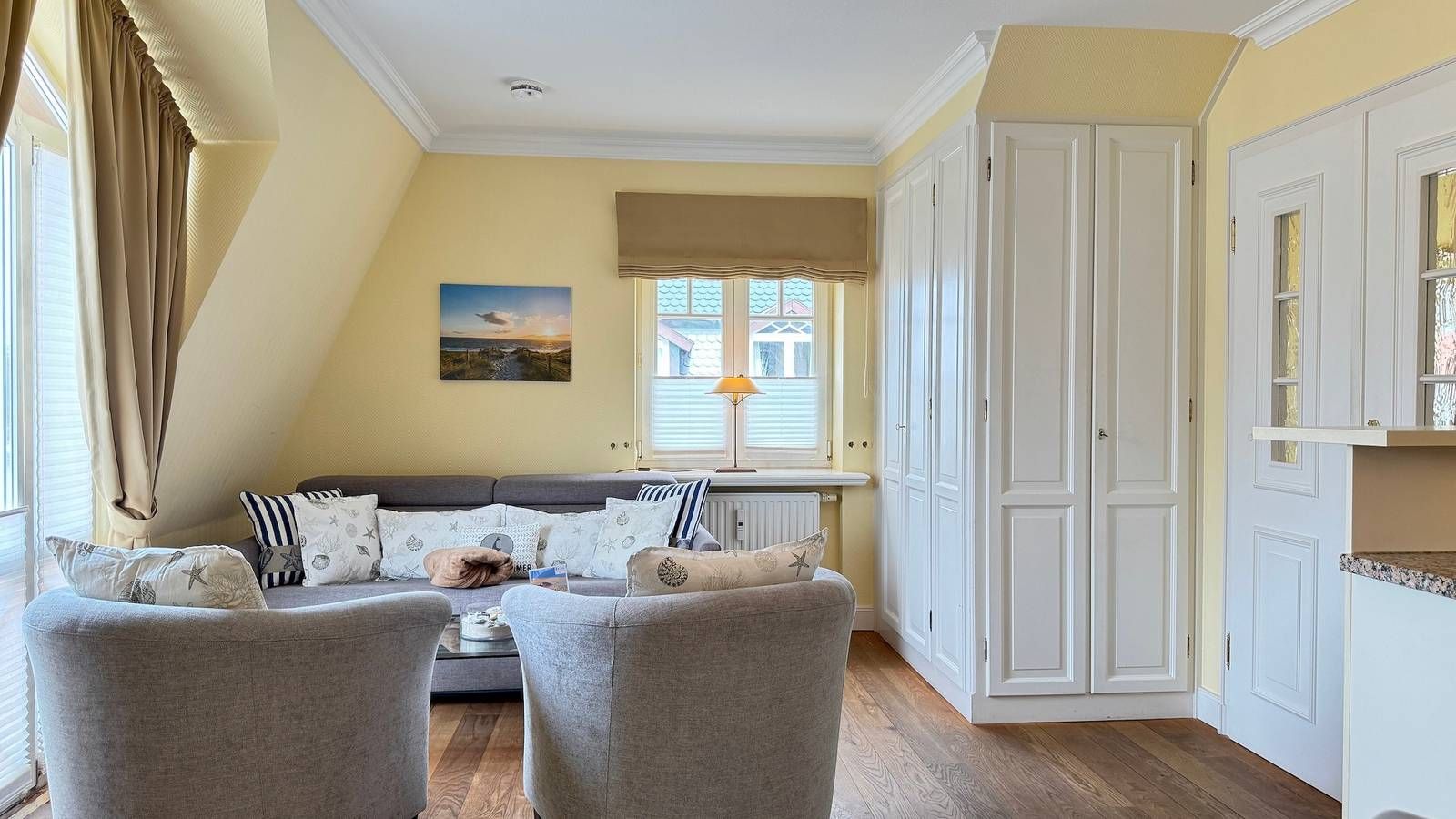 Hübsch möblierte 2-Zimmer-Nichtraucher-Wohnung im Haus 'Syltrose' im OG/DG mit eigenem Eingang. Die Wohnung ist ca. 58 m² groß und ideal für bis zu vier Personen. Das sonnige Wohnzimmer verfügt über eine Schlafcouch, zwei...