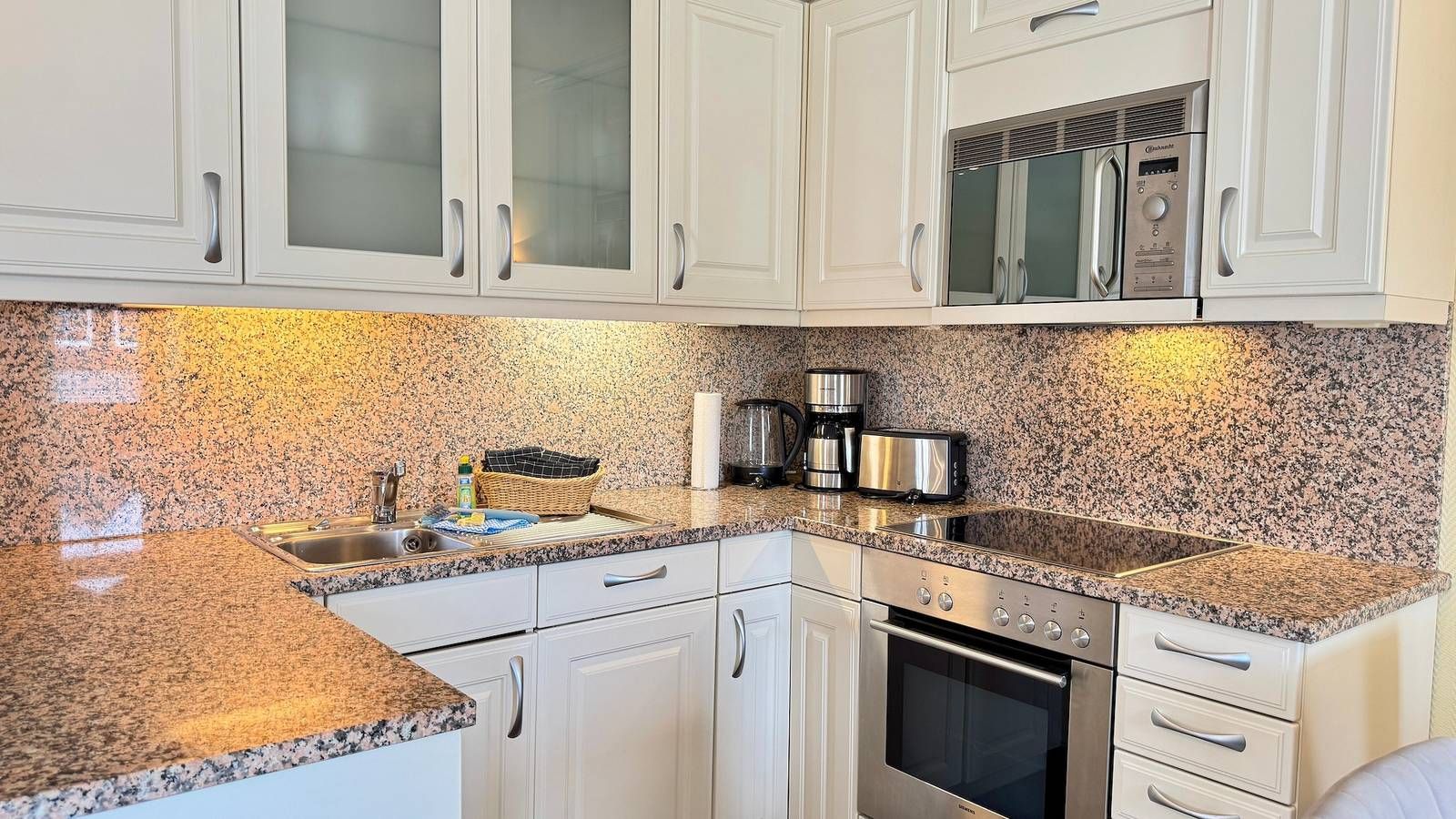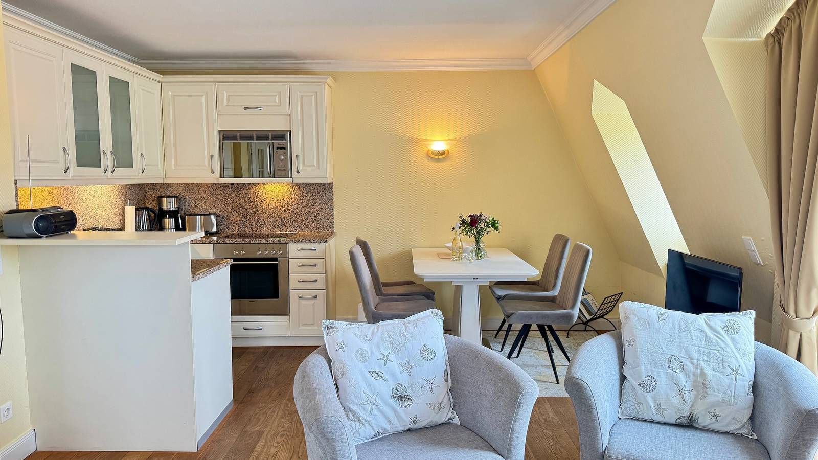 Hübsch möblierte 2-Zimmer-Nichtraucher-Wohnung im Haus 'Syltrose' im OG/DG mit eigenem Eingang. Die Wohnung ist ca. 58 m² groß und ideal für bis zu vier Personen. Das sonnige Wohnzimmer verfügt über eine Schlafcouch, zwei Sessel und eine Essecke. Die offene Küche ist mit Geschirrspüler, Mikrowelle und Backofen ausgestattet. Kabel-TV, Radio und WLAN (ohne Gewähr) sind vorhanden. Auf dem sonnigen Westbalkon können Sie entspannen und die frische Nordseeluft genießen. Im Dachgeschoss befindet sich das Schlafzimmer mit Doppelbett und Flachbild-TV. Zur Wohnung gehört ein PKW-Stellplatz. Waschmaschine und Trockner stehen Ihnen direkt in der Wohnung zur Verfügung. Das Schwimmbad und die Sauna (Münzautomat) im Haus können selbstverständlich genutzt werden. Das Schwimmbad wurde 2025 komplett renoviert und bietet nun ein modernes, komfortables Ambiente zum Wohlfühlen. Mietwäsche (obligatorisch): Das Wäschepaket umfasst: 3x Frottee-Handtücher, 1x großes Duschtuch, 1x Duschvorlage, 2x Geschirrspültücher, 1x Bettlaken, 1x Bettwäsche-Set Verbrauchsmaterialien wie Müllbeutel, Toilettenpapier, Spülmittel und Geschirrspültabs sind als Erstausstattung im Appartement vorhanden. ----In der Sparsaison ''C'' 7 Nächte wohnen - 6 Nächte zahlen----