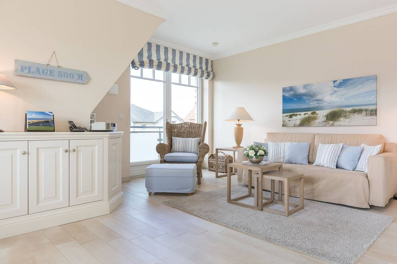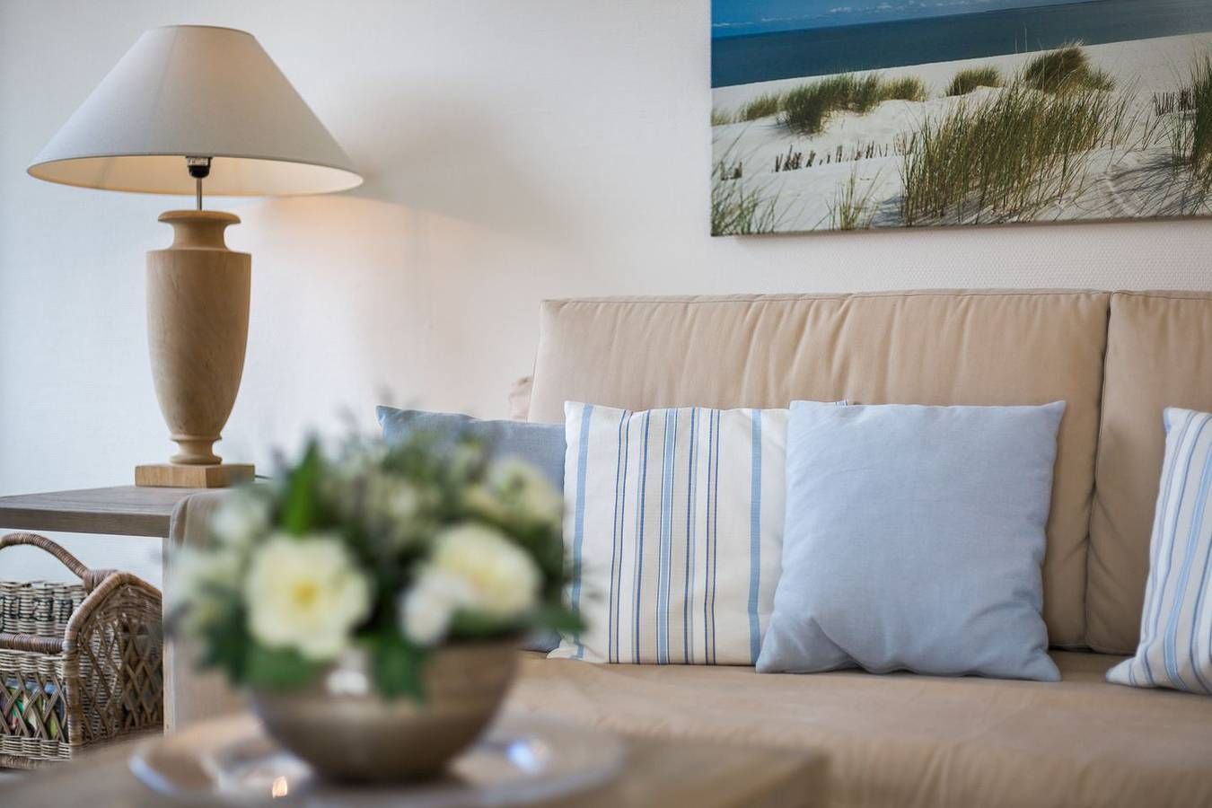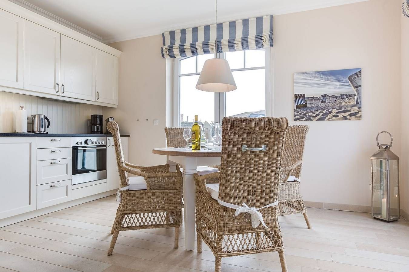Top Lage. Beach-Style Ausstattung. Viel Platz. Alles auf einer Ebene. Edle, warme Beigetöne empfangen Sie in Ihrem Appartement. Ganz gleich ob Ihr Luxusbad mit großer Dusche, die eindrucksvolle Küche oder die wertige, geschmackvolle Beach-Style Möblierung: Sie werden im Appartement Strandleben fantastische Urlaubstage verbringen, die Sie durch Niveau, Stil und Luxus beeindrucken und immer wieder kommen lassen werden. Die Farben und wertigen Materialien lassen Sie stets einen Hauch Strand [&] Meer inhalieren. Der Appartement Name Ihres Domizils ist hier also Programm, im besten Sinne... Domizilaufteilung: In sehr guter Lage, im Herzen Wenningstedts gelegenes, luxuriöses 2-Raum Appartement - alles auf einer Ebene ! Großzügig geschnittene 50 qm Nutzfläche für 2 Personen. OG: Ihren großzügigen, lichtdurchfluteten Wohnbereich werden Sie lieben. Dafür sorgen nicht nur die wunderschönen, hellen Böden, die ein fantastisches Wohnambiente schaffen. Atmosphärisch empfängt Sie in jedem Winkel das Thema Strand [&] Meer. Liebevolle Dekorationen, sehr schöne leichte Kunst an den Wänden und viele, feine Details lassen Sie erkennen, dass hier ein ganz besonderes Wohlfühldomizil für Sie mit Herz konzipiert wurde. Die Technik Ihres Logis ist überkomplett: WLAN,[nbsp][nbsp]großer Flat-TV, Blue Ray Player und ein iPod Dock mit Radio verstehen sich von selbst. Ihre eindrucksvolle Luxusküche bietet Ihnen alles, was die Herzen selbst ambitionierter Hobbyköche höher schlagen lässt. Microwelle, Backofen und Geschirrspüler sind selbstverständlich vorhanden. Ihre feine, integrierte Essecke lädt zu entspannten Rotweinabenden oder XXL-Frühstücks-Sessions ein. Ihr Schlafzimmer mit Doppelbett (180x200cm) ist edel, kuschelig und funktional zugleich: Wertige Tischlereinbauten schaffen viel Schrankplatz, so dass auch ein weiteres Paar Schuhe oder das zweite Lieblingskleid ruhigen Gewissens mit in den Urlaubskoffer dürfen. Der große Flat TV ist geschickt in den Kleiderschrank auf Augenhöhe integriert. Auch hier umweht Sie stets ein Hauch Meeresbrise und Beach - herrrlich. Freuen Sie sich auf ein feines Wellnessbad. Schöne, wertige Materialien schaffen ein tolles Ambiente. In Ihrer große Glasdusche starten Sie beschwingt in den Tag. Eine Waschmaschine und Trockner wurden von kundiger Tischlerhand geschickt in das Bad mit eingebaut. Eine schöne Saunalandschaft mit Dusche, WC und Liegebereich im Untergeschossbereich des Domizils (Nutzung für das gesamte Haus) rundet Ihren perfekten Urlaub im Appartement Strandleben ab. Einen eigenen Parkplatz am Hause finden Sie natürlich ebenfalls vor.