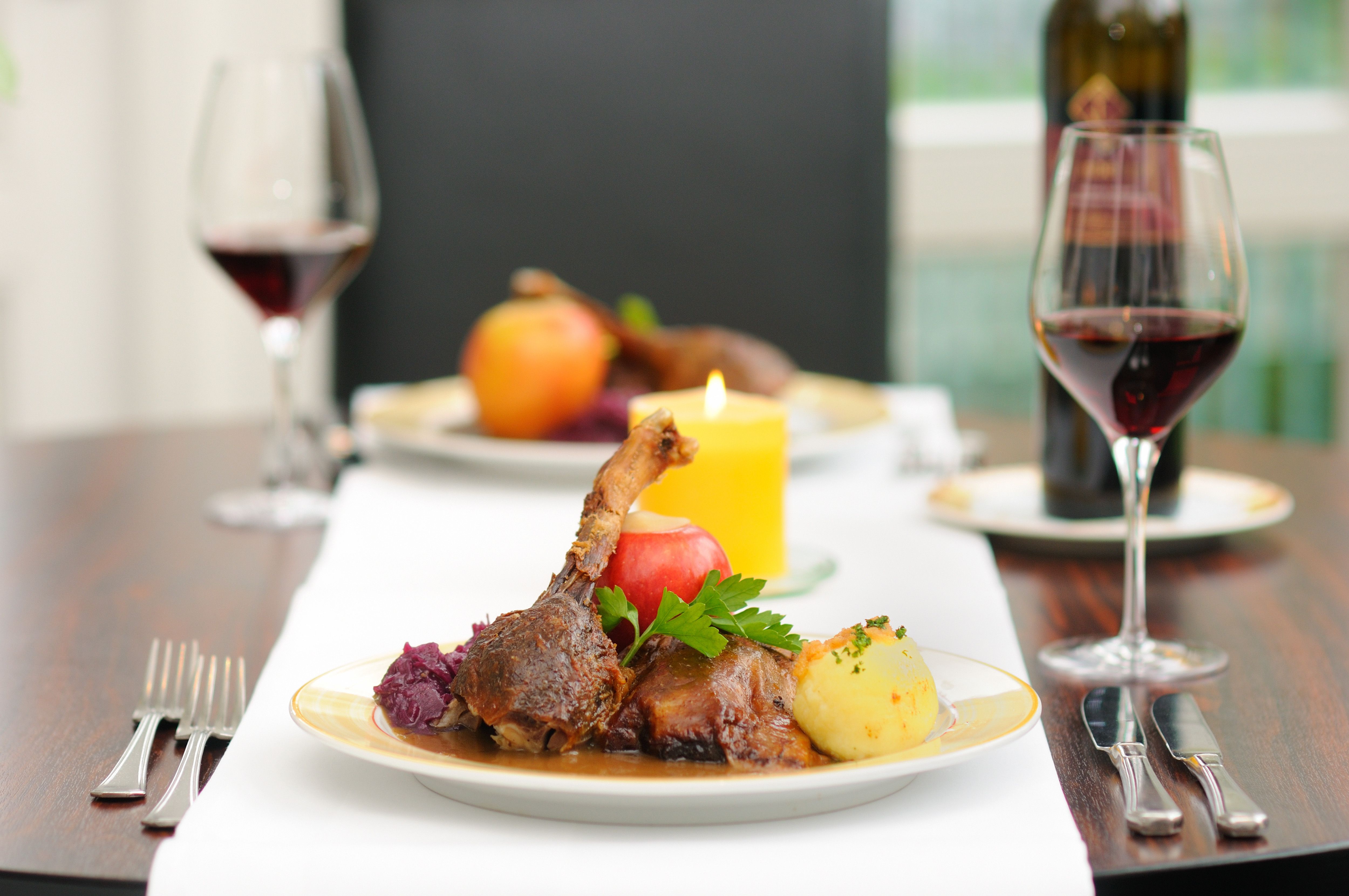 Kulinarisches Herbst-Highlight: Unser Küchenteam bereitet euch auch in diesem Jahr wieder nach altem Brauch eine ofenfrische, fein gefüllte Martinsgans mit traditionellen Beilagen wie Klößen und Rotkohl.