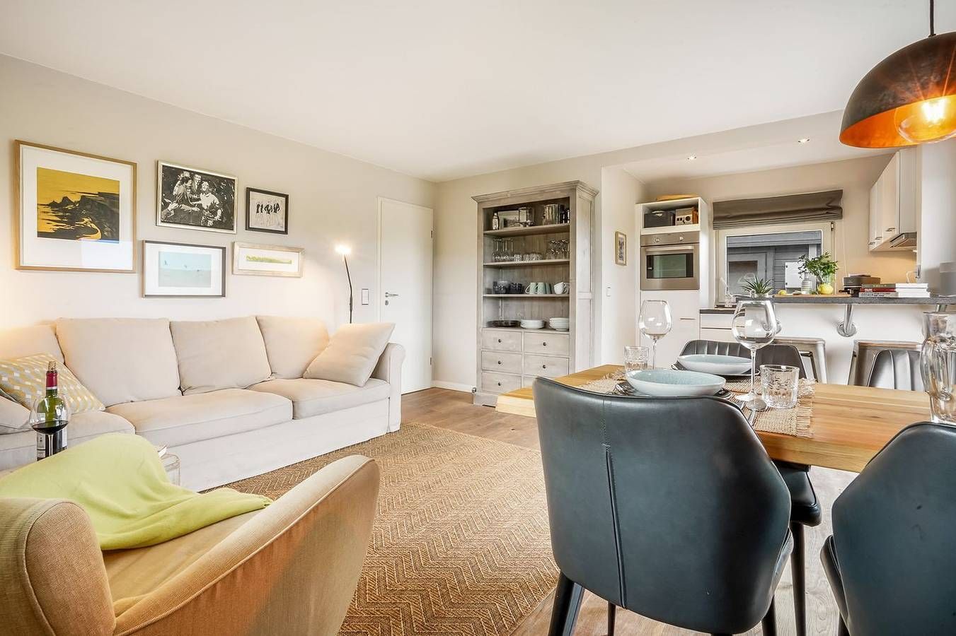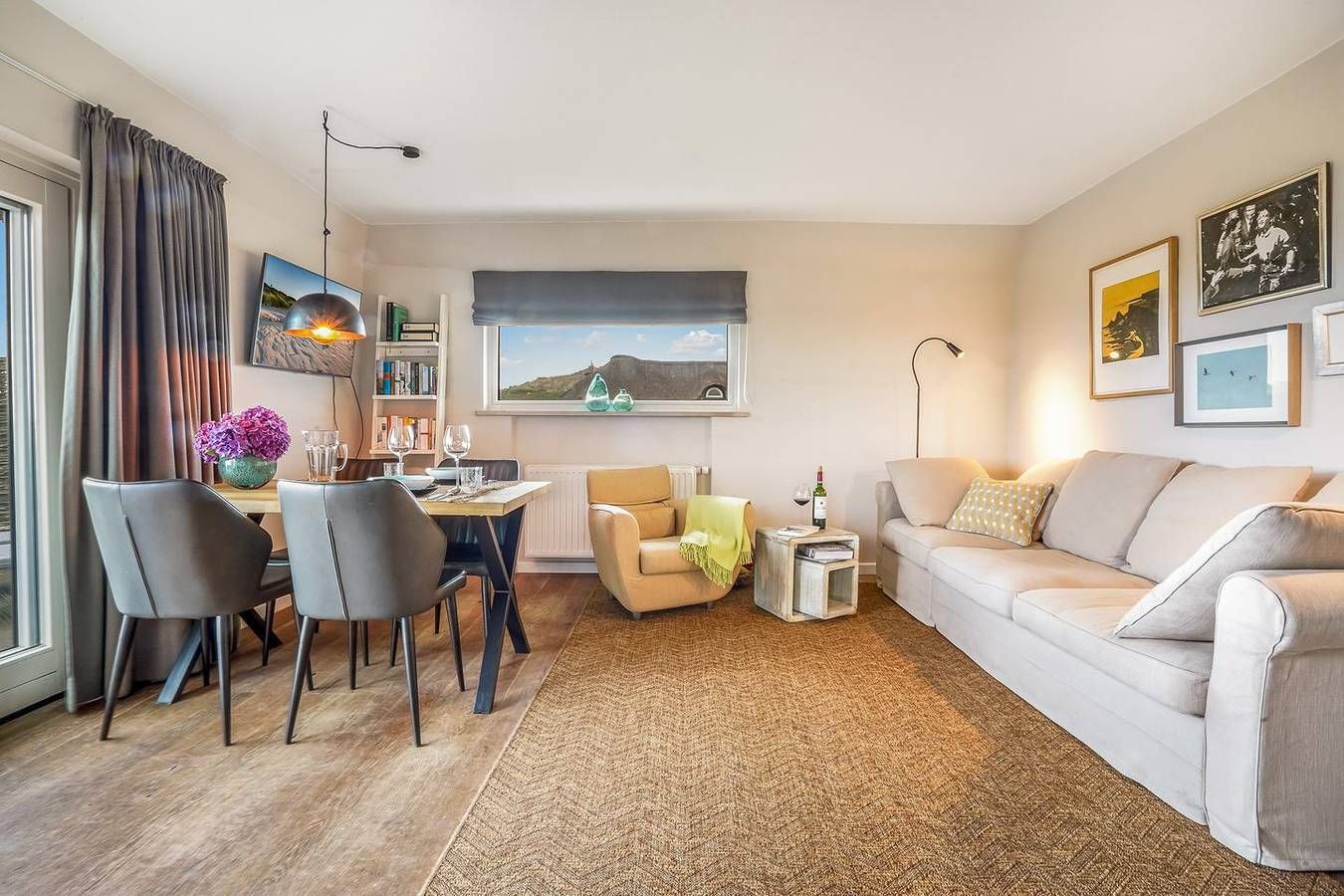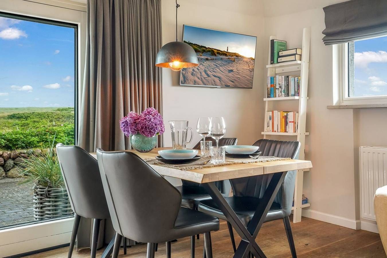 Der helle Wohnbereich mit einer gemütlichen Couch und einem Essbereich bietet dir einen wundervollen Blick auf die Dünen und den Strandübergang. Die vollausgestattete Küche, die in den Wohnbereich integriert ist, verfügt über ein Cerankochfeld, eine Spülmaschine und einen Backofen. Zudem ist sie mit allen nötigen Elektrogeräten ausgestattet, sodass einem gemütlichen Kochabend nichts im Wege steht. Vom Wohnbereich aus erreichst du die großzügige Terrasse mit Gartenmöbeln, einem Strandkorb und Sonnenliegen. Im Garten befindet sich auch das Saunahäuschen, von dem aus du ebenfalls den Blick in die Dünen genießen kannst. Im Erdgeschoss liegt außerdem das moderne Tageslichtbad, welches mit einer ebenerdigen Dusche, einem Waschtisch und einem WC ausgestattet ist. Über eine Treppe gelangst du in das Schlafzimmer, welches mit einem Doppelbett ausgestattet ist. Auch von hier kannst du einen faszinierenden Blick bis zum Meer genießen.
