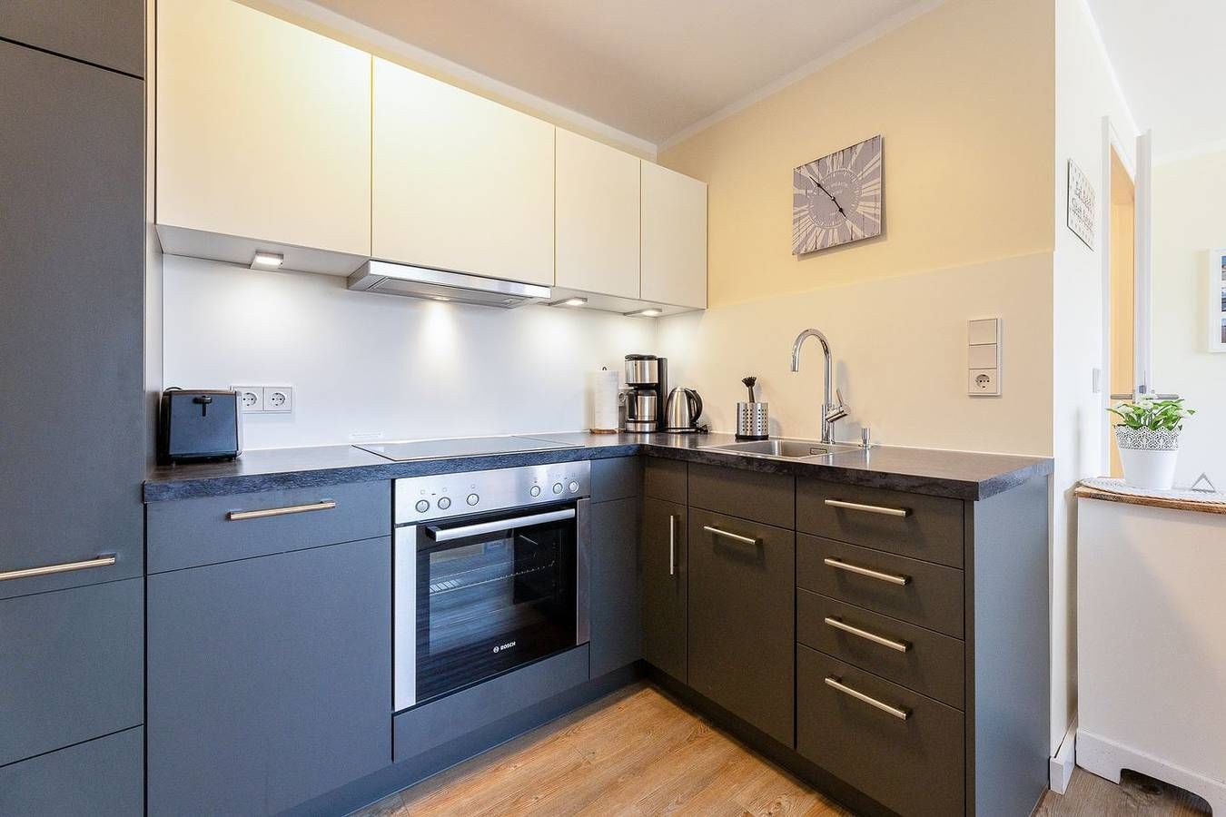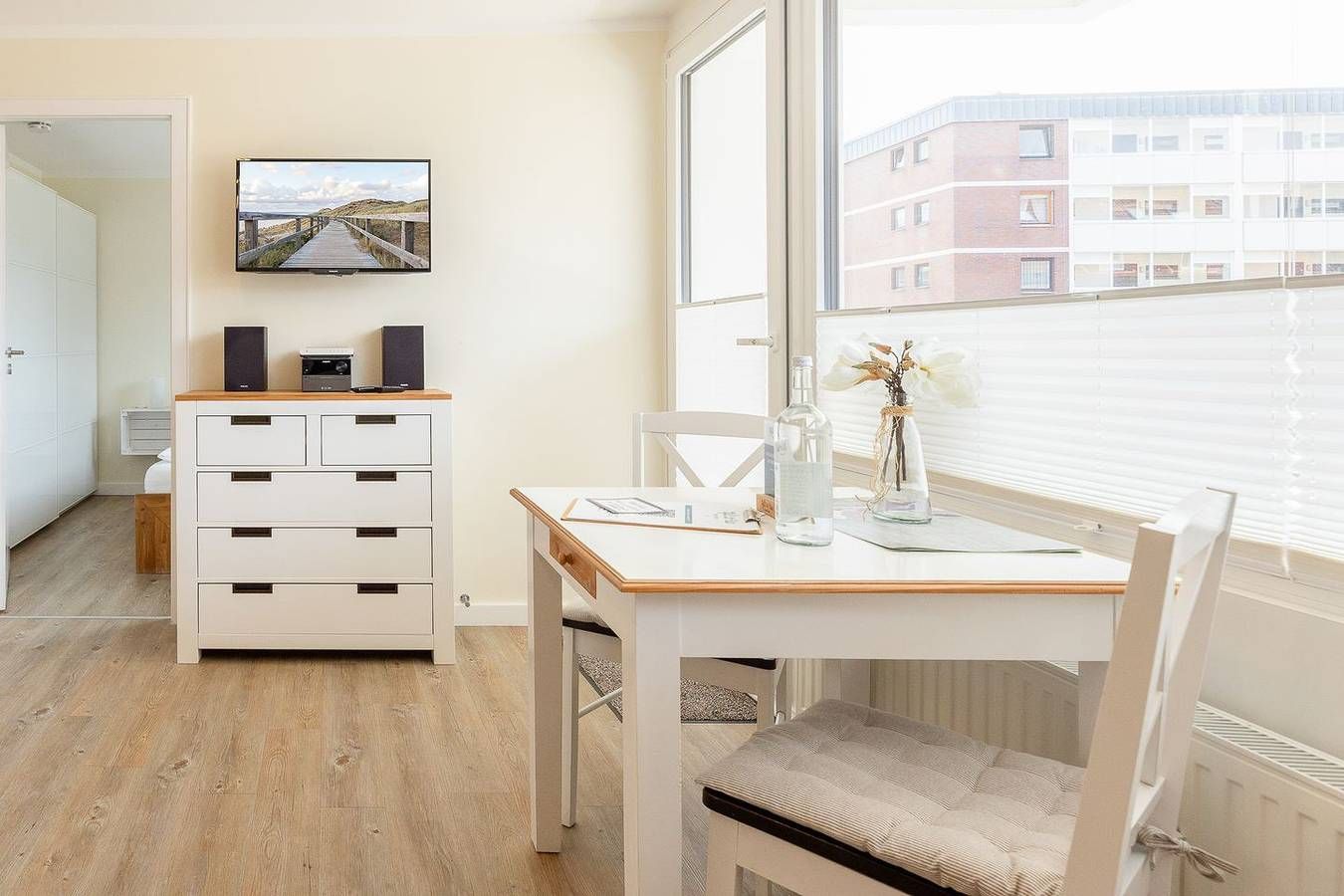 Liebevolle Details und dezente Farbakzente, laden hier auch das Auge zum urlauben ein. Herzstück ist das gemütliche Wohnzimmer mit Couch, offener Küche sowie einem kleinem Essbereich mit Ausblick auf den Westbalkon. Die Küche...