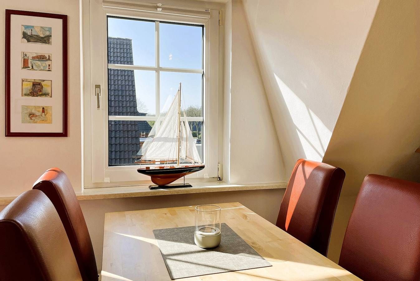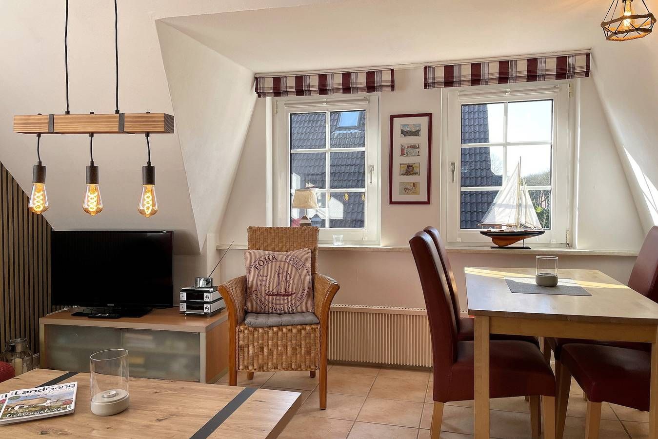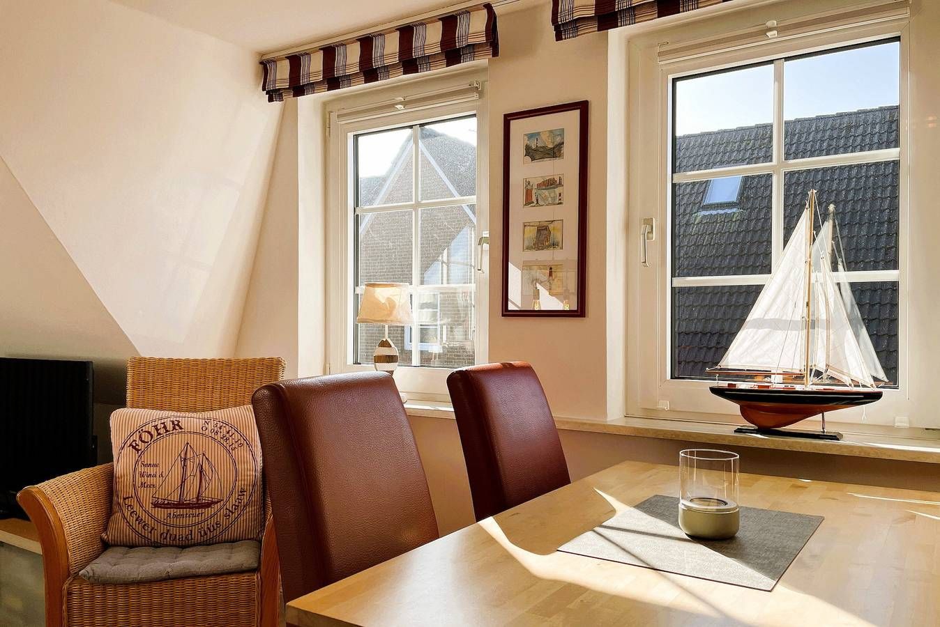 Die Ferienwohnung Uthlande befindet sich in unmittelbarer Nähe zur Wyker Innenstadt, im Starklef 1 und ist dennoch sehr ruhig gelegen. Falls Sie mal nicht das Auto mitnehmen möchten, die Wohnung ist problemlos zu Fuß zu erreichen (20min). Die "Löwenhöhle", ein großer Abendteuerspielplatz, ist fast um die Ecke, auch der Strand ist nicht weit entfernt. Die lichtdurchflutete Wohnung verteilt sich auf 2 Etagen. Im 1. Obergeschoss befinden sich das liebevoll mit kleinen Details dekorierte Wohnzimmer, eine gut ausgestattete Küchenzeile mit Essbereich, ein Badezimmer mit Dusche und ein gemütliches Schlafzimmer mit Doppelbett (160x200 cm) und Kleiderschrank. Über eine robuste Treppe geht’s ins Dachgeschoss. Drei Einzelbetten (90x200cm), ein Kleiderschrank und ein Schreibtisch sowie ein zusätzlicher Fernseher stehen für Sie bereit. Maritim eingerichtet präsentiert sich dieser Raum nicht nur als Schlafraum sondern auch als Wohlfühlraum, wenn Sie sich mal zurückziehen wollen. Für Schietwedder-Tage haben wir für die Großen und Kleinen Gesellschaftsspiele, Bücher, Kabel TV und Stereoanlage, falls mal Langeweile aufkommen sollte. Frühstück im Bett oder doch lieber im angrenzenden Garten? – Beides ist möglich! Der Garten bietet neben einer Sandkiste und einer Schaukel auch eine Sitzecke mit Strandkorb. Hier besteht die Möglichkeit auch zu grillen. Der komfortable Wohnbereich ist ausgestattet mit WLAN, Kabel-Smart TV, DVD-Player und Stereoanlage. In der Küchenzeile werden Sie eine große Auswahl an Hilfsmittel finden. Es sind ein Geschirrspüler, eine Mikrowelle, ein Backofen, eine Kaffeemaschine, ein Wasserkocher und eine Espressomaschine vorhanden. Durch die gut gestaltete Raumaufteilung finden besonders Familien mit Kindern genügend Platz. Sollten Sie mit weniger Personen anreisen, ist die Wohnung keinesfalls zu groß. Unsere "Uthlande" ist vielfältig, egal ob für zwei bis fünf Erwachsene oder Kinder. Überzeugen Sie sich selbst. Sollte das norddeutsche Wetter mal nicht mitspielen, wäre das gegenüber liegende Friesenmuseum eine willkommene Abwechslung oder Sie suchen das 750m entfernte Wellenbad "Aqua Föhr" auf. Alles weitere, wie Cafés, Restaurants und Einkaufsmöglichkeiten finden Sie in der Innenstadt. Wir würden uns freuen Sie bald, in unserer gemütlichen Ferienwohnung, begrüßen zu dürfen.