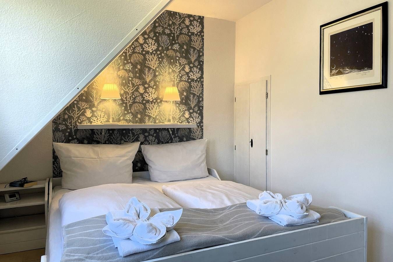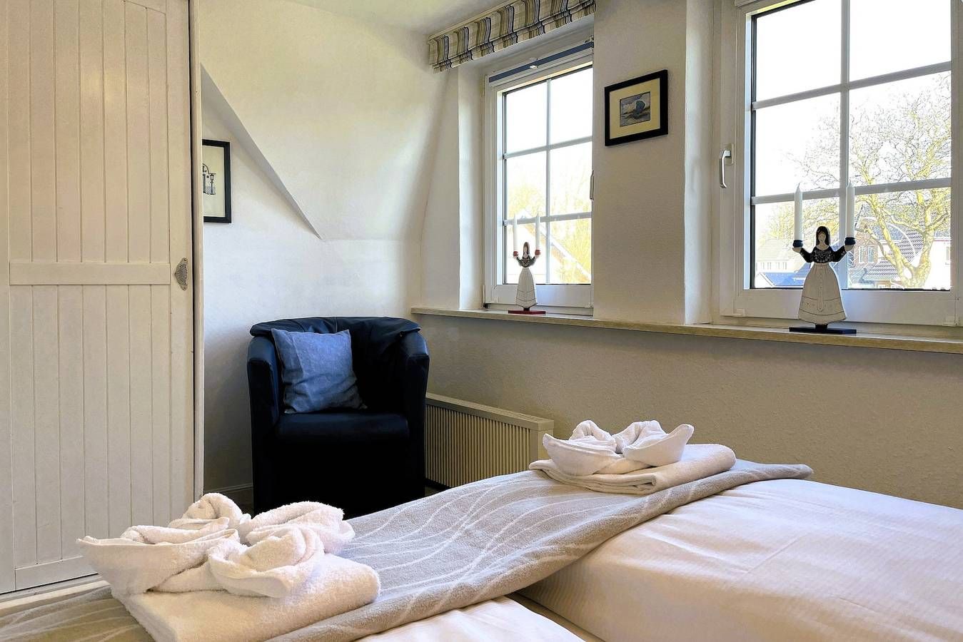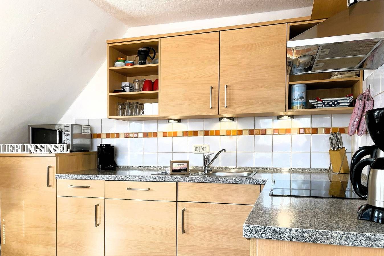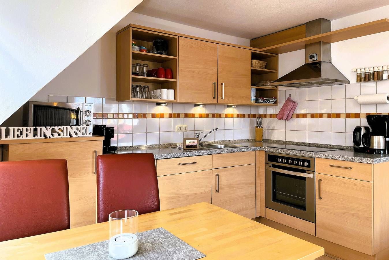 Die Ferienwohnung Uthlande befindet sich in unmittelbarer Nähe zur Wyker Innenstadt, im Starklef 1 und ist dennoch sehr ruhig gelegen. Falls Sie mal nicht das Auto mitnehmen möchten, die Wohnung ist problemlos zu Fuß zu erreichen (20min). Die "Löwenhöhle", ein großer Abendteuerspielplatz, ist fast um die Ecke, auch der Strand ist nicht weit entfernt. Die lichtdurchflutete Wohnung verteilt sich auf 2 Etagen. Im 1. Obergeschoss befinden sich das liebevoll mit kleinen Details dekorierte Wohnzimmer, eine gut ausgestattete Küchenzeile mit Essbereich, ein Badezimmer mit Dusche und ein gemütliches Schlafzimmer mit Doppelbett (160x200 cm) und Kleiderschrank. Über eine robuste Treppe geht’s ins Dachgeschoss. Drei Einzelbetten (90x200cm), ein Kleiderschrank und ein Schreibtisch sowie ein zusätzlicher Fernseher stehen für Sie bereit. Maritim eingerichtet präsentiert sich dieser Raum nicht nur als Schlafraum sondern auch als Wohlfühlraum, wenn Sie sich mal zurückziehen wollen. Für Schietwedder-Tage haben wir für die Großen und Kleinen Gesellschaftsspiele, Bücher, Kabel TV und Stereoanlage, falls mal Langeweile aufkommen sollte. Frühstück im Bett oder doch lieber im angrenzenden Garten? – Beides ist möglich! Der Garten bietet neben einer Sandkiste und einer Schaukel auch eine Sitzecke mit Strandkorb. Hier besteht die Möglichkeit auch zu grillen. Der komfortable Wohnbereich ist ausgestattet mit WLAN, Kabel-Smart TV, DVD-Player und Stereoanlage. In der Küchenzeile werden Sie eine große Auswahl an Hilfsmittel finden. Es sind ein Geschirrspüler, eine Mikrowelle, ein Backofen, eine Kaffeemaschine, ein Wasserkocher und eine Espressomaschine vorhanden. Durch die gut gestaltete Raumaufteilung finden besonders Familien mit Kindern genügend Platz. Sollten Sie mit weniger Personen anreisen, ist die Wohnung keinesfalls zu groß. Unsere "Uthlande" ist vielfältig, egal ob für zwei bis fünf Erwachsene oder Kinder. Überzeugen Sie sich selbst. Sollte das norddeutsche Wetter mal nicht mitspielen, wäre das gegenüber liegende Friesenmuseum eine willkommene Abwechslung oder Sie suchen das 750m entfernte Wellenbad "Aqua Föhr" auf. Alles weitere, wie Cafés, Restaurants und Einkaufsmöglichkeiten finden Sie in der Innenstadt. Wir würden uns freuen Sie bald, in unserer gemütlichen Ferienwohnung, begrüßen zu dürfen.