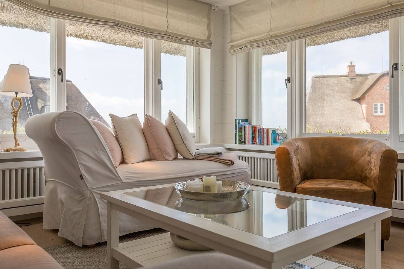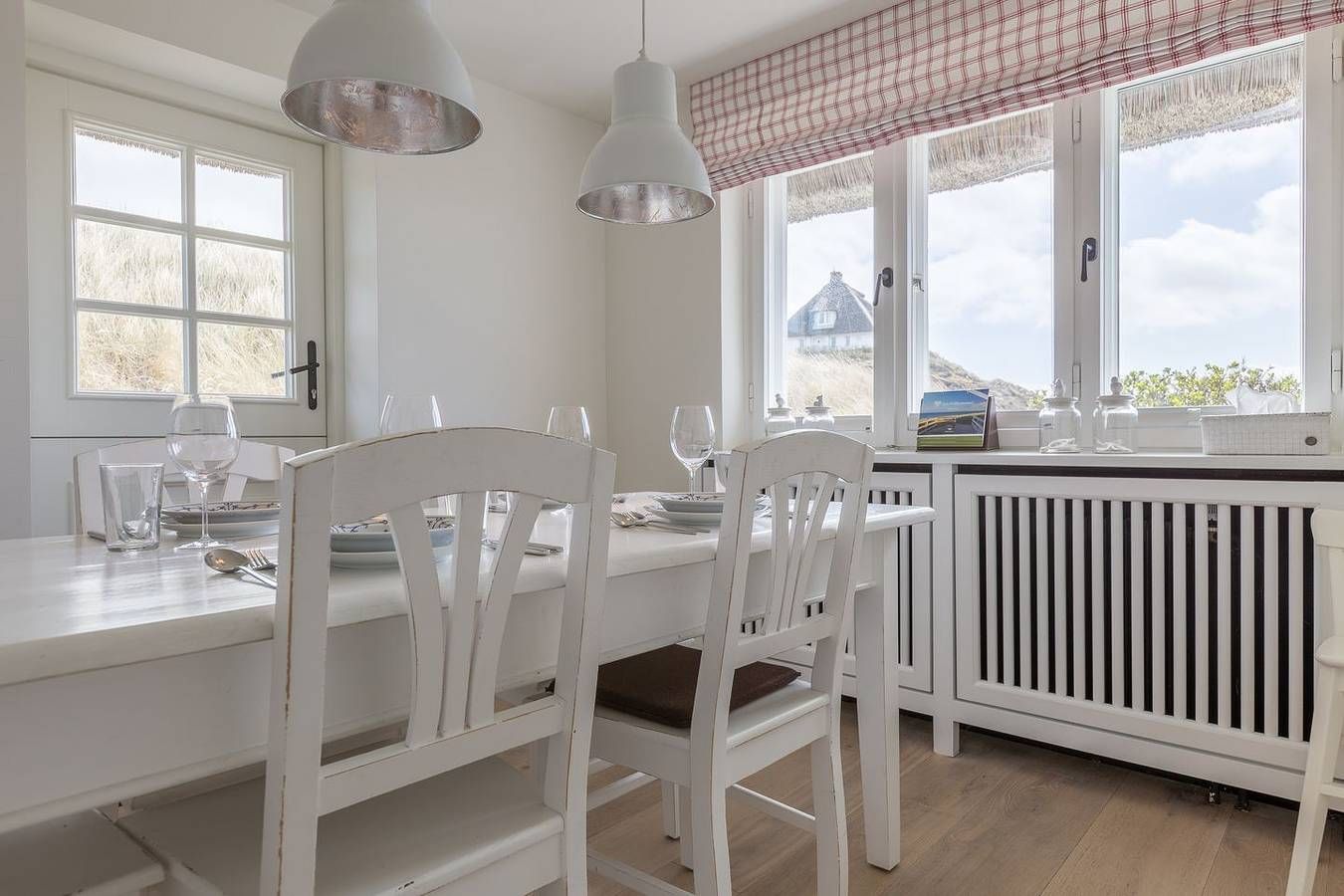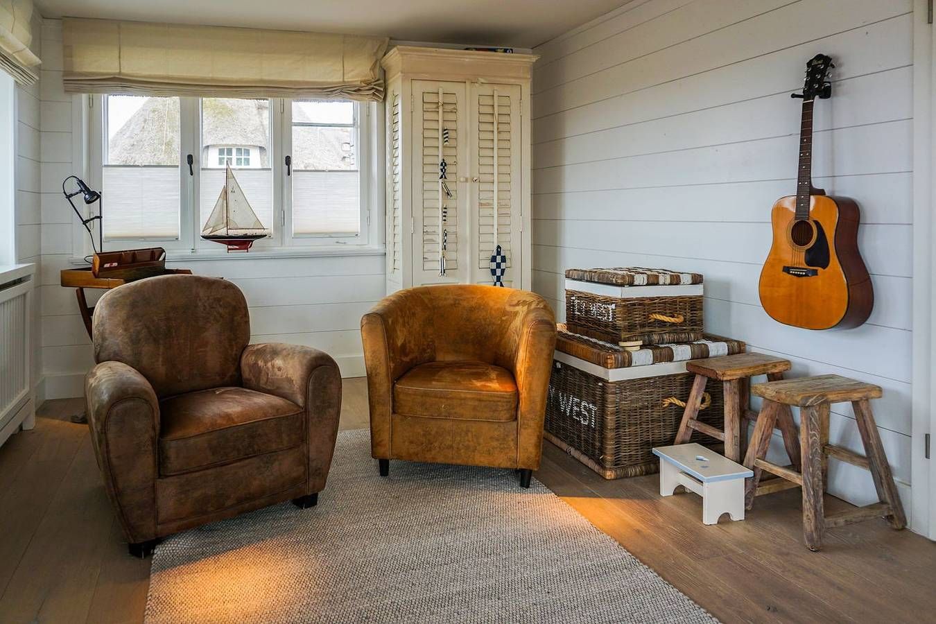 Viel mehr "Sylt pur" als im Sturmnest können Sie inselweit nicht finden. Ein freistehendes Einzelhaus in Hörnum, mit einem Interieur, das eine hervorragender Mix aus modernstem Design, hohem Kuschelfaktor und Sylt-Romantik ist. Durch einen kleinen Dielenbereich mit Gäste-WC erreichen Sie Ihren sehr hochwertig und geschmackvoll eingerichteten Wohnbereich mit gemütlichen Sitzgelegenheiten und elektrisch ausfahrbarem Flatscreen-TV. Ihre großzügige und luxuriöse Wohnküche bildet das Herz Ihres Domizils. Hier lässt es sich mit einer fantastischen Küchenausstattung wunderbar kochen und an der gemütlichen Sitz- und Essecke verweilen. Der Außenbereich des Hauses bietet Ihnen weitere Highlights – entspannen Sie auf einer der möblierten Terrassen mit Meerblick oder genießen Sie die Außendusche mit Relax-Faktor. Im Obergeschoss des Hauses erwartet Sie ein Masterbedroom mit benachbartem Tageslichtbadezimmer mit kombinierter Badewanne und Dusche, einem Doppelwaschtisch sowie einem WC. Ein weiterer Schlafbereich auf dieser Ebene ist ein wahres Kinder-Eldorado mit drei Einzelbetten. Ein Kinderhochstuhl und Kinderreisebett sind hier ebenfalls vorhanden. Es handelt sich bei diesem Ferienhaus um ein Nichtraucherdomizil, in dem keine Haustiere erlaubt sind. Einen Parkplatz finden Sie direkt am Haus. Ausstattung: Einzelhaus unter Reet mit Meerblick für bis zu zwei Erwachsene und zwei Kinder auf ca. 100m² Nutzfläche im EG und OG EG: Wohnbereich mit WLAN, ausfahrbarem Flatscreen-TV, CD-Player, Telefon, Radio, DVD/Blu-Ray Player, separate Küche mit Backofen, Wasserkocher, Filterkaffeemaschine, Induktionskochfeld, Geschirrspülmaschine, Toaster, Nespresso Maschine, Gäste-WC, Terrasse und Garten mit Möblierung (ca. April – Oktober) OG: Masterbedroom mit Doppel-Boxspringbett (180x200), Badezimmer mit kombinierter Badewanne mit Dusche, Waschtisch und WC, weiterer Schlafbereich mit zwei Einzelbetten (90x200)- sowie ein weiteres Einzelbett (90x180), Kinderstuhl und Kinderreisebett vorhanden