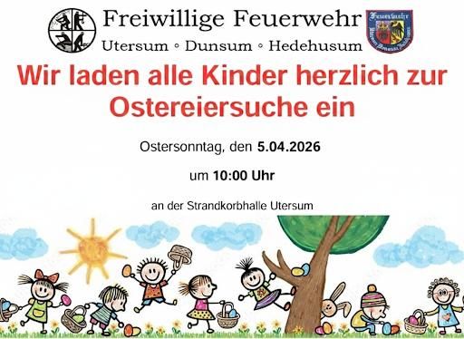 Sonntag, 05.04.2026UtersumDie freiwillige Feuerwehr Utersum-Dunsum-Hedehusum lädt alle Kinder und Familien herzlich zum Ostereiersammeln ein! Kommt vorbei und sucht nach bunten Ostereiern, die im Gelände versteckt sind.
