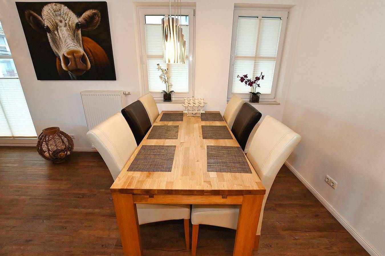 Willkommen im Bernstein Mare Luxor Penthouse 01, einem exquisiten Rückzugsort, der Ihnen höchsten Komfort und eine erstklassige Lage im bezaubernden Büsum bietet. Auf großzügigen 115 m² erwartet Sie ein modernes Apartment, das sowohl durch seine stilvolle Ausstattung als auch durch seine angenehme Atmosphäre besticht. Das Penthouse ist ideal für Familien oder Gruppen von bis zu vier Personen, die einen erholsamen Urlaub an der Nordsee verbringen möchten. Seine hervorragende Lage macht das Penthouse zu einem beliebten Ziel für Strandliebende. Nur 50 Meter trennen Sie vom Meer, sodass Sie die frische Nordseeluft in vollen Zügen genießen können. Darüber hinaus befinden sich Einkaufsmöglichkeiten, Restaurants und weitere Annehmlichkeiten nur 350 Meter entfernt, sodass Sie alles Wichtige schnell erreichen können. Zusätzliche Bequemlichkeit bieten Bahnhof und ärztliche Versorgung, die ebenfalls in der Nähe zu finden sind und die Sie bei Bedarf in wenigen Minuten erreichen. Das Penthouse verfügt über zwei Schlafzimmer, die mit komfortablen Betten ausgestattet sind und den idealen Rückzugsort nach einem aufregenden Tag am Strand bieten. Bei Bedarf kann auf ein Hochbett zurückgegriffen werden, um auch jüngeren Gästen eine entspannte Nachtruhe zu ermöglichen. Ein geräumiges Badezimmer mit zwei Duschen und modernem Komfort ist ebenfalls vorhanden. Besonders hervorzuheben ist der offene Wohnbereich, der mit einer durchdachten Küchenzeile ausgestattet ist. Hier finden Sie alles, was Sie für die Zubereitung schmackhafter Mahlzeiten benötigen: Vom Kühlschrank über den Backofen bis hin zur Spülmaschine und den Küchenutensilien ist alles vorhanden. Ein großzügiger Esstisch bietet ausreichend Platz für gesellige Runden mit Ihren Liebsten. Der Wohnbereich bietet nicht nur einen herrlichen Blick ins Freie, sondern auch eine gemütliche Sofaecke, die zu entspannten Abenden mit einem guten Buch oder einem Film auf einem der drei verfügbaren Fernseher einlädt. Für zusätzlichen Komfort sorgen die vorhandene Internetverbindung sowie das Radio. Ein weiteres Highlight des Bernstein Mare Luxor Penthouse 01 ist der Balkon, von dem aus Sie den Blick auf die Umgebung genießen können. Dieser lädt ein, die frische Nordseeluft zu genießen oder einfach nur zu entspannen. Zutritt zur Unterkunft erhalten Sie bequem über den vorhandenen Aufzug, wodurch das Penthouse auch für Gäste mit eingeschränkter Mobilität gut zugänglich ist. Das Penthaus ist für Gäste mit Allergien geeignet. Rauchen ist nicht gestattet. Darüber hinaus sind Kinder herzlich willkommen, sodass Familien unbeschwerte Urlaubstage verbringen können. Verpassen Sie nicht die Gelegenheit, in diesem einmaligen Penthouse in Büsum zu wohnen. Hier erwartet Sie ein Ort der Ruhe und Erholung, der alle Annehmlichkeiten bietet, die Sie für einen unvergesslichen Aufenthalt an der Nordsee benötigen. Sicher freuen Sie sich darauf, die Vorteile einer zentralen Lage mit einem komfortablen, gut ausgestatteten Rückzugsort zu kombinieren. Sichern Sie sich Ihren Aufenthalt und genießen Sie entspannte Tage in der Küstenstadt Büsum.
